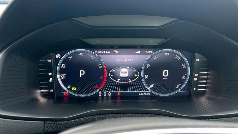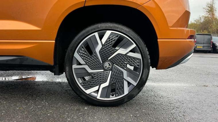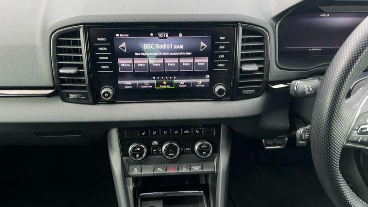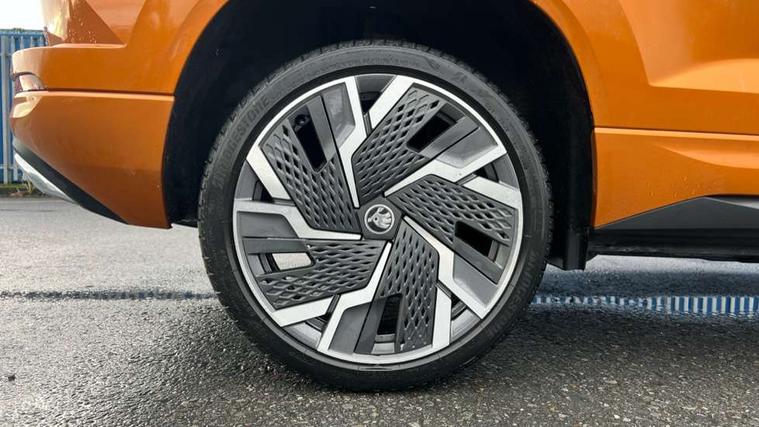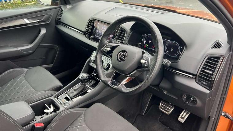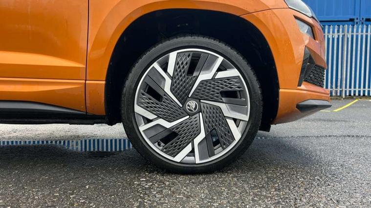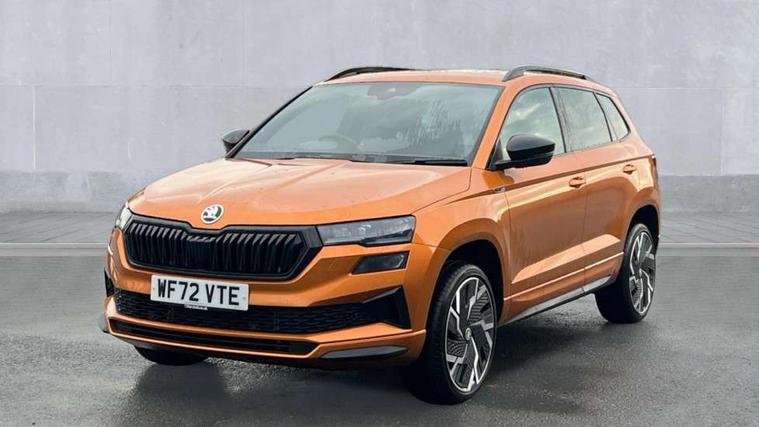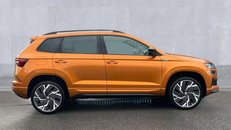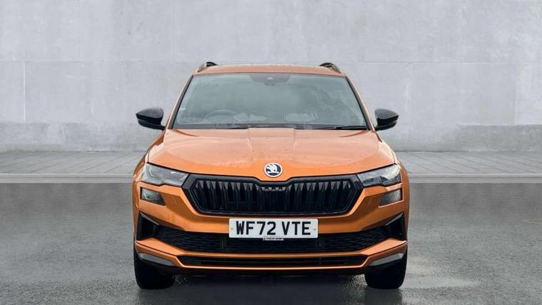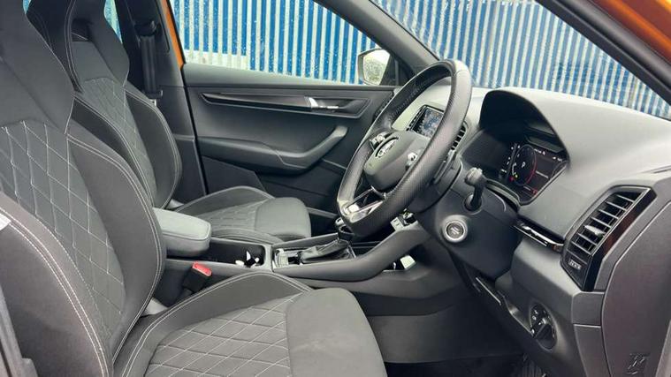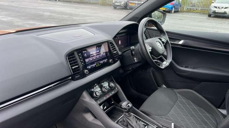 8" Digital display, Care connect, Driver fatigue sensor, Emergency services call system, Outside temperature gauge, Service interval indicator, SmartLink wireless for Apple and wired for Android, Start/stop system with regenerative braking, USB C Port x 2 in front centre console, Virtual pedal with electrically operated boot door, 8 Speakers, DAB radio with Bluetooth, USB connection, Acoustic glass, Aero front windscreen wipers with intermittent function, Auto dimming rear view mirror with light and rain sensors, Black door mirrors, Black electric window control buttons, Black radiator grille, Black roof rails, Body colour door handles, Dynamic headlight range control with cornering light function, Electric front and rear windows with child proof lock, Front door steps with SportLine logo, Heated rear windscreen, LED daytime running lights, LED rear lights with high functionality welcome effect and dynamic indicators, Light assistant (coming/leaving home/tunnel light), Panoramic sliding sunroof, Plastic scuff plates, Privacy glass, Protective door side sills in body colour, Rear diffuser, Rear side wing doors, Rear spoiler, Rear window wiper with washer system and intermittent control, Safety reflectors on front doors, Skoda lettering on tailgate in black, Sportline badge on front fender, Sportline decorative inserts with badging, Sports front and rear bumpers, 1.5 litre bottle holders in driver and front passenger door panels, 12V socket in boot, 12v socket in front centre armrest with storage compartment and rear air vents, 2 Folding hooks and nets in boot, 3 rear height adjustable headrests, 3 seat bench in 2nd row, 3 spoke leather sports multifunction steering wheel and silver stitching with gear shift paddles, 4 foldable roof handles with rear coat hooks, Black floor carpet, Black roof headlining, Chrome inner door handles, Double sided boot floor, Foldable hooks in the boot, Front head restraints, Height adjustable front three point seats belts with tensioners, Height/reach adjust steering wheel, Ice scraper, Illuminated glovebox, Illuminated luggage compartment, Isofix child seat preparation outer rear, Manual lumbar support for front seats, Pen holder, Pollen filter, Rear boot cover, Rear reading lights, Rear seats fixed folding and divided 60:40, Rubbish bin door, Safety vest holder, Single front passenger seat, Storage box in upper central dashboard closed, Sunvisors with illuminated vanity mirrors, Textile floor mats, Ticket holder, Titan black interior ceiling, Welcome animation with sportline logo, Light Pack - Karoq, Parking pack - Karoq, Automatic door unlocking in case of crash, Automatic fuel cut off in case of crash, Child locks on rear doors, Driver airbag, Electronic parking brake with auto hold function, Emergency rear braking signal, ESC including ABS, MSR, ASR, EDS, HBA, DSR, RBS, MKB and traction control, Front side airbags, Hill hold control, Knee airbags, Passenger airbag with switch-off function, Pedestrian monitor, Seatbelt reminder signalisation and pretensioner for all seats, Three point seatbelts rear, Two tone horn, Tyre pressure display, Tyre pressure monitor, Alarm with interior monitoring, back up horn and tilt sensor with safe function, Electronic engine immobiliser, Keyless entry and start/stop, Remote central locking with 2 remote folding keys, Black air vent surround, Black centre console, Satin black dashboard, Satin black door trim, 19" Vega black polished alloy wheels, Anti-theft wheel bolts protection, Matt black aero hub caps, Storage on wheel cover, Tool kit,