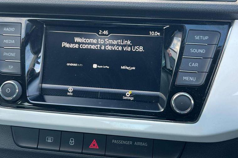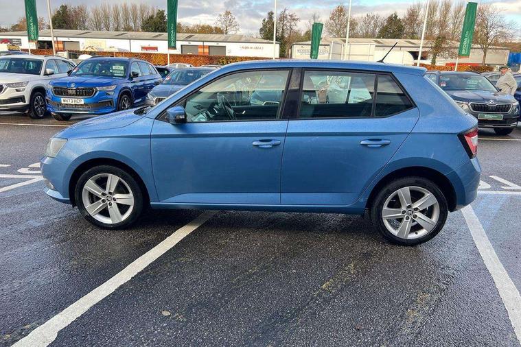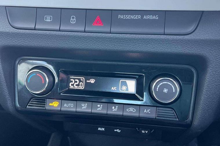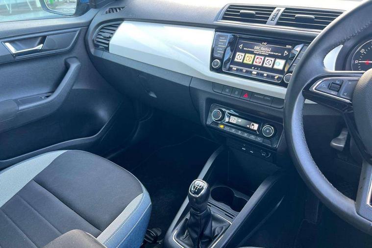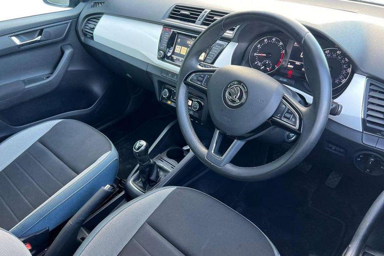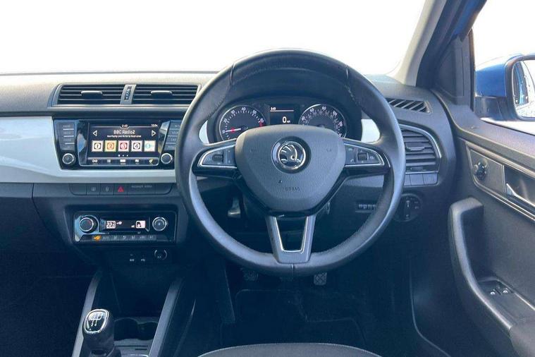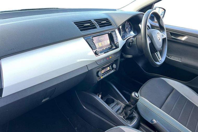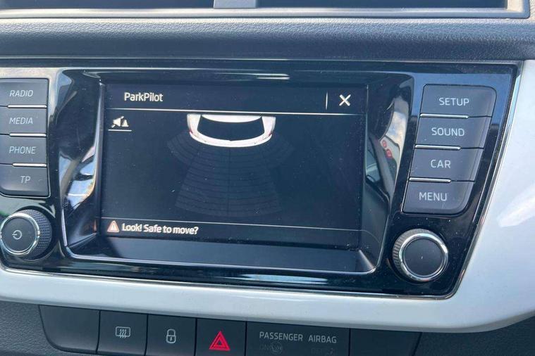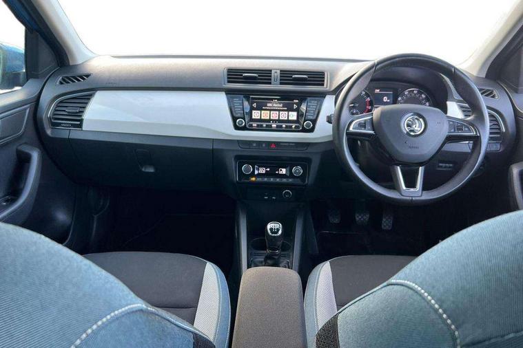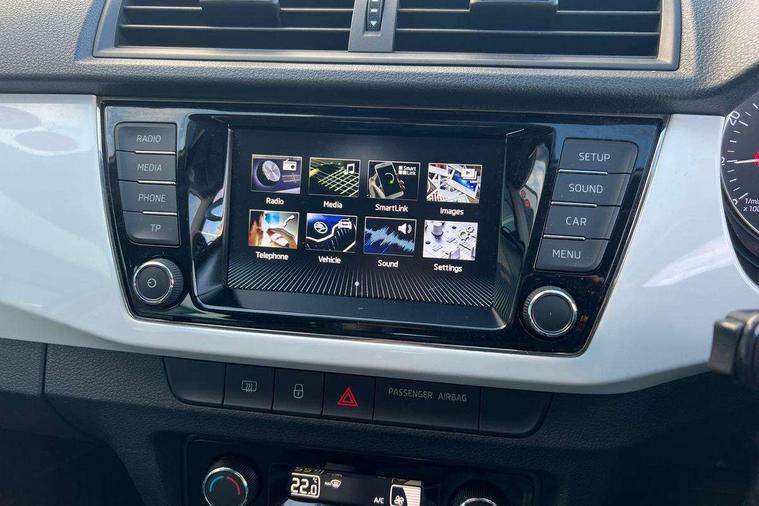 Arkamys surround sound pack - Fabia, Chrome Pack - Fabia, Alarm with interior monitoring, Immobiliser, Locking wheel bolts, Remote central locking, 6.5" touchscreen, Auxiliary socket for external MP3 player, Bolero Radio, DAB Digital radio, SD card slot, USB interface, 3x3 point rear seatbelts, ABS, Curtain airbags, Driver and passenger airbags, Driver and passenger side airbags, EDS, ESC with ASR, Front seatbelt pretensioners, HBA (Hydraulic Brake Assist), Passenger airbag deactivate switch, Seatbelt warning, Tyre pressure monitor, Body colour bumpers, Body colour door handles, Chrome grille surround, Electric front windows, Electrically adjustable and heated door mirrors, Heated rear window, Height adjustable headlamps, Intermittent rear wash/wipe, LED daytime running lights, Tinted rear windows, Tinted windscreen, 1.5L bottle holder in front door panels, 2 height adjustable rear headrests, 60/40 split folding rear seat, Boot stowage box, Cargo area storage tray, Climate control air conditioning, Driver + passenger vanity mirrors, Folding grab handles, Front centre armrest, Front reading lights, Front/rear floor mats, Height adjustable driver's seat, Height adjustable front headrests, Height adjustable passenger seat, Height/reach adjust steering wheel, Interior light with delay, Leather gearshift, Leather handbrake, Lower glovebox cover, Luggage load hooks, Parcel shelf, Pollen filter, Rear courtesy light, Rear storage trays, Ticket holder, Two rear outer seat isofix location points, Umbrella under front passenger seat, Bluetooth system, Exterior temperature gauge, Front assistant collision mitigation, Multi function trip computer, PAS, Service interval indicator, SmartLink,
