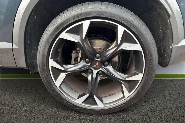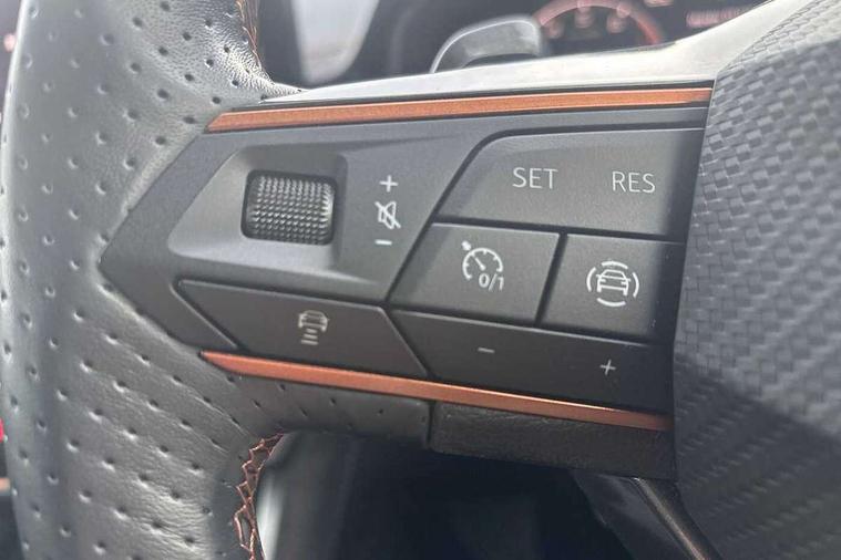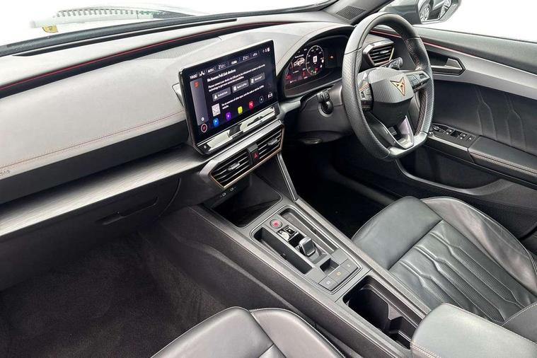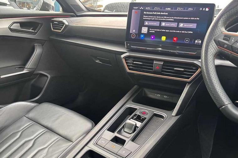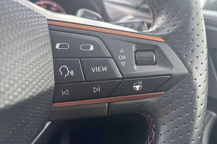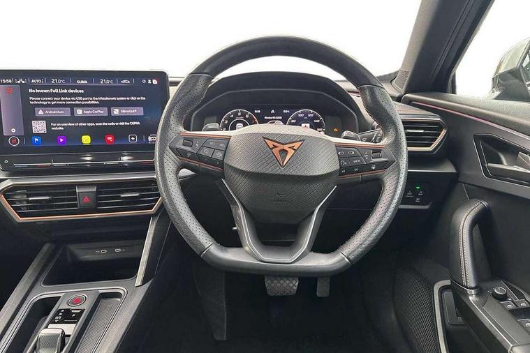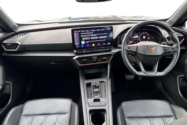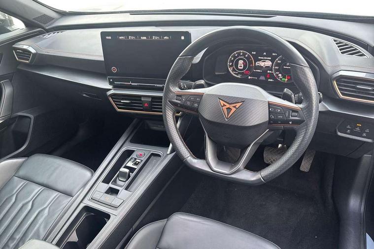 Digital cockpit and configurable dashboard, Driver alert system, Driving profile selection, Forward collision warning with automatic braking, Lane assist, Navigation system with 12'' Touchscreen Display, Park assist (inc front/rear parking sensors), PAS, Predictive adaptive cruise control with speed limiter, Rear view camera, RPM, trip computer, outside temp gauge, instrument light brightness, low fuel warning light, lights on reminder, gearshift indicator, Service interval indicator, Start/stop system with regenerative braking, Voice control system, Wireless apple carplay, Wireless phone charger, Electronic locking differential and dynamic traction support, Standard suspension, 2 front and 2 rear USB type C sockets, Auxiliary input socket, DAB radio, Auto dimming rear view mirror, Body colour door handles, Body coloured bumpers, Dark grey wing mirror, Daytime running light with automatic headlight control and coming home feature, Dynamic headlight range control, Electric front/rear windows, Electrically adjustable heated and folding door mirrors with memory function, Front fog lamps with cornering function, Gloss black roof rails and window surrounds, LED Headlights, LED Taillights with dynamic indicator, Rain sensing wipers, Rear diffuser with black simulated exhaust pipes, Rear side wing doors, Rear wash/wipe, Third brake light, Tinted rear windows, Welcome lights, 12v power supply in centre console, 12V socket, 12v socket in loadspace, 2 front and 2 rear reading lights, 230V socket, 3 seat bench in 2nd row, 60/40 split rear bench seat with armrest and mechanical seat release, Black headlining, Dust/pollen filter, Front and rear head restraints, Front centre armrest, Height/reach adjust steering wheel, Illuminated interior front door sills, Illuminated sunvisor with mirror, Isofix, Leather multi function heated steering wheel with gear shift paddles, Luggage tie-down hooks, Single front passenger seat, Three zone climate control with control panel in rear, Variable luggage/load compartment floor, Wraparound lighting, Genuine Nappa leather Pack - Cupra, 3 point seatbelts on all rear seats, ABS, Brake control system - ESC and brake booster, Child proof door locks, Driver and front passenger airbags with front passenger airbag de-activation, Electronic parking brake, Front and rear disc brakes, Front side curtain airbags, Hill hold control, Public e-call, Seat belt reminder for front and rear seats, Tyre pressure monitoring system, Anti theft alarm system, Keyless entry and start system (KESSY), Locking wheel bolts, Copper and aluminium interior detailing, 19" 'Exclusive' machined sport matte black and silver alloy wheels,