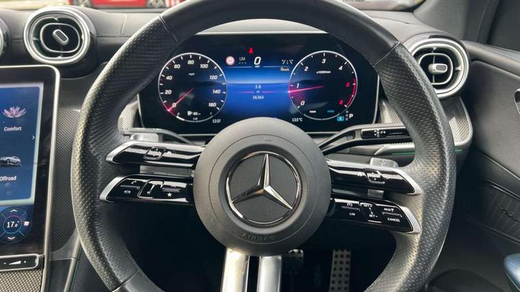 11.9" high resolution multimedia colour display, 12.3" Digital individually configurable instrument display, Acoustic presence indicator, Active lane keeping assist, Attention assist, Blind spot assist, Collision prevention assist plus, Cruise control with speedtronic variable speed limiter, Direct steer speed sensitive steering, DYNAMIC SELECT with a choice of driving modes (ECO, Comfort, Sport, Sport+ and Individual), Easy pack automatic powered tailgate, eCall emergency call system, ECO start/stop function, Fingerprint scanner, Fluorescent jacket for driver, Hard disk navigation, Instrument display in miles with English lettering, MBUX augmented reality for navigation, MBUX navigation premium, MBUX voice control activated by keywords "Hey Mercedes", Mercedes me connect, Outside temperature display, Remote boot release, Remote services, Road sign recognition system, Service indicator (ASSYST), Smartphone integration, Status display for rear seat belts in instrument cluster, Traffic sign assist, Wireless charging, 48V Mild hybrid technology, 4MATIC permanent four wheel drive, 62 litre fuel tank, 9G TRONIC plus automatic transmission, Diesel particulate filter, Sport suspension, DAB digital radio tuner, MBUX extended functions, Mercedes benz sound system, USB ports x 2 USB C ports in centre console, Adaptive high beam assist plus, Aluminium look running boards with rubber studs, Aluminium roof rails, AMG bodystyling front apron, rear apron and side skirts, AMG Line exterior, Auto headlights, Body colour bumpers, Digital light LED headlights, Electrically adjustable door mirrors, Front and rear electric windows, Headlight washers, Heat and noise insulating acoustic glass, Heat insulating dark tinted glass, Heated door mirrors, Heated rear window, Integrated LED daytime running lights, LED indicator lights, LED rear fog lights, LED tail lamp, LED third brake light, Radiator grille with Mercedes Benz pattern and integreated Mercedes star and louvre in dark grey matt with chrome inlay and black frame, Rain sensor windscreen wipers, Rear side wing doors, Rear wiper, Transparent Bonnet, Two chrome plated tailpipe trim elements, Welcome and follow-me home light functionality, Wider wheel arch for AMG wheels, 3 seat bench in 2nd row, 40:20:40 split folding rear seats, Ambient light in 64 colour with dynamic multicolour LED interior lightings, AMG line interior, AMG sports seats, Automatic child seat recognition sensor, Black fabric roof lining, Black floor mats with AMG lettering, Double cup holder in centre console, Easy-pack removable load compartment cover, Electrically height/reach adjustable steering column, Front centre armrest with stowage compartment, Front head restraints, Galvanised steering wheel gearshift paddles, Heated front seats, Illuminated door sill panels with Mercedes Benz lettering, Illuminated glove compartment, Instrument panel and beltlines in Artico man made leather in nappa look, Multi function steering wheel with audio and onboard settings control, Multifunction sports steering wheel in nappa leather, Rear centre headrest, Rear head restraints, Rear top tether child seat ISOFIX attachment, Single front passenger seat, Sports pedals with stainless steel surfaces and rubber studs, Steering wheel with audio and onboard settings control, Sun visors, THERMATIC 2 zone automatic climate control, Anti theft protection package - GLC, Boot comfort package - GLC, Exterior chrome package - GLC, Interior chrome package - GLC, Interior lighting pack - GLC, Memory pack - GLC, Mirror pack - GLC, Parking package with 360 degree camera - GLC, Seat comfort package - GLC, Stowage space package - GLC, USB Package - GLC, 3 rear 3 point seatbelts, Active braking assist, Anti-lock braking system (ABS), ASR traction control, Automatic front passenger airbag deactivation, Black seat belts, Brake calipers with Mercedes-Benz lettering + perforated brake discs, Braking system with larger brake discs on the front axle, Child proof door locks, Dual-stage airbags - driver and front passenger, driver knee bag and window bags for driver, front passenger and rear passengers, Electronic parking brake, Electronic stability programme (ESP) with curve dynamic assist and cross wind assist, Front and rear seatbelt reminder, Front seatbelt pretensioners, Hill start assist, Tyre pressure monitoring system, 360 degree guard vehicle protection plus, Anti theft alarm system with preinstallation for collision detection, Dashcam, Immobiliser, Keyless Go entry and starting function, Centre console in metal structure finish, Metal structure trim, 20" AMG 5 spoke aerodynamically optimised light alloy wheels in painted black with high sheen finish, Summer tyres, TIREFIT with tyre inflation compressor,