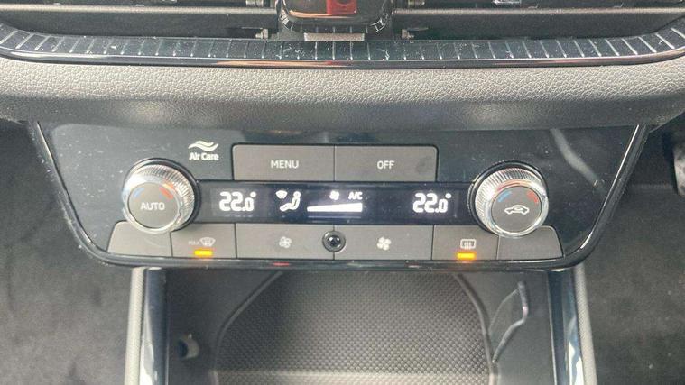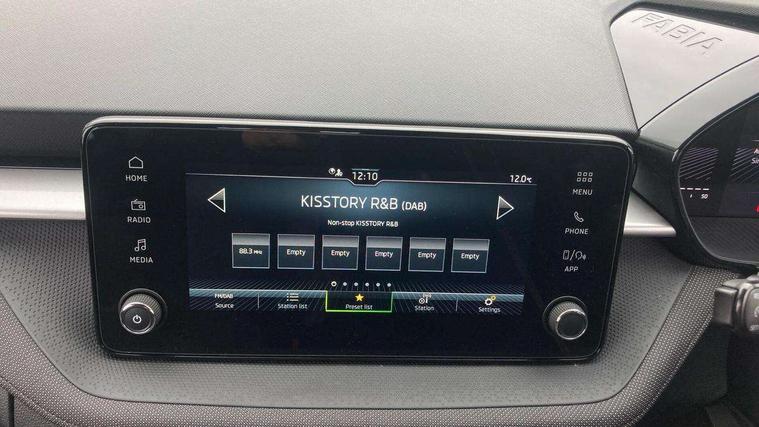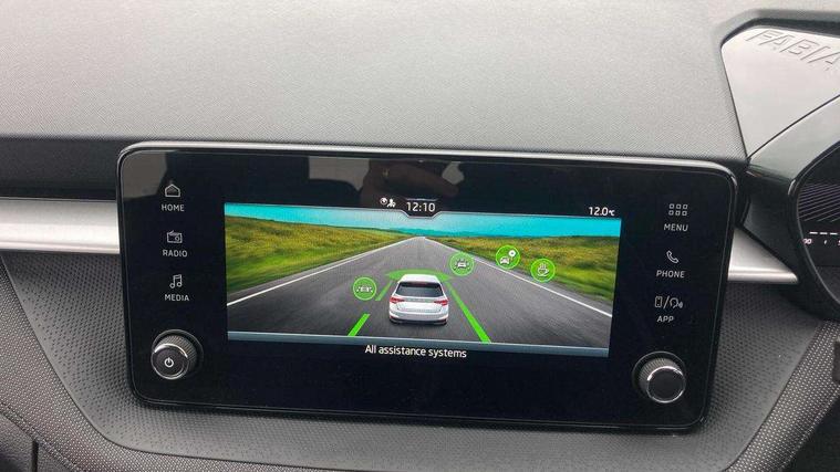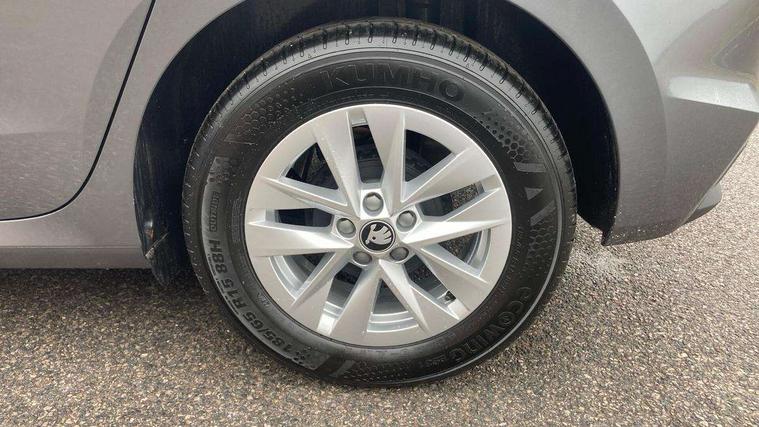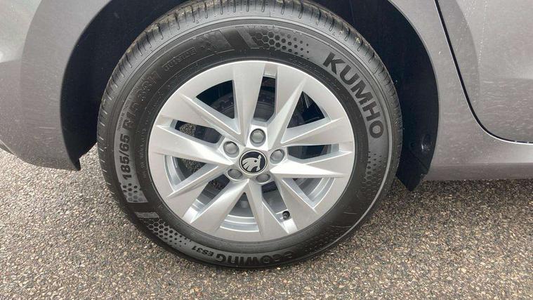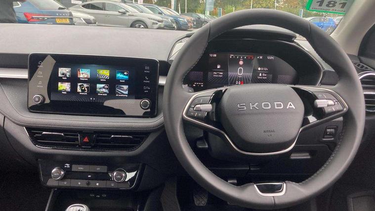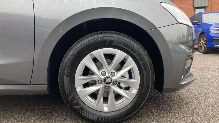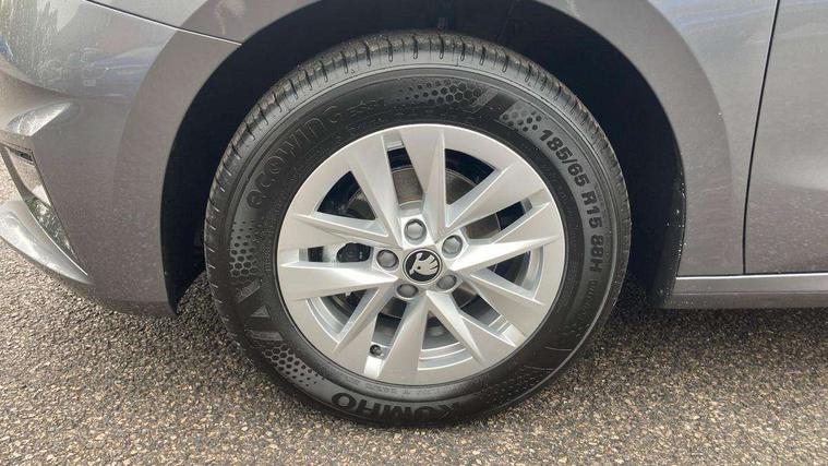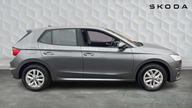 8" Digital instrument display, Advanced driver attention and drowsiness monitor, Bluetooth connection, Cruise control with speed limiter, Driver alert system, Electromechanical power steering, Exterior temperature gauge, Lane assist including road edge detection, Rear parking sensors, Service interval indicator, Traffic sign recognition, Wireless SmartLink for Apple CarPlay and Android Auto, 6 Speakers (4 in front and 2 in rear), 8.25" Skoda infotainment touchscreen display, Auxiliary socket for external MP3 player, DAB digital radio reception, Auto dimming rear view mirror, Body colour door mirrors, Body coloured bumpers, Door mirror integrated indicators, Front and rear electric windows, Front window wiper intermittent control, Headlight range control - Automatic, Ice scraper in fuel cap, LED 3rd brake light, LED daytime running lights with coming and leaving home feature, LED rear lights, Rear LED fog light, Rear side wing doors, Rear window wiper with washing nozzles, Roof mounted spoiler, SKODA tailgate lettering in chrome, Unique dark chrome design logo on alloy wheels, 2 reading lights in front and 2 reading lights in rear, 3 rear headrests, Backrest split and folding, Central console with removable cup holder and storage box, Chrome handbrake release button, Dual zone air conditioning with climatronic electronic control, Fabric upholstery, Front centre armrest, Gearshift knob/handle in leather, Grain satin black interior door handles, Hand brake lever handle in leather, Height adjustable front headrests, Height adjustable front seats, Height adjustable steering wheel, ISOFIX and TopTether anchorage points to the outer rear seats, ISOFIX and TopTether on the front passenger seat, Luggage compartment lighting, Manually adjustable lumbar support in front seats, Pollen filter, Rear seat bench unsplit, Single front passenger seat, Skoda lettering on steering wheel, Storm grey headlining, Sun visors with mirror and airbag label on passenger side, Textile floor mats, Ticket holder, Umbrella in drivers door, Ambient lighting pack - Fabia Hatchback, 3-point height adjustable front seats belts with pretensioner and force limiter, Automatic warning lights in case of crash, Driver and passengers airbag with switch off function, e-Call+, ESC including ABS, MSR, ASR, EDS, HBA and XDS, Front and rear seat belt warning, FRONT ASSIST (AEB City and AEB Inter Urban), Front side airbags, Head airbags, One tone horn, Pedestrian protection, Three rear 3-points safety seat belts with pretensioner and force limiter including stop function for outer rear seat belts, Tyre pressure monitoring system, Anti-theft alarm system including immobiliser, interior monitoring, backup horn, and towing protection, Central locking with radio remote control, interior controls, SAFE function and 2 foldable keys, KESSY - Keyless engine start/stop, Black painted air vents, Grain satin black central console cover, Metallic grey upper decorative trim, Satin black door and side trim panel in front, Textile Kota grey lower decorative inserts, Anti-theft wheel bolts protection, Super-low rolling resistance tyres,