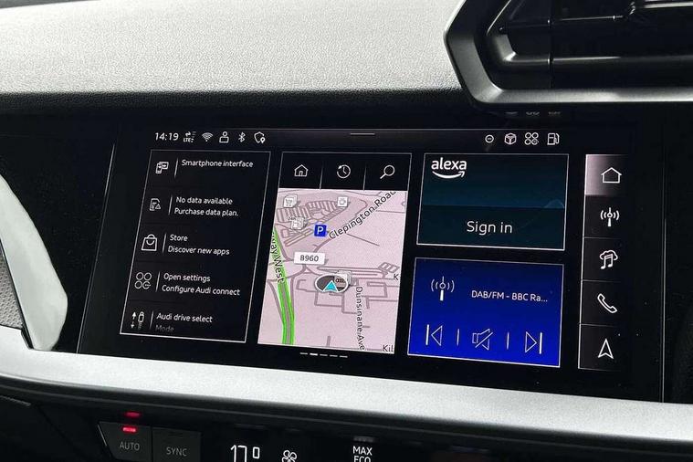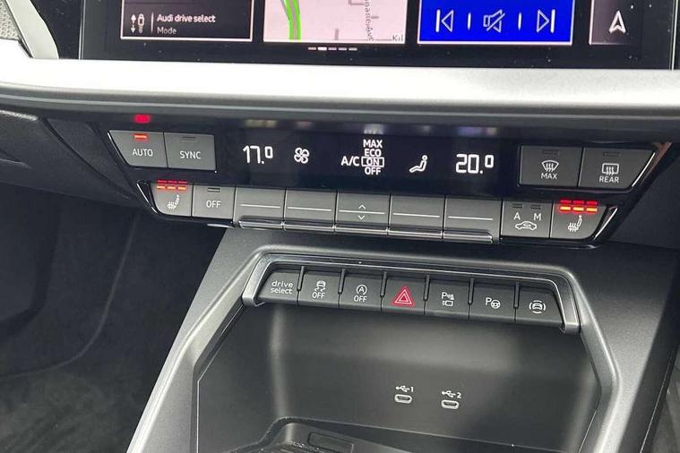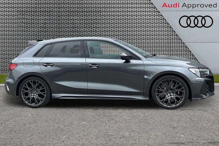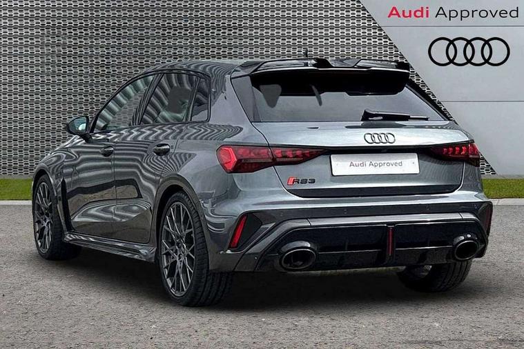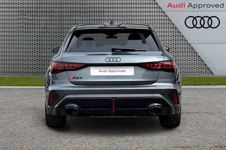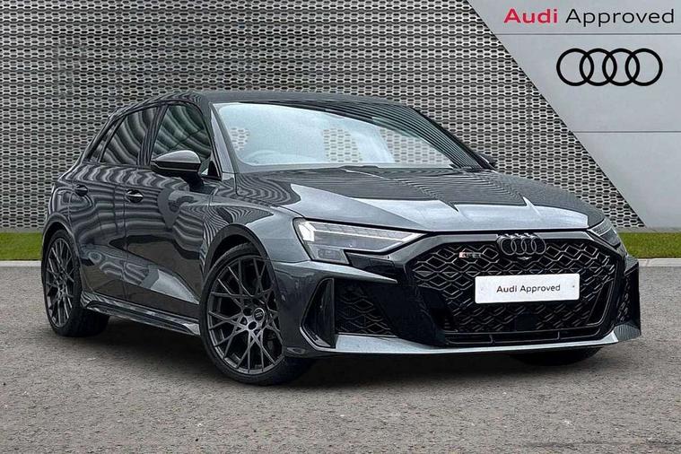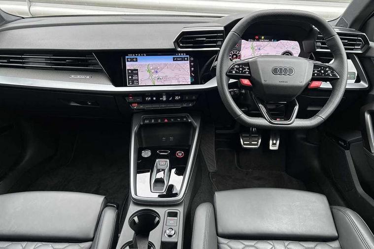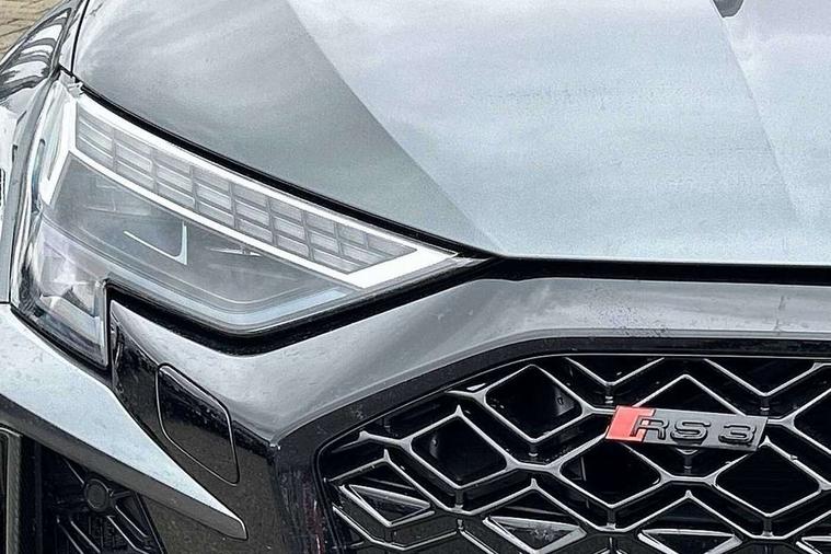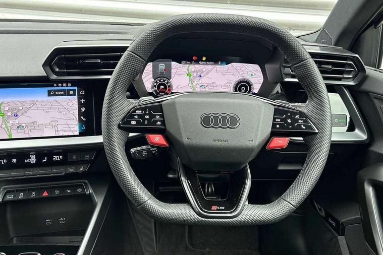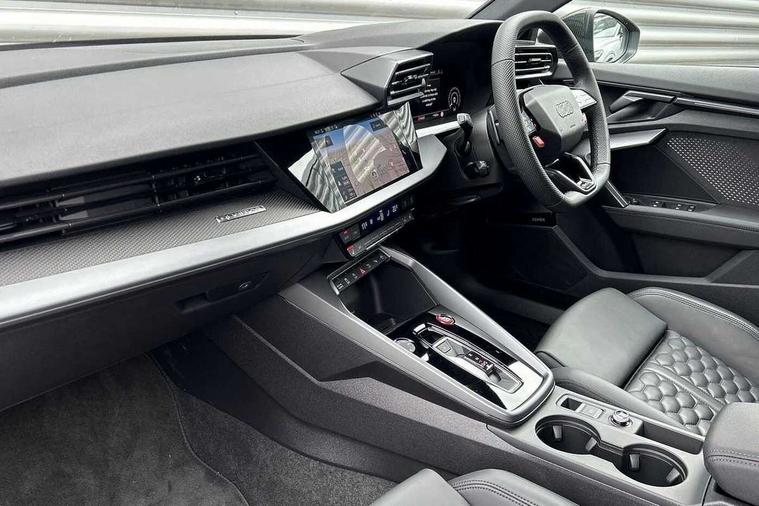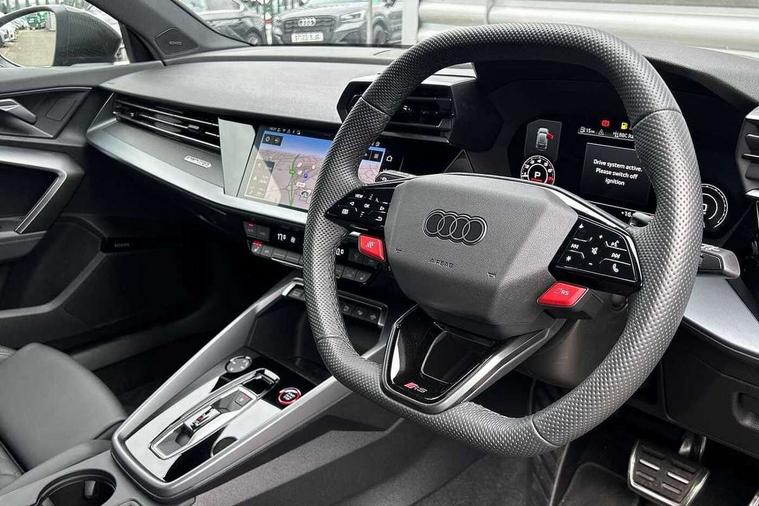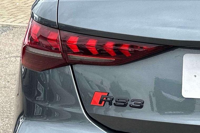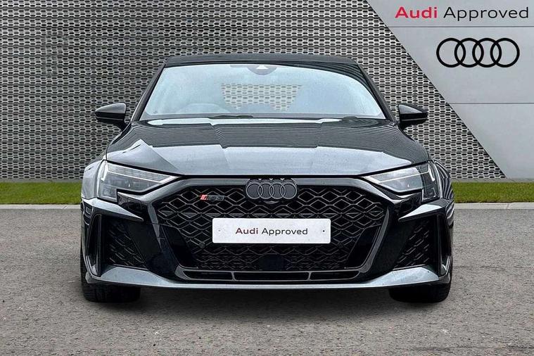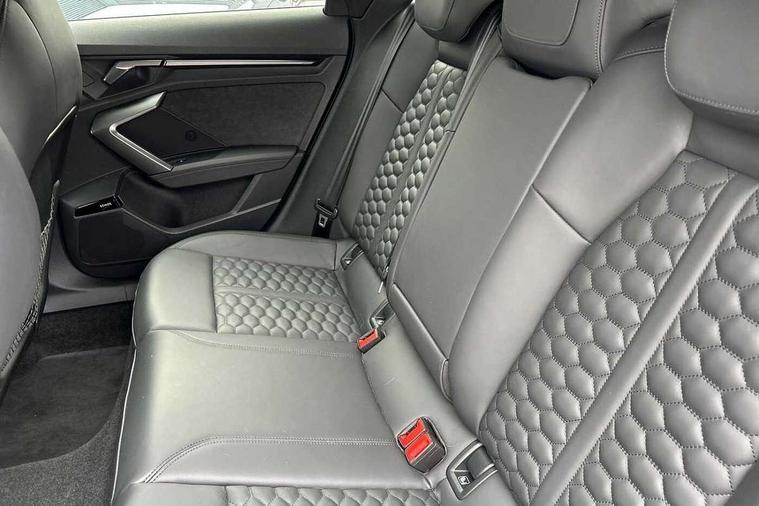 Adjustable speed limiter, Audi drive select comfort, auto, dynamic and efficiency, Audi smartphone interface with app store includes wireless Apple carplay, Android auto and Amazon alexa integration, Audi virtual cockpit plus with RS specific design and 12.3" display with additional graphic display options, Automatic start/stop system with recuperation, Bluetooth interface, Camera based traffic sign recognition, Collision avoidance assistant, Distraction and Fatigue warning, e-Call (emergency call), Lane departure warning system, MMI Navigation Plus with high resolution 10.1" colour touch screen display, Park Assist with parking system Plus, Progressive steering, RS specific driving modes - RS Individual, RS Performance and RS Torque rear, Voice control system with natural language interaction, Quattro permanent four wheel drive, Audi Phonebox light with wireless charging, DAB Digital radio, USB ports with charging function in the rear, All weather light, Audi beam LED projection of RS logo on ground as you exit, Audi darkened matrix LED headlights with dynamic light sequencing and dynamic indicator, Auto dimming frameless rear view mirror, Automatic dynamic range control, Carbon door mirror housings, Carbon fibre engine cover, Dipped beam, main beam, position light and turning light, Dynamic RS specific light sequencing of the coming home and leaving home function, Electrically adjustable/heated/folding/auto dimming door mirrors with integrated LED indications + kerb view function for passenger side, Exterior model badging, Front electric windows, Headlight cleaning system, Heat insulating glass windscreen, Intersection light, LED 3rd brake light, LED brake lights, LED daytime running x3, LED rear lights with dynamic light sequencing and dynamic indicator, LED rear number plate lights, LED reverse light, LED tail lights, Light and rain sensors, Manoeuvring light, Motorway light, Privacy glass - dark tinted rear window, rear door and side windows, Rear electric windows, Rear side wing doors, Rear wiper, Roof edge spoiler in carbon, RS dual branch exhaust system with two chrome plated oval tailpipe trims, Static Cornering lights, Visually upgraded RS specific daytime running light choice of 4 digital signature in chequered flag design within the headlight, 12V socket and storage compartment in front centre console, 3 seat bench in 2nd row, 3 Spoke flat top and bottomed black leather multi function steering and gear shift paddles, 3-zone deluxe automatic air conditioning, 40/20/40 split folding rear seat bench, Black cloth headlining, Front and rear headrests, Front centre armrest, Front door sill trims with RS 3 logo, Front sports seats RS embossed logo, Front/rear floor mats, Heated front seats, Height and reach adjustable steering wheel, Manual boot compartment lid, Manually adjustable front seats, Rear centre armrest with cupholder, Seat side bolsters, Single front passenger seat, Stainless steel pedals and front footrest in black, Vanadium look - Interior door handles, Door trim, power latching, Air vents, window controls, mirror adjust, rear door lock, Selector lever in centre console, Black Styling plus package - RS3, Extended ambient lighting package Pro with Multi-coloured contour lighting of instrument panel - RS3, RS exterior features pack in carbon and gloss black - RS3, RS sport suspension pack - RS3, Storage package - RS3 Sportback, Technology package without speed limiter - RS3, 3x3 point rear seat belts, Driver and front passenger airbag with passenger airbag deactivation, Electronic Stabilisation Control (ESC) including ABS, ASR and EDL, First aid kit with warning triangle and 2 safety vests, Hill hold assist, Pre-sense front with pedestrian and cyclist detection, RS steel brakes, Seatbelt monitoring, Tyre pressure loss indicator, Anti theft alarm, Anti-theft wheel bolts, Electronically operated child locks, Remote central locking with safelock, Inlays in carbon atlas structure, 19" 10 cross spoke silk matt grey alloy wheels, Tyre repair kit,