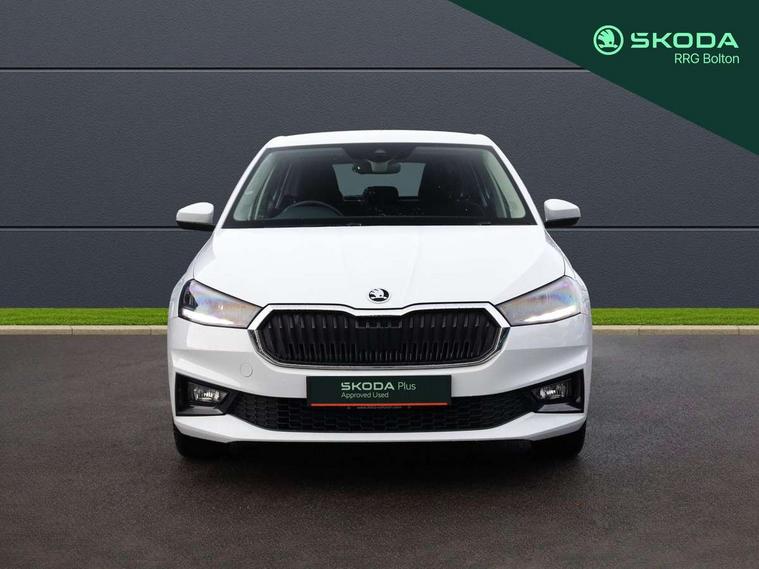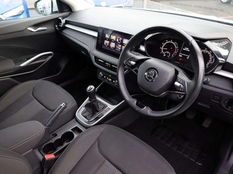 Bluetooth connection, Driver alert system - DAS, Electromechanical power steering, Exterior temperature gauge, Service interval indicator, 2x USB-C in the front (for data transmission and charging), 6 Speakers (4 in front and 2 in rear), Auxiliary socket for external MP3 player, DAB digital radio reception, Web radio, Auto dimming rear view mirror, Basic rear light, Body colour door mirrors, Body coloured bumpers, Chrome window surround, Door mirror integrated indicators, Electrically adjustable and heated door mirrors, Front and rear electric windows, Front window wiper intermittent control, Headlight range control - Automatic, Ice scraper in fuel cap, LED daytime running lights with coming and leaving home feature, Rear LED fog light, Rear side wing doors, Rear window wiper with washing nozzles, Roof mounted spoiler, SKODA tailgate lettering in chrome, Third brake light, 3 rear headrests, Backrest split and folding, Central console with fixed cup holder and storage box, Chrome handbrake release button, Comfort seats, Fabric upholstery, Front centre armrest, Gearshift knob/handle in leather, Hand brake lever handle in leather, Height adjustable front headrests, Height adjustable front seats, Height adjustable steering wheel, ISOFIX and TopTether anchorage points to the outer rear seats, ISOFIX and TopTether on the front passenger seat, Luggage compartment lighting, Manually adjustable lumbar support in front seats, Pollen filter, Rear seat bench unsplit, Removable cup holder, Single front passenger seat, Storm grey headlining, Sun visors with mirror and airbag label on passenger side, Textile floor mats, Ticket holder, Umbrella in drivers door, Ambient lighting pack 2 - Fabia Hatchback, 3-point height adjustable front seats belts with pretensioner and force limiter, Automatic warning lights in case of crash, Driver and passengers airbag with switch off function, e-Call+, ESC including ABS, MSR, ASR, EDS, HBA and XDS, Front and rear seat belt warning, FRONT ASSIST (AEB City and AEB Inter Urban), Front side airbags, Head airbags, One tone horn, Pedestrian protection, Three rear 3-points safety seat belts with pretensioner and force limiter including stop function for outer rear seat belts, Tyre pressure monitoring system, Anti-theft alarm system including immobiliser, interior monitoring, backup horn, and towing protection, Chrome edged air vents, Satin black door and side trim panel in front, Anti-theft wheel bolts protection, Super-low rolling resistance tyres,