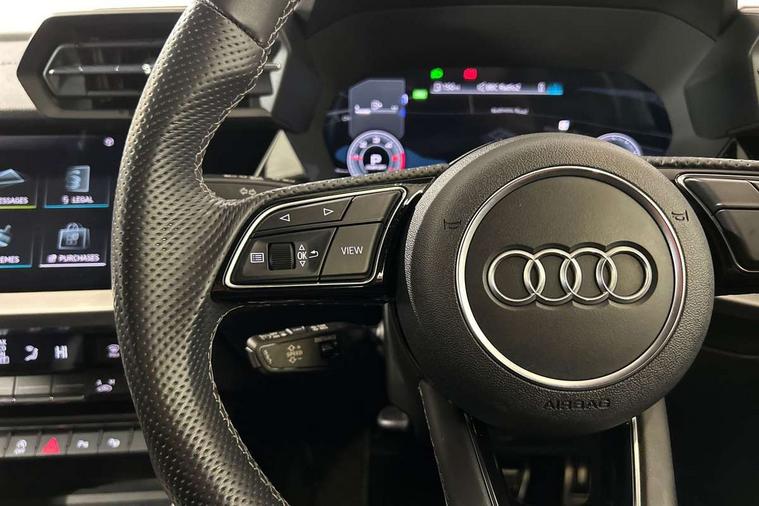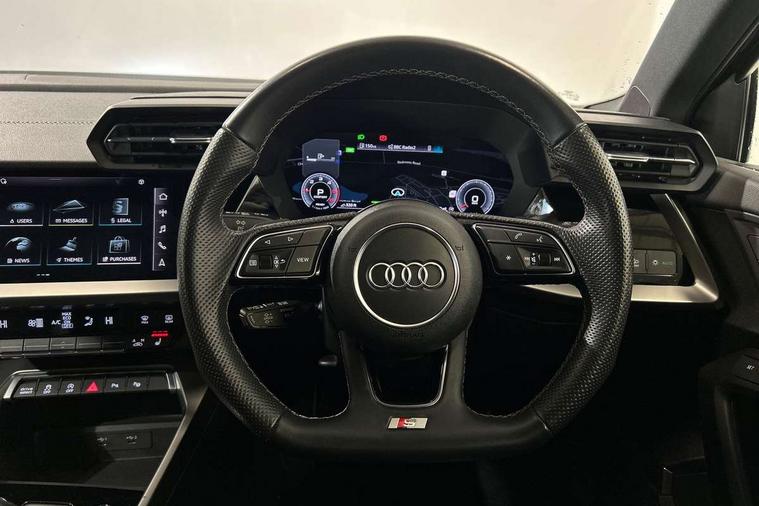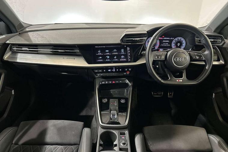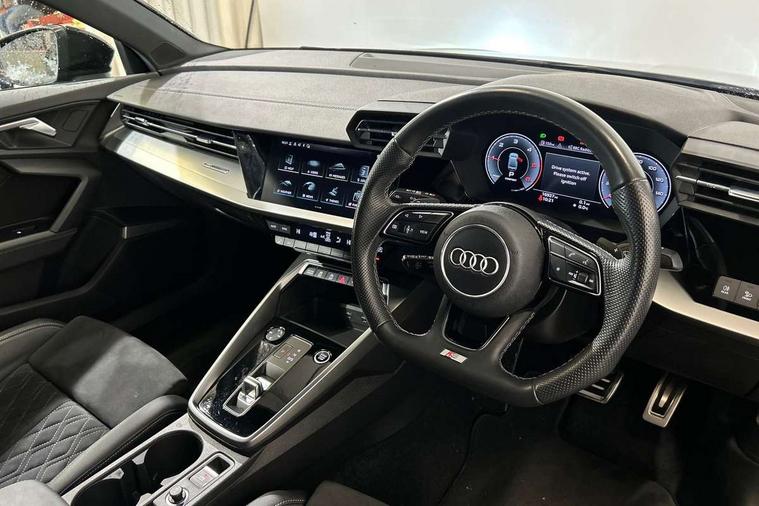 Audi connect emergency call and service, Audi drive select (Auto, Comfort, Dynamic, Efficiency and Individual), Audi smartphone interface, Audi virtual cockpit plus - 12.3" dynamic digital instrument cluster, Automatic start/stop system with recuperation, Bluetooth interface, Collision avoidance assistant, Electromechanical power speed sensitive steering, Lane departure warning system, MMI Navigation Plus with high resolution 10.1" colour touch screen display, Service indicator, Voice control system with natural language interaction, Diesel particulate filter, Sports suspension, 2x USB Type C ports (for charging and data transfer), 6 passive loudspeakers, CD player, DAB Digital radio, 3rd brake light, Acoustic glass windscreen, Audi matrix LED headlights, LED rear lights, dynamic front and rear indicators and headlight cleaning system, Auto dimming frameless rear view mirror, Electrically adj heated/folding + automatically dimming exterior mirrors with memory + automatic kerb side function for passenger side exterior mirror, Front electric windows, Illuminated door sills with aluminium inserts at the front with S logo, Integrated LED indicators in door mirrors, LED daytime running lights, Light and rain sensors, Model and engine designation badges at rear, Privacy glass - dark tinted rear window, rear door and side windows, Rear boot, Rear electric windows, Rear side wing doors, S roof spoiler, 12V socket and storage compartment in front centre console, 3 seat bench in 2nd row, 4 way electrically adjustable lumbar support for driver and front passenger, 40/20/40 split folding rear seat bench with cupholder, Black cloth headlining, Dual zone electronic climate control, Electrically adjustable front seats with memory function for driver's side and exterior mirrors, Front and rear centre armrest in leather, Front and rear headrests, Front/rear floor mats, Heated front seats, Height and reach adjustable steering wheel, Illuminated vanity mirror, Interior lighting - glove compartment light and right hand side, Luggage compartment floor covering, Single front passenger seat, Stainless steel pedals and front footrest in black, Aluminium interior elements pack - A3 Saloon, Dinamica microfibre/mono.pur 550 artificial leather pack - A3 Saloon, Extended ambient lighting pack - A3/S3 Saloon, LED interior lighting pack - A3 Saloon, 3x3 point rear seat belts, Driver and front passenger airbag with passenger airbag deactivation, Electronic Stabilisation Control (ESC) including ABS, ASR and EDL, First aid kit with warning triangle and 2 safety vests, Front side airbags with head airbags and interaction airbag, Hill hold assist, Pre-sense front with pedestrian and cyclist detection, Seatbelt monitoring, Tyre pressure loss indicator, Anti theft alarm, Anti-theft wheel bolts, Electronically operated child locks, Immobiliser, Remote control central locking, Aluminium air vent surrounds, Aluminium trim elements, Dark spectrum aluminium inlays, accent surfaces in the dashboard and centre console in platinum grey silk effect paint finish, 19" 5 arm trapezoid design alloy wheels in titanium matt grey with diamond cut finish,