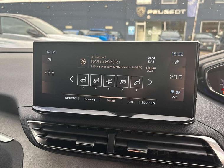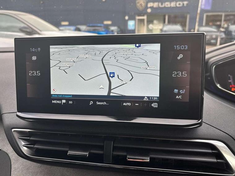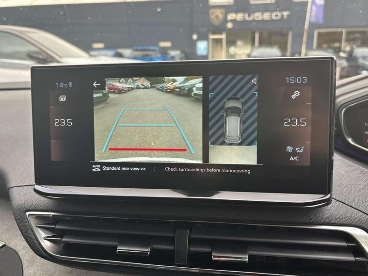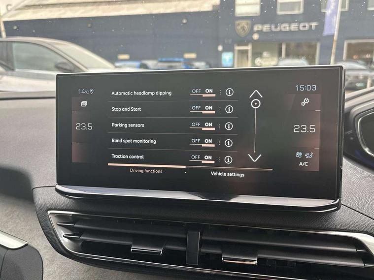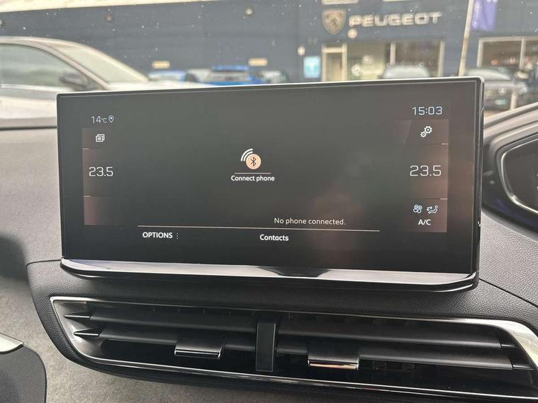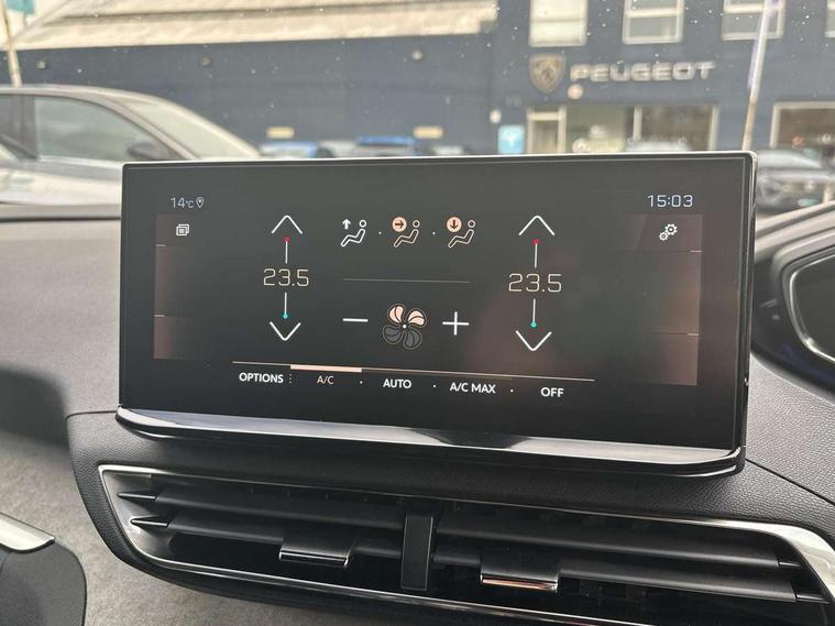 3D connected navigation with 10" HD touchscreen + voice recognition system, Blind spot detection system, Bluetooth telephone facility, Drive modes select (Eco, normal and sport), Driver Attention Alert level 3, Driving Time Warning (DAA1), Emergency services call system, Extended traffic sign recognition, Exterior temperature indicator with ice warning, Lane departure warning system, Lane Keeping Assistance (LKA) with road edge detection, Mirror screen with Apple CarPlay and Android auto, Multi function trip computer, PEUGEOT i-Cockpit with compact sports steering wheel, PEUGEOT i-Cockpit with configurable 12.3" Head-up digital instrument panel, PEUGEOT SOS and assistance, Rear parking sensor, Rear passenger USB charging sockets (x2) (type A), Speed limit recognition and recommendation, Dynamic stability control and electronic anti-skid system, DAB Digital radio, USB socket in front centre console, 2 X Rear number plate lights, Auto self levelling headlights, Automatic hazard light activation upon heavy brake application, Automatic triggered rear windscreen wiper in reverse gear, Black with chrome detailed front wing trim, Body colour door handles, Body colour rear roof spoiler with stainless steel edging trim, Body protectors (wheel arches + protection at bottom of doors) in black, Dark tinted rear side windows + tailgate window, Diamond Black door mirror shells, Electric heated folding door mirrors, Front windscreen wiper with magic wash cleaning system, Full LED headlights with fog mode, Gloss black B and C pillar and aerodynamic deflector trim, Gloss black front bumper air scoops, Gloss black rear cluster connecting strip, Gloss black windscreen trim, GT emblems on tailgate, Headlights left on audible warning, Heated rear windscreen with integrated antenna, High beam assist, LED daytime running lights in fang style, LED front indicator, LED side indicator lights integrated into door mirrors, LED third brake light, One touch electric front/rear windows with pinch protection, Rear LED Peugeot signature 'Claw Effect' lights with clear lens and scrolling LED direction indicators, Rear side wing doors, Twin exhaust effect trim, 1/3 to 2/3 split folding rear seats, 12V Sockets in dashboard, rear cabin and load area, 2 cupholders in front centre console, 2 x Rear reading spotlights, 2x Rear coat hooks, 3x Isofix child seat fittings in the front passenger and outer rear seats, 4 Grab handles retractable and damped, Aikinite stitching in armrest, gear lever and dashboard facia, Aluminium pedals, Blue ambient lighting for connecting zone, Blue ambient lighting to front door panels, central cup holders, Blue ambient lighting to headup instrument panel, Centre front armrest with butterfly wing opening and illuminated storage compartment, Driver seat manual adjustment (longitudinal and back rest angle), Dual zone automatic climate control, e-Toggle compact gear selector, Electric power steering with reach and rake adjustable steering column, Flocked front door pocket interior with blue ambient lighting, Flocked glovebox interior, Foldable front passenger seat with picnic table, Footwell illumination, Front interior light with 2 reading spotlights and rear interior light with timer, Front seat back map pockets, Gear shift indicator, Illuminated glove box, central storage area and load area, Illuminated vanity mirrors, Individual left and right controls in boot for seat folding, LED interior lighting in storage spaces and load area, LED roof interior lighting, Mistral floor mats with Aikinite contrast stitching, Mistral full grain perforated leather steering wheel with aikinite stitch detail and satin chrome 'GT' emblem, Rear armrest with ski flap and two cup holders, Rear bench seat with central armrest and ski hatch, Rear centre console ventilation system, Roof lining - Mistral black, Satin chrome dashboard trim, Satin chrome digital instrument panel, Satin chrome front door panel recess trim, Satin chrome interior door handles, Satin chrome scorpion's tail and toggle switch trim, Seatbelt not fastened audible and visual alert for front seats, Seatbelt unfastened on the move audible and visual alert for front and rear seats, Two position boot floor, Drive assist plus pack with front parking sensors - 3008, Visibility pack - 3008 GT, 3x Rear three-point retractable seatbelts with force limiters in the outer rear seats, ABS (Anti-lock Braking System) with EBD (Electronic Brakeforce Distribution) and EBA (Emergency Braking Assistance), Adaptive driver and front passenger airbags with passenger airbag deactivation function, Driver and front passenger side airbags, Electric child locking functionality on rear windows and doors, Electric parking brake, Front and rear curtain airbags, Front optimised safety headrests and 3 x rear retractable headrests with height adjustable, Front three point retractable seatbelts height adjustable with pre tensioners and force limiters, Front ventilated disc brakes and rear disc brakes, Hill start assist, Two tone horn, Automatic door locking when moving off, Electronic immobiliser, key operated exterior door lock from the left hand door, Perimetric and volumetric alarm with lift and tilt sensor, Peugeot Open and Go System, Remote control central locking with two plip keys, Michelin e-primacy 225/55 R18 102V class A+ tyres, Tyre repair and inflation kit,