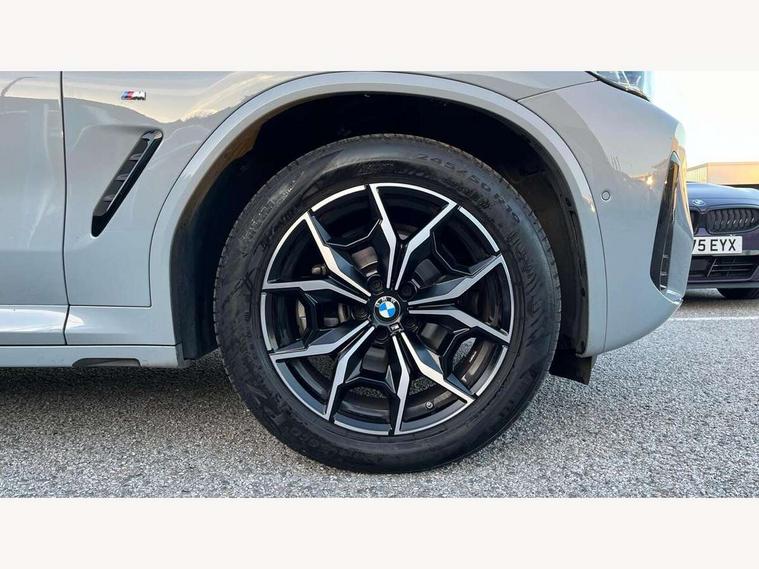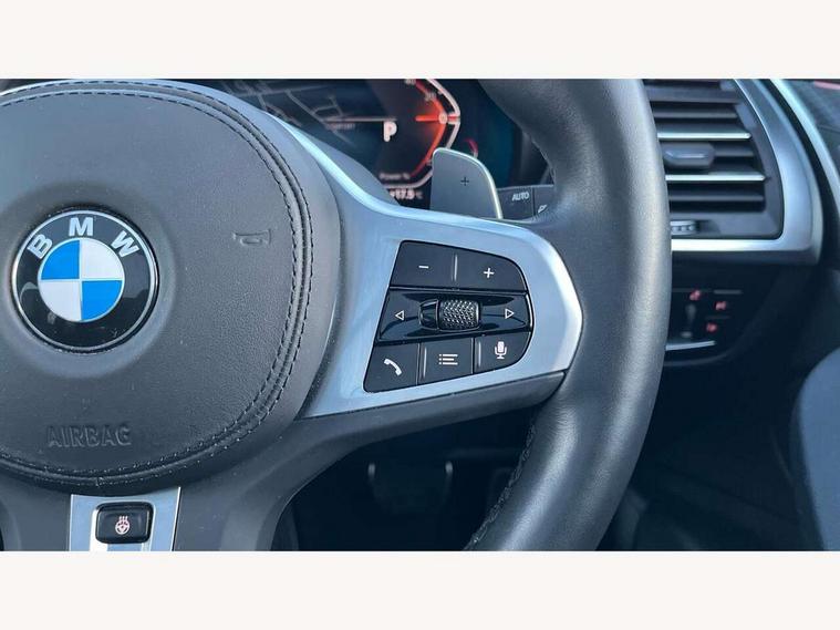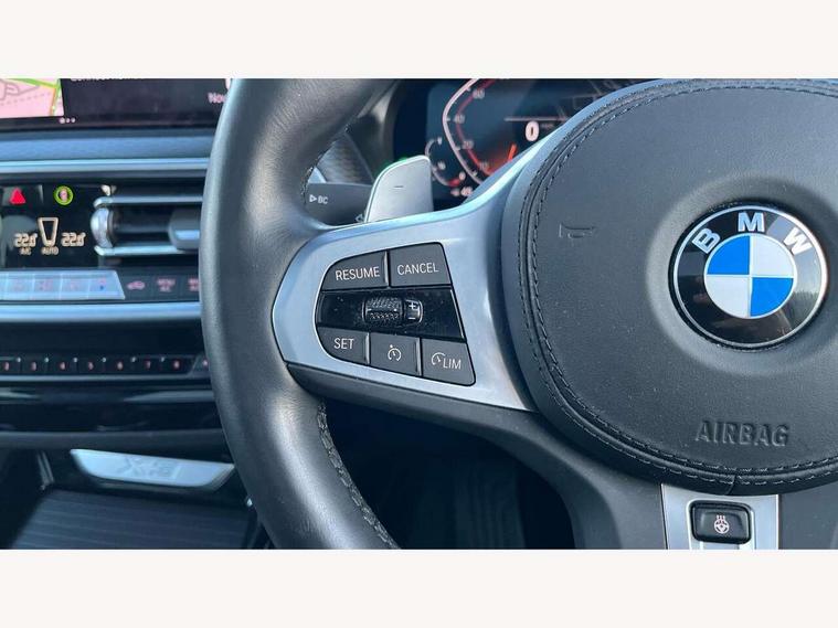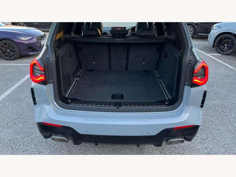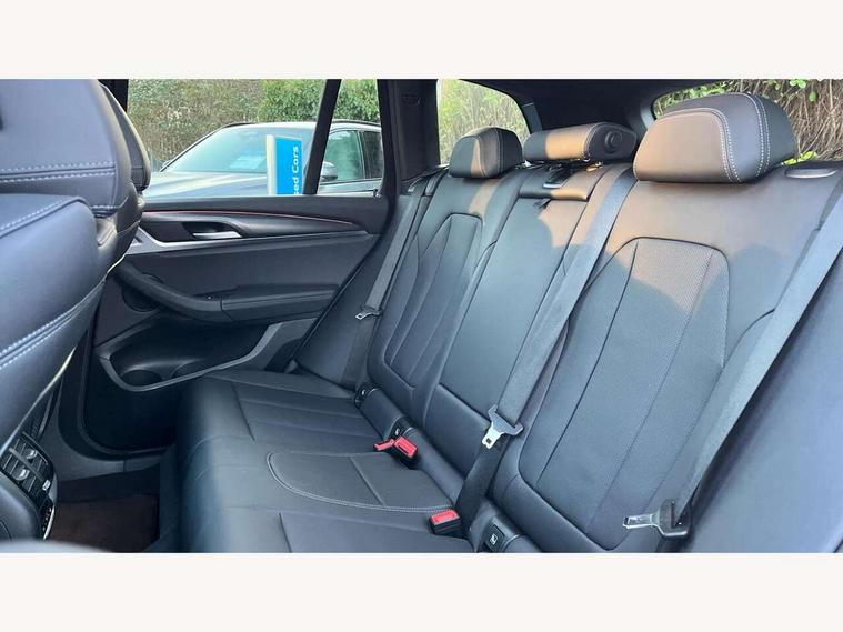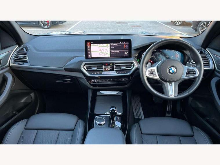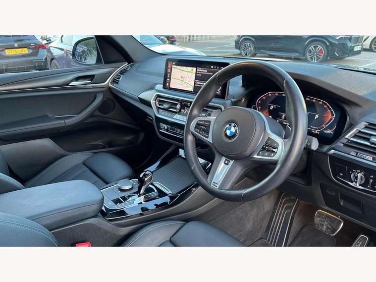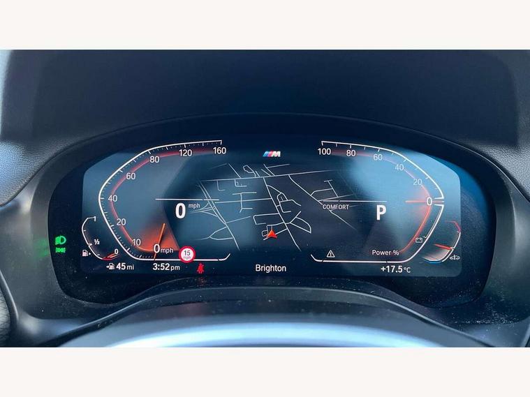 Active Guard, Attentiveness assist, BMW Live Cockpit Professional nav system including 12.3" instrument display + 12.3 high resolution control display, BMW Online services, BMW Teleservices, Brake pad wear indicator in front and rear, Check Control warning system for monitoring of lights and door/luggage compartment open warning, Condition based service - BMW service history, electronic service booklet, integrated owner's handbook, Connected drive services, Electric boot lid, Front/rear Parking distance control, iDrive touch controller with 8 favourite buttons, Instrument cluster with speedometer with mph readout, tachometer, fuel gauge and oil temperature gauge, Lights on warning by audio warning signal when ignition is switched off, Oil sensor for level and grade, warning by check control system, On board computer - average speed+fuel consumption, service interval, clock/date, odometer/trip meter, outside temperature display and ice warning, Optimum shift indicator, Personal Profile - automatic lock when driving away selectable, Run flat indicator, Stop/start system, Variable sports power steering with drive performance control Sport+ mode, Automatic transmission with gearshift paddles, Incorrect fuelling protection, M sport suspension, Multi-link rear suspension, BMW professional radio/CD/MP3, DAB tuner, Acoustic glazing, Automatic windscreen wipers and automatic headlight, Black finish on B pillars, Body colour door handles, Body colour electric adjust heated aspherical door mirrors, Body colour roof mouldings, Body coloured bumpers, Direction indicator, side repeaters, integrated in exterior mirrors, Dynamic brake lights, Exhaust tailpipes - dual, round, split left and right with chrome finisher, Fingertip control / anti-trap function on electric window, Folding wing mirrors with auto dimming, Follow me home headlights, Front and rear bumper system with replaceable deformation elements, Front and rear electric windows, Gloss chrome tailpipes finishers, Green tinted heat insulating glass, Heated windscreen washer jets, High beam assistant, High gloss black shadow line roof rails, High gloss shadowline exterior trim in decorative moulding side frame/recess cover/guide rail/B, C pillars/mirror frame and triangle with mirror base, High level 3rd brake light incorporating LED Technology, Interior rear view electrochromatic mirror with automatic anti dazzle function, LED tail lights, Lightweight engineering, M aerodynamic bodystyling, M Sport entry door sill strips, Model designation, Rain sensor, Rear side wing doors, Rear wing door, Rear wiper, Shark fin antenna, Side exterior M designation badges, Visible VIN plate, Welcome lighting, Windscreen wipers with adjustable interval, 12V power point in luggage area, 12V power socket in front centre console, 2 x USB Type C ports for charging and data transmission (front centre console) and 2 x USB Type C ports for charging (rear centre console), 3 rear headrests, 3 seat bench in 2nd row, 3 zone automatic air conditioning, 4 lashing points to secure luggage, 40:20:40 split folding rear seat with loading system, Ambient lighting, Anthracite headlining, Automatic interior light when door is opened/ignition switched off or via remote key, Floor mats in velour, Foldable storage floor with compartment, Four grab handles integrated in roof lining, Front and rear bottle holders integrated into door trim storage compartments, Front and rear side armrests integrated into door trim, Front centre armrest with storage compartment, Front footwell lights, Front head restraints, Front passenger seat, Front sports seats, Front/rear courtesy lights with soft on/off dimming, Front/rear reading lights, Heated front seats, Isofix rear child seat preparation, Leather gear knob, Lockable glove compartment, Luggage area underfloor compartment, Luggage compartment lighting, M sport leather steering wheel, Multifunction steering wheel, Parcel shelf removeable and storable under boot floor, Reach and rake adjustable steering column, Rear centre armrest with 2 cupholders, Removable / retractable luggage cover, Slope adjustable rear seats, Storage compartment in rear centre console and front/rear door trims, Sun visors with vanity mirrors and ticket pocket, Toolkit located in luggage compartment, Two front cupholders with removable oddments tray/lid, Connected pro pack - X3, ADB - Automatic Differential Brake, Anti-lock braking system (ABS) with brake assist, Automatic Stability Control (ASC), Battery safety cut-off, BMW emergency call, Brake drying, Brake energy regeneration, Braking pre-tensioning, Child locks on rear doors, Cornering brake control (CBC), Crash Sensor - activation of central locking release, hazard warning light and interior lighting, Deactivation of fuel pump in the event of a crash, Driver and front passenger front and side airbags with passenger deactivation and ITS front and rear head airbags, Driver and front passenger knee airbag, DSC+, Dynamic brake control, Dynamic Traction Control - DTC, Electromechanical parking brake, Hill descent control, Hill start assist, Seatbelt security check for front seats, Side impact protection, Three point seatbelts to all seats with front and outer rear pyrotechnic belt tensioners and seat belt force limiters, Two tone horn, Tyre pressure sensor, Ventilated front and rear disc brakes, Warning triangle and first aid kit, Central locking switch for all doors, fuel filler cap and luggage compartment, Electronic engine immobiliser, Locking wheel nuts, Remote control including two integrated key - one button for open/close all lockable content, windows and separate button for open luggage compartment, Remote control Thatcham category 1 alarm, Start/stop button with Comfort Go keyless engine start and auto Start/stop deactivation button, Low rolling resistance tyres,