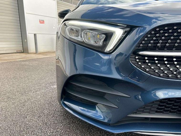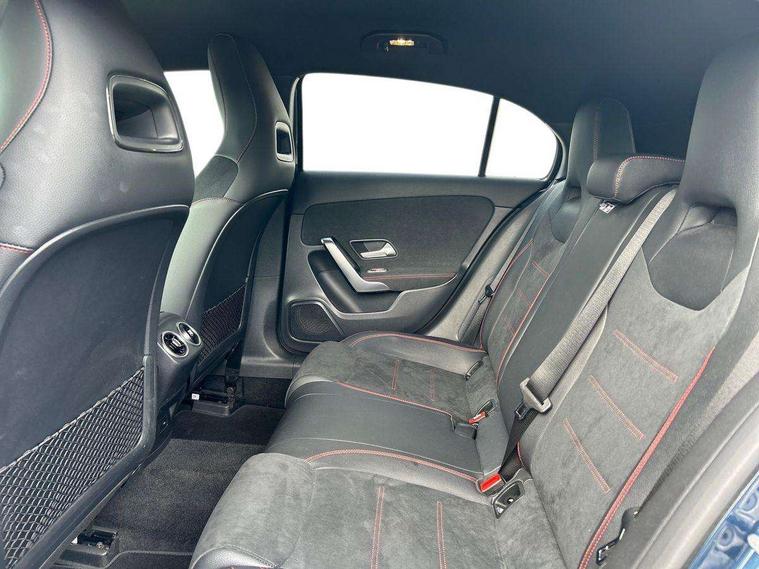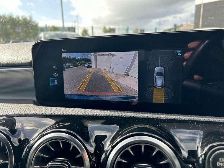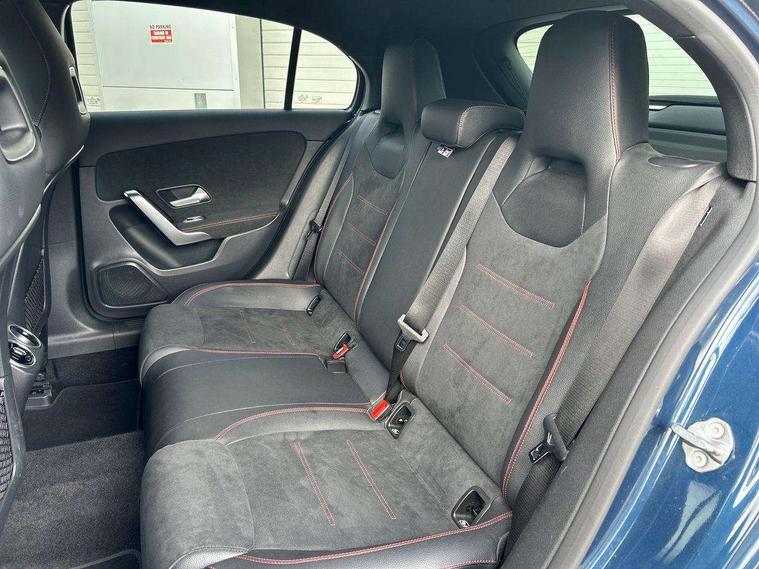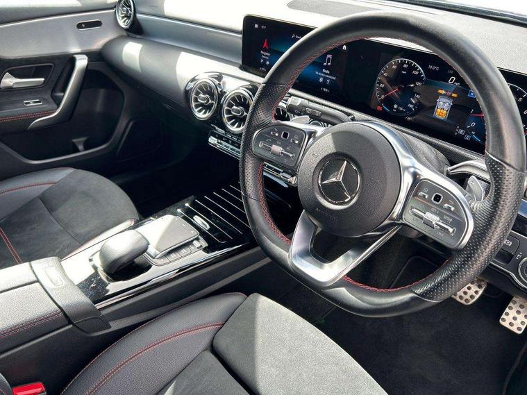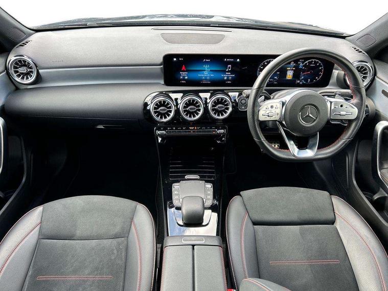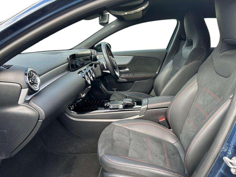10.25" Digital instrument cluster display screen, 10.25" media display, 180 degree rear view camera with parking guidelines, Active parking assist with visual and audible warning of detected obstacles, Attention assist, Brake pad wear indicator warning light, Car wash mode, Cruise control + speed limiter, Direct steering, Dual bluetooth interfaces, DYNAMIC SELECT with a choice of driving modes (ECO, Comfort, Sport and Individual), ECO start/stop function, Fluid level warning indicator for fuel, oil, coolant and washer fluid, Hard-disk navigation, Hey Mercedes Voice activation, Lamp failure indicator, Lane keeping system, Mercedes me connect including emergency call system, accident recovery, breakdown and maintenance management, Mercedes me remote services, Outside temperature gauge, Owners manual in English, Pre-installation for private car sharing, Preinstallation for Mercedes Benz link, Service indicator (ASSYST), Smartphone integration with Apple CarPlay and Android auto, Speed limit assist, Speed sensitive power steering, Trip computer, Ultrasonic sensors positioned in the front and rear bumpers, Lowered comfort suspension, Rear axle torsion beam, 2 USB ports (type C) in rear stowage compartment and one in front of center console, 6 speakers, DAB Digital radio, MBUX multimedia system with DAB digital radio and touchpad including satellite navigation, Mercedes-Benz sound system - 100W, 4 Electric Front and Rear windows, Adaptive brake lights, AMG bodystyling - Front apron with splitter in chrome, rear apron with chrome trim and chrome visible trim elements in tailpipe, Automatic headlights, Black weather strip, Body colour bumpers, Body colour door handles with chrome inserts, Body colour side skirt, Electric adjustable and heated door mirrors with integrated LED side indicators, Exclusive diamond radiator grille, Exhaust system - Twin visible tailpipes in polished stainless steel, Headlamp assist automatic headlamp activation, Heated glass rear windscreen + timer control, LED High level third brake light, LED high performance headlamps with integrated LED daytime running lights, LED tail lamp, Privacy glass, Radio aerial, Rain sensing windscreen wipers with two sensitivity settings, Rear fog lights, Rear side wing doors, Rear wiper, 3 seat bench in 2nd row, 3 Spoke flat bottom leather multi function steering wheel with perforated leather in grip area, 40:20:40 split folding rear seats, Artico man-made leather/Microfibre Dinamica upholstery with red contrast stitching, Auto Mercedes-Benz child seat recognition sensor, Black air vents with surround in silver chrome, Black roof lining, Brushed stainless steel sports pedals with rubber studs, Controller on centre console with chrome surround, Floor mats with AMG lettering, Front centre armrest with storage compartment, Front seat backs luggage nets, Galvanished gear shift paddles on steering wheel, Heated front seats, Height/reach adjustable steering column, Illuminated Mercedes Benz lettering front door sills with changeable cover, Interior lighting - 64 colour Ambient lighting, Interior mirror with reading lamps in black and frameless, Manual height adjustable front seats, Rear head restraints, Seat occupancy sensor for front passenger seat, Single front passenger seat, Sports seats with integrated headrests, Stowage compartment in centre console with retractable cover, Sunvisors with illuminated vanity mirrors, Touchpad on center console, Twin front cupholders, Two zone thermotronic luxury automatic climate control, Light and sight pack - A Class, Mirror package - A Class, Night pack - A Class Saloon/Hatchback, Seat comfort pack - A Class, 3 rear 3 point seatbelts, ABS with Brake Assist, Active bonnet, Active brake assist includes forward collision warning system with autonomous braking, Adaptive brake assist with hold function and hill start assist, Black seatbelts, Childproof locks manually operated for rear doors and electrically operated for rear power windows, Crash responsive emergency lighting, Driver and passenger head and side airbags, Drivers knee airbag, Dual stage driver/passenger airbags, Electronic parking brake, ESP curve dynamic assist, ESP with ASR, Front and rear seatbelt reminder, Front brake callipers with Mercedes Benz lettering, ISOFIX and top tether child seat fixing points in two outer rear seats, Tyre pressure monitoring system, Warning triangle and first aid kit, Window airbags, Alarm system/interior protection/immobiliser, Keyless Go, Remote central locking and crash sensor with emergency opening function, Urban guard vehicle protection system with immobiliser and interior protection, Matrix look light longitudinal grain aluminium trim element, 18" AMG 5 twin spoke light alloy wheels aerodynamically optimised painted in black with highsheen finish, Summer tyres, Tirefit sealant kit,