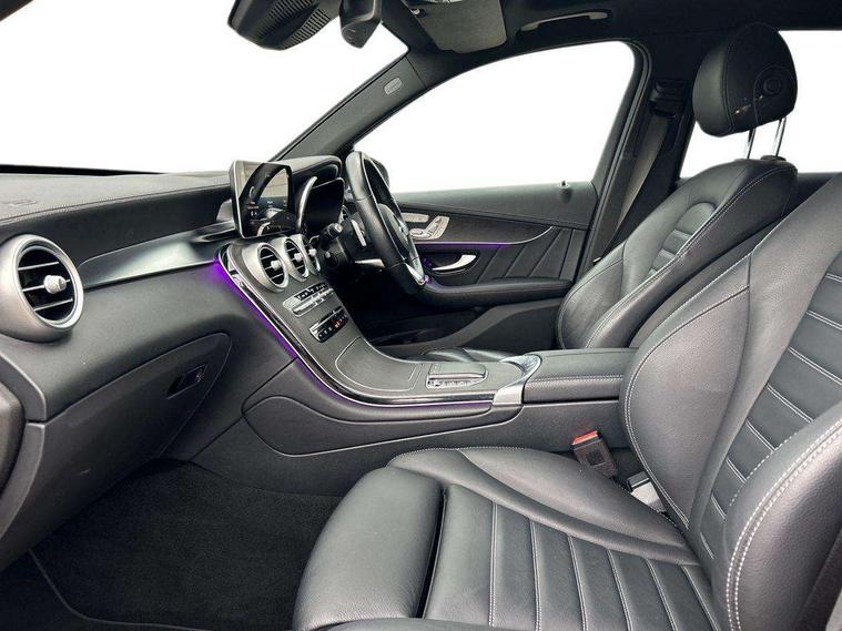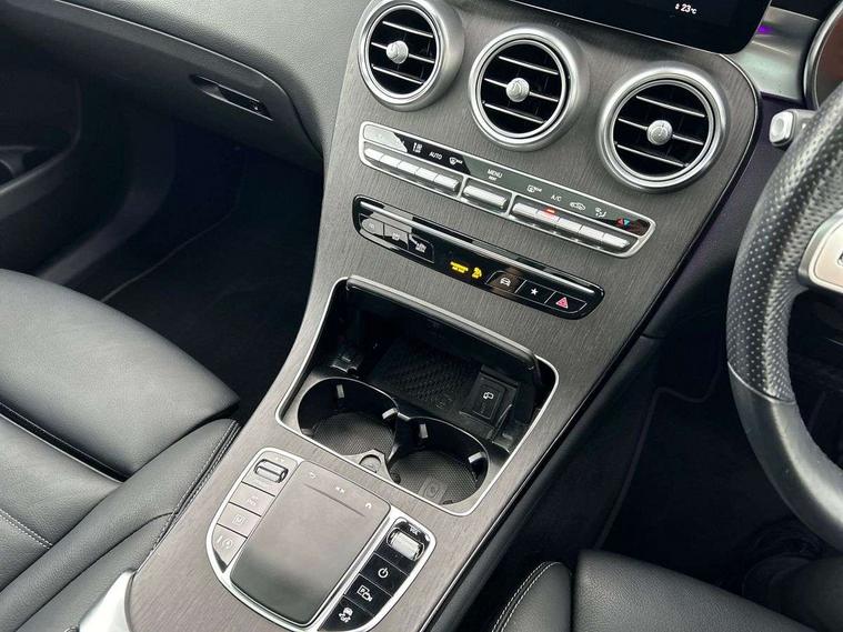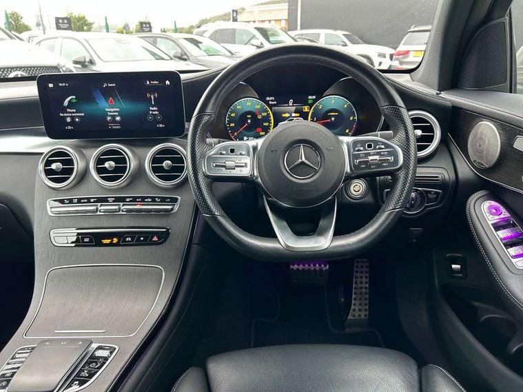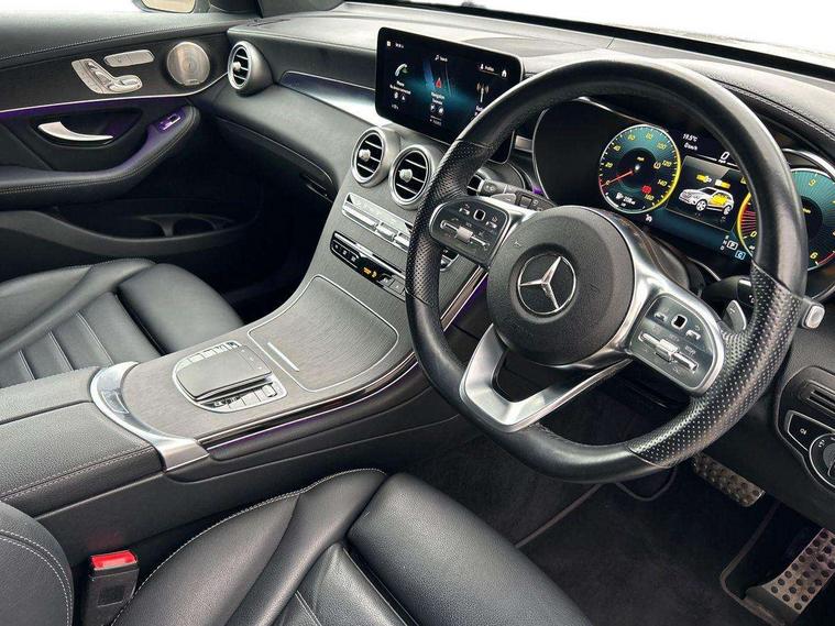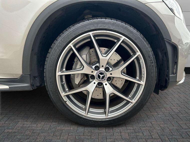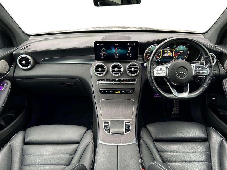 Anthracite open pore oak wood trim, Interior lighting pack - GLC, Memory pack - GLC, Mirror pack - GLC, Storage pack - GLC, 20" AMG 5 twin spoke alloy wheels painted in titanium grey with high sheen finish, Run flat tyres, Summer tyres, Alarm system/interior protection/immobiliser, Automatic door locking, Keyless Go entry and starting function, Remote central locking, 5 speakers, Frontbass loudspeakers, MBUX multimedia system with DAB digital radio and touchpad, Media display 10.25-inch touchscreen display, Pre installation for Mercedes Benz Link, USB ports x 2 in centre console, 3 rear 3 point seatbelts, Active bonnet, Adaptive brake system with HOLD function and brake drying in the wet, ASR, Black seat belts, Brake calipers with Mercedes-Benz lettering + perforated brake discs, Child proof door locks, Dual-stage airbags - driver and front passenger, driver knee bag and window bags for driver, front passenger and rear passengers, Electronic parking brake, Electronic stability programme (ESP) with curve dynamic assist and cross wind assist, Front and rear seatbelt reminder, Front passenger seat occupancy sensor, Hill hold function, Tyre pressure monitoring system, Warning triangle and first aid kit, Adaptive brake lights, Aluminium roof rails, AMG bodystyling AMG front apron with sporty air intakes and chrome trim element, AMG diffuser-look rear apron with insert in black, Body colour door mirrors, Body coloured bumpers, Electric panoramic glass sunroof, Electric windows one touch open/close, Electrically adjustable and heated door mirrors, Front, side and rear exterior chrome trim, Headlamp assist automatic headlamp activation, LED high performance headlamps with integrated LED daytime running lights, LED tail lamp, Motor way mode function and locator lighting, Privacy glass with dark glass from B pillar backwards, Radiator diamond grille, Rain sensor windscreen wipers, Range adjustable headlights, Rear wiper, Running boards, Tinted glass all round with single layer safety glass, Two chrome plated tailpipe trim elements, 2 way rear head restraints, 3-spoke multifunction sport AMG steering wheel in black nappa leather with flattened bottom section, chrome insert and perforated leather in grip area, 40:20:40 split folding rear seats, Ambient lighting, AMG floor mats with edging and embroidered AMG lettering, AMG sports seats, Artico man-made leather upper dashboard with contrast topstitching, Automatic child seat recognition sensor, Black roof lining, Dividing net - rear, Double cup holder in centre console, Easy-pack removable load compartment cover, Front armrest with storage box, Front door sills with Mercedes Benz lettering, Front head restraints, Heated front seats, Illuminated and lockable glove compartment, Leather upholstery, Rear top tether child seat ISOFIX attachment, Sports pedals with stainless steel surfaces and rubber studs, Steering wheel with touch control buttons, THERMOTRONIC 3 zone automatic climate control, 360 degree camera, Active parking assist with parktronic system, Attention assist, Bluetooth interface for hands free telephone, Collision prevention assist plus, DYNAMIC SELECT with a choice of driving modes (ECO, Comfort, Sport, Sport+ and Individual), Easy pack automatic powered tailgate, ECO start/stop function, Hard disk navigation, Hey Mercedes Voice activation, Instrument cluster with12.3-inch digital instrument cluster display. High resolution instrument cluster screen with choice of three display styles, MBUX Interior assistant, Mercedes connect me with remote online services, Multi function trip computer, Outside temperature display, rear seatbelt status indicator, Remote boot release, Service indicator (ASSYST), Smartphone integration with Apple CarPlay and Android auto, Traffic sign assist, 4MATIC permanent four wheel drive, 66 litre fuel tank, 9G TRONIC plus automatic transmission with steering column gear selector, DIRECT SELECT steering wheel gearshift paddles, Diesel particulate filter, Sports suspension tuned for improved handling and driving dynamics,