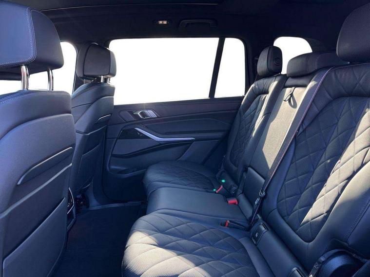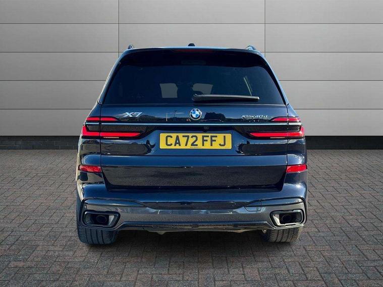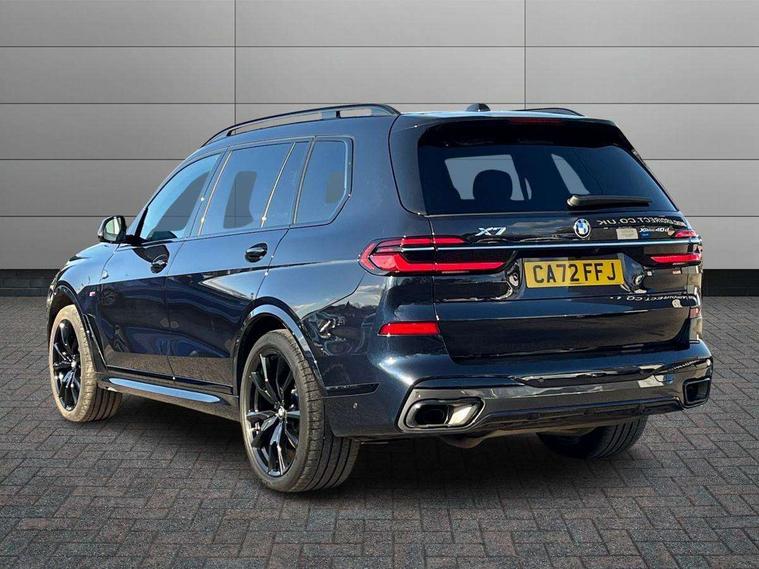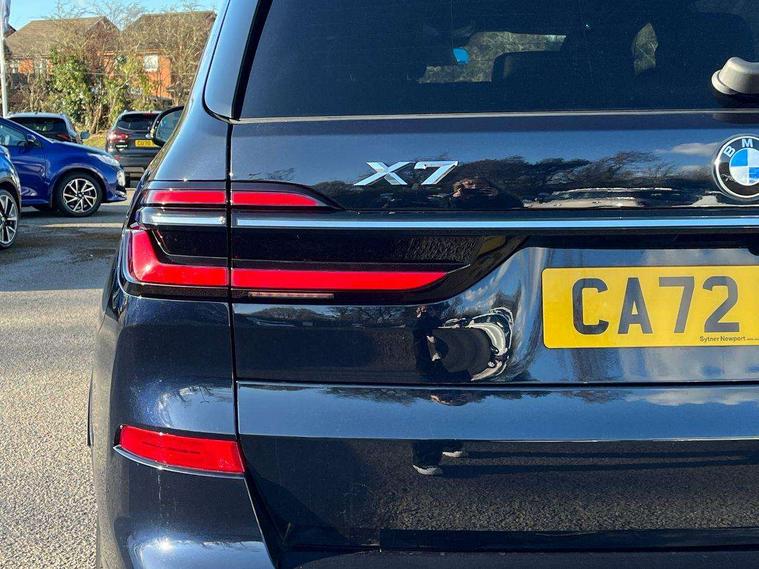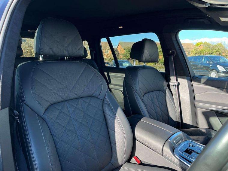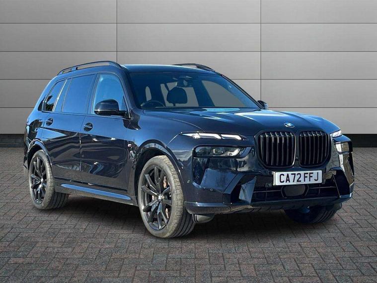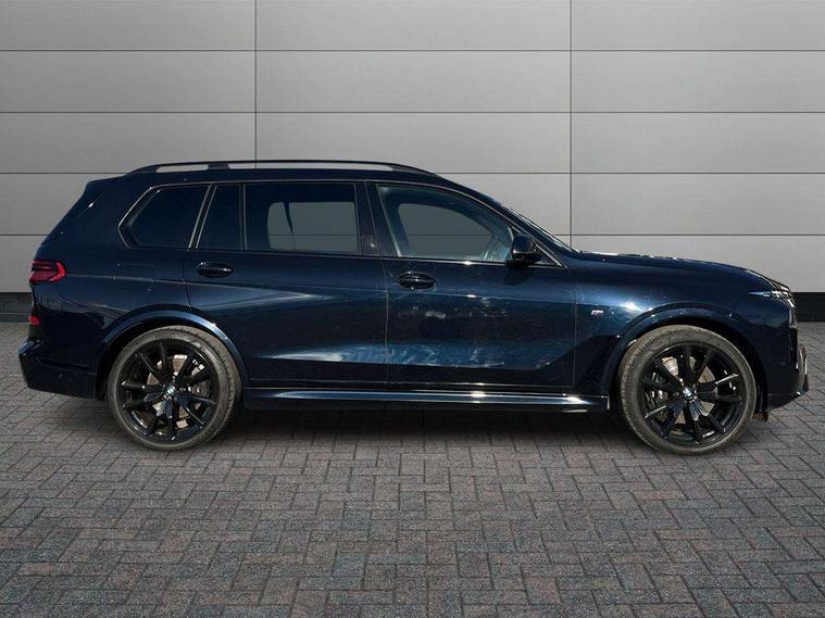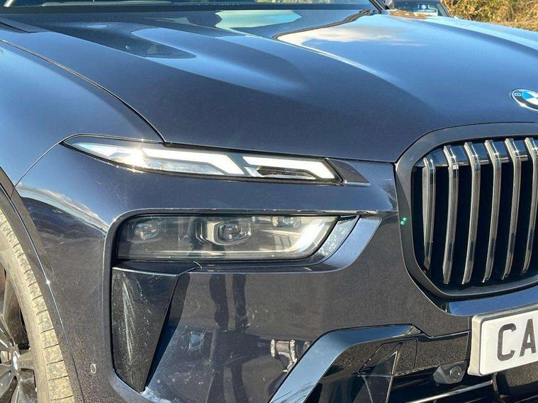 Attentiveness assist, Automatic start/stop function, Automatic tailgate operation, BMW ConnectedDrive online services, BMW Drive recorder, BMW gesture control, BMW Teleservices, Brake pad wear indicator in front and rear, Condition based service, Electric power steering with Servotronic steering optimised at all speed ranges, Integrated owner's handbook, Live Cockpit Professional with head up display including 12.3" instrument cluster and 14.9" central display, Parking assistant pro including reversing assistant, PDC, lateral parking aid, reversing assist camera, parking drive off monitoring, Speed limiter, 48V Mild hybrid technology, 8 speed automatic with steptronic transmission including automatic hold function and gearshift paddles on the steering wheel, Drive experience switch with comfort mode + ECO PRO + sport mode, Permanent all wheel drive, DAB radio, Acoustic glazing, Adaptive air flap control bars in high gloss black, Adaptive LED Headlights, Air breather and door claddings in high gloss chrome, Aluminium roof rails, Aluminium Running Board, Body coloured wheel arches, Dynamic brake lights with LED technology, Electrically adjustable and heated aspheric folding side mirrors with auto dimming, electric fold in function, automatic parking function, Exterior and central air inlets in front bumper painted pearl chrome, Follow me home headlight function, Frameless interior mirror, Front and rear electric windows, Front ornamental grille struts in chrome high gloss, Heated windscreen washer nozzles, High beam assist, High gloss black shadowline trim in side/window frame, window recess cover, window guide, B and C pillar, mirror triangle, mirror base, mirror frame, Integrated turn indicators, Kidney grille iconic glow, LED daytime running lights, LED rear lights, LED third brake light in rear spoiler, One piece front ornamental grille frame in pearl gloss chrome, Rain sensor with automatic headlight activation and windscreen wiper control, Rear side wing doors, Sump guard front and rear painted in silver, Trailer stabilisation logic, 12V - Power sockets with 2x centre console and 1x luggage compartment, 2 seat bench in 3rd row, 2x cupholders in front and rear centre armrest in 3rd row, 2x cupholders in front, rear centre armrest and two in third row seats, 3 seat bench in 2nd row, 40:20:40 split folding rear seats with backrest, Additional storage compartments, BMW inscription in front and rear door entry sills with illuminated, Centre console includes storage compartment, Compartment in front of cupholder, Driver and front passenger sunvisors with illuminated vanity mirrors and ticket holder, Electrical steering column with adjustable height and length with activation and control on the steering column, Front and rear colour co-ordinated with all standard carpet colours, Front and rear door pockets, Front and rear side armrests integrated into door trim, Grab handles, Height adjustable front headrests, Height adjustable rear headrests, Lockable glove compartment, M leather steering wheel, Nano filter, Single front passenger seat, Soft close doors, Storage tray and compartment with lid in centre console, Wireless charging tray, Additional storage compartment pack - X7, Ambient light interior pack - X7, Connected Package Professional - X7, Interior lighting pack - X7, Luggage compartment pack - X7, M aerodynamics pack - X7, 3 point seatbelts on all seats, front pyrotechnic belt tensioners, stopper and belt force limiters, front and outer rear seats, Acoustic protection for pedestrians, Active protection, Airbag - Front driver and passenger, side airbags and Head airbags, Anti lock braking system (ABS) with cornering brake control, Automatic Stability Control (ASC), BMW emergency call, Child seat ISOFIX attachment rear outer seats in 2nd row and both seats in 3rd row includes top tether, Comfort cushion seats for outer seats in 2nd row, Crash sensor inclu activation of airbags, interior light, safety battery terminal clamp, hazard warn flasher, unlock doors, deactivation of fuel pump, DSC - Dynamic Stability Control, Dynamic Traction Control - DTC, Electromechanical parking brake with automatic drive away release and auto hold function, Front and rear brake discs with interior ventilation, Hill descent control, Integrated braking system, Manual child lock in rear doors, PC iBrake PostCrash approach control warning with light braking function, Tyre pressure monitoring system, Tyre pressure sensors, Variable torque distribution, Warning triangle and first aid kit, Alarm, Central locking including 2 vehicle keys with integrated emergency key, Comfort access system, Engine immobiliser, Locking wheel bolts, Galvanic embellisher for controls,