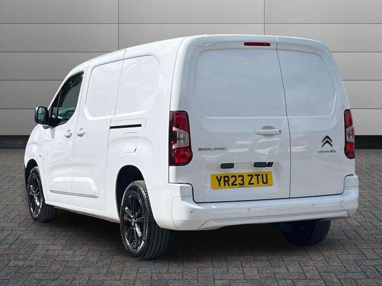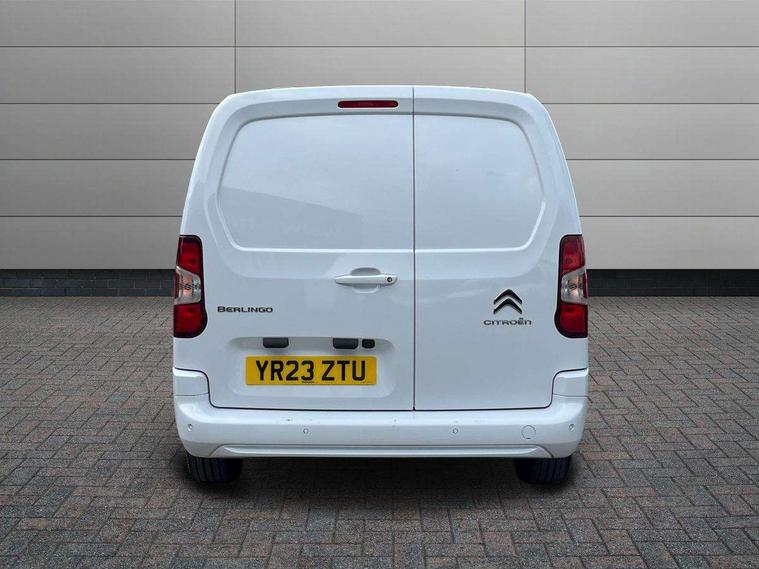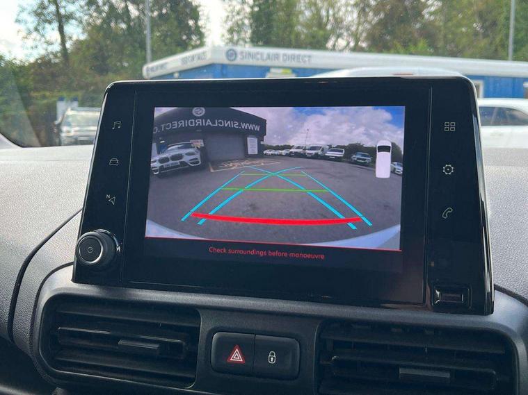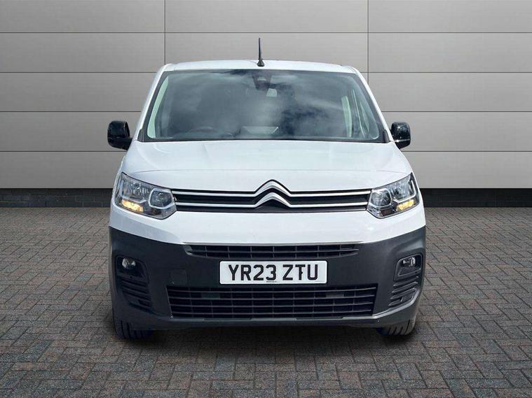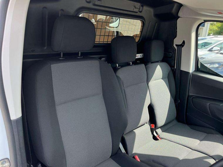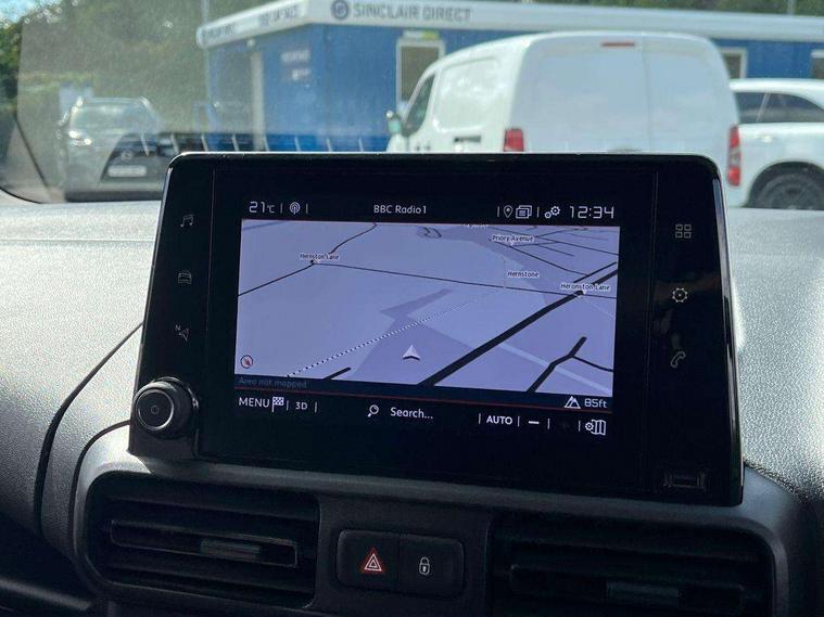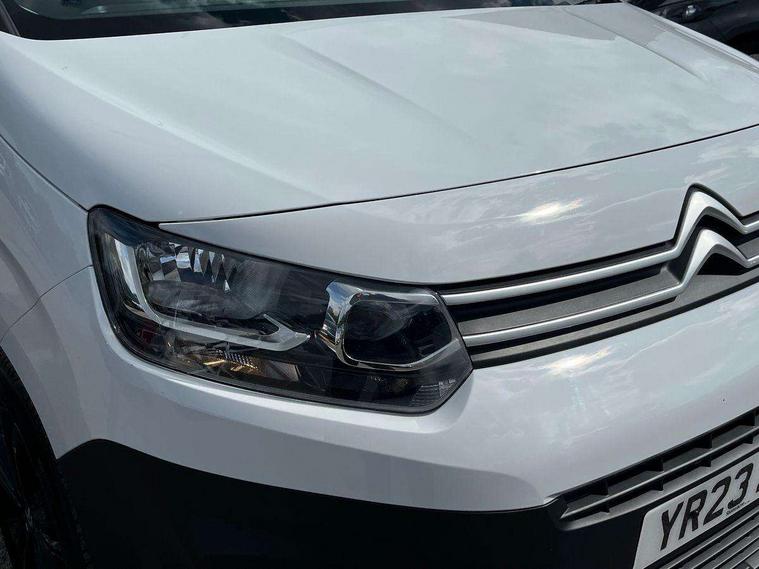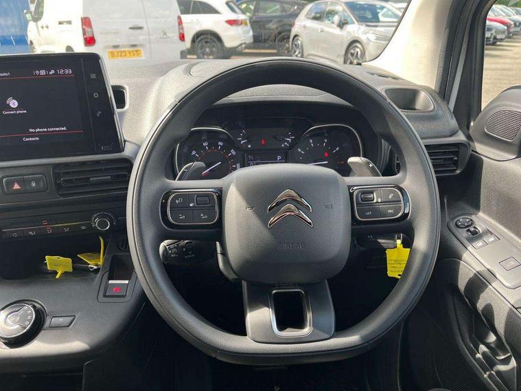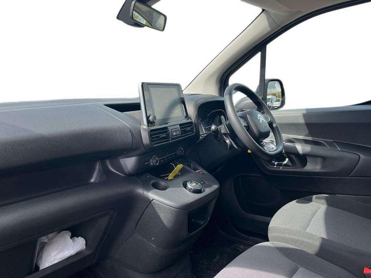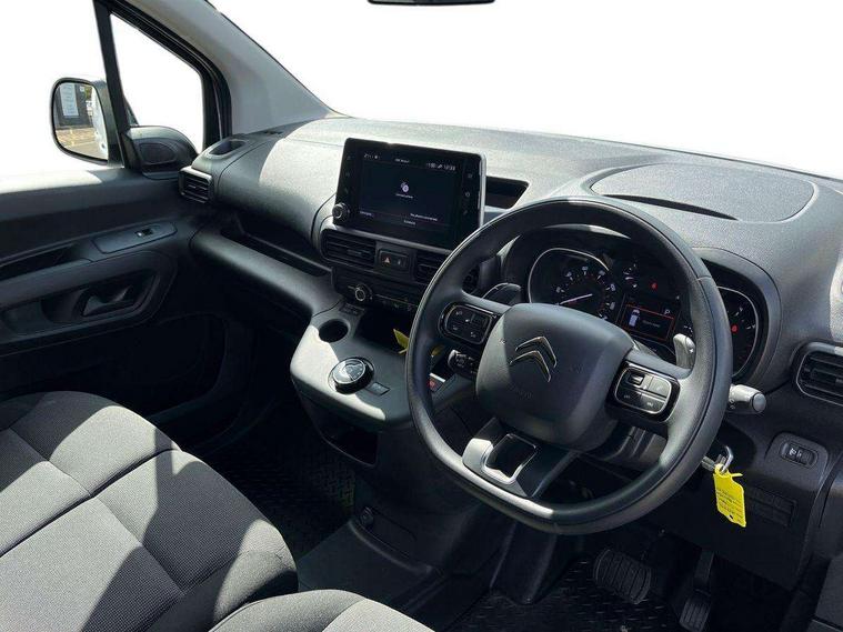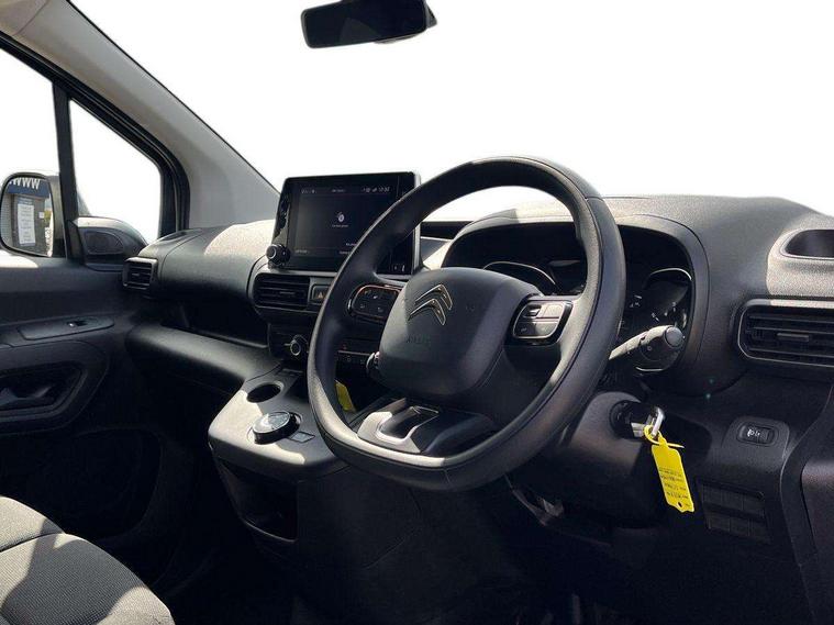 Citroen connect box with emergency and assistance system, Citroen connect navigation with 8" colour touchscreen, DAB radio, bluetooth with handsfree and USB socket, Cruise control with programmable speed limiter, Electric power assisted steering with height and reach adjustable steering wheel, Lockable fuel cap, Multi-function trip computer, Rev counter with maintenance and gear efficiency indicators (GEI), Tyre pressure monitor, Voice recognition, Apple Carplay/Android Auto, Automatic lights, Electric folding door mirrors, Electric front windows with one touch operation, Electrically adjustable door mirrors with temperature sensor, Height adjustable halogen headlights with automatic illumination and integrated daytime running lights (DRLs), High level third brake light, Sliding offside side loading door, Twin sliding side load doors, Visible VIN at windscreen base, 12 volt socket in dashboard, 6 floor mounted load securing rings, 6 load tie-down hooks in cargo area, 6 way adjustable driver seat with lumbar support and under seat storage, Air conditioning, Cup holders for driver and passenger on either side of the dashboard, Curitiba cloth upholstery, Extenso modular folding dual passenger bench seat, pivoting writing table, driver's lumbar adjust, storage under central seat, electric parking brake, Front door pockets with 1.5L bottle holder, Hard plastic floor protection in cabin, Overhead storage shelf in cabin, Remote temperature pre-conditioning, Topbox storage compartment, Look pack with body coloured bumper - Berlingo, Automatic activation of hazard warning lights on major deceleration, Door opening warning and audible lights on warning, Driver's airbag, Driver/passenger seatbelt unfastened warning, Dashboard mounted central locking push button and auto locking above 7mph, Perimetric and volumetric thatcham category 1 approved alarm with tilt sensor, Remote central locking with deadlocking, selective cab and load area locking via 3 button plip remote control key, Thatcham approved rolling code transponder immobiliser, Electronic Stability Control and ABS with hill start assist, EBA and EBFD,