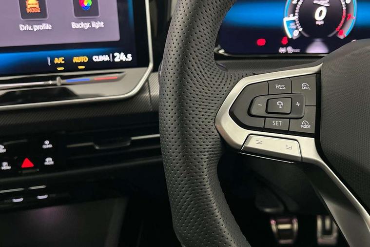 Activated carbon canister, Adaptive cruise control (ACC), Advanced driver attention and drowsiness monitor, Dynamic road sign display, Dynamic steering, E-Sim card for online connectivity, eCall emergency call system, Multi-color Digital cockpit pro, selection of different info profile possible, Multifunction front facing camera for distance control, Navigation system, Oncoming vehicle braking when turning including swerve support, Preparation for light assist system, Speed limiter, Speedo, rev counter, electronic odometer, trip, service interval display, exterior temperature and fuel gauge, Traffic jam assist, Voice enhancer and voice control, Warning signal and warning light for front and rear seatbelts not fastened, We connect plus preparation, We connect preparation, Wireless app connect, Petrol Particulate Filter, Start-stop system with battery regeneration (recuperation - energy recovery during braking), XDS electronic differential lock for improved traction and handling, 2 USB C ports in front, 2 USB charging sockets on the centre console in the rear charging capacity upto 45W, Comfort telephony + wireless charging, without wireless aerial connection, Digital radio reception (DAB), Diversity antenna for FM reception, Gaming platform via car app, Infotainment system with 12.9" display, Mobile phone interface with inductive charging feature, 3rd brake light, Auto headlights, Automatic headlamp activation with Coming home and Leaving home feature, Body colored bumpers in R-Line style, Body colour door handles, Exterior ambient lighting with illuminated door handles, Exterior mirrors convex on the left and aspherical on the right, Front and rear electric windows, Heat insulating windshield made of laminated glass, LED daytime running lights, Rear exhaust tailpipe, Rear fog light on one side and reversing lights on both sides, Rear side wing doors, Rear windscreen washer and wiper with interval delay, Remote electrically foldable door mirrors, puddle lights and reverse activated passenger's door mirror, Welcome light with surround lighting, 12V socket in front centre console, 12V socket in luggage compartment, 3 rear head restraints, 3 seat bench in 2nd row, Ambient lighting with 30 colour including LED light unit in front footwell with selectable light colour, Brushed stainless steel pedals, Carpet mats, front and rear, Chrome plated radiator grille inserts, air vent surrounds and light switch surrounds, Front centre armrest, Integrated front head restraints, ISOFIX anchors for child seats on outer rear bench seats and on front passanger seat compatible for i-Size, Leather gearshift handle, Luggage compartment lighting, Premium sports seats in front, Rear cupholder and loadthough, Single front passenger seat, Soul black instrument panel, Split folding backrest with centre armrest and unsplit rear seat bench, Storm grey roof lining, Sun visors with illuminated vanity mirrors, 3 point height adj front seatbelts + pretensioners, 3 rear three point seatbelts, ABS, Autonomous emergency braking front assist with pedestrian and cyclist monitoring, Child locks on rear doors, Driver and front passenger airbag with front passenger airbag deactivation, Electronic parking brake with auto hold, ESC (Electronic Stability Control), Extended pedestrian protection measures, Rear disc brakes, Two tone horn, Tyre pressure loss indicator, Volkswagen roadside assistance, Anti theft wheel bolts, Preparation for alcohol interlock, Decorative inserts carbon grey for dashboard and front door trim panels,