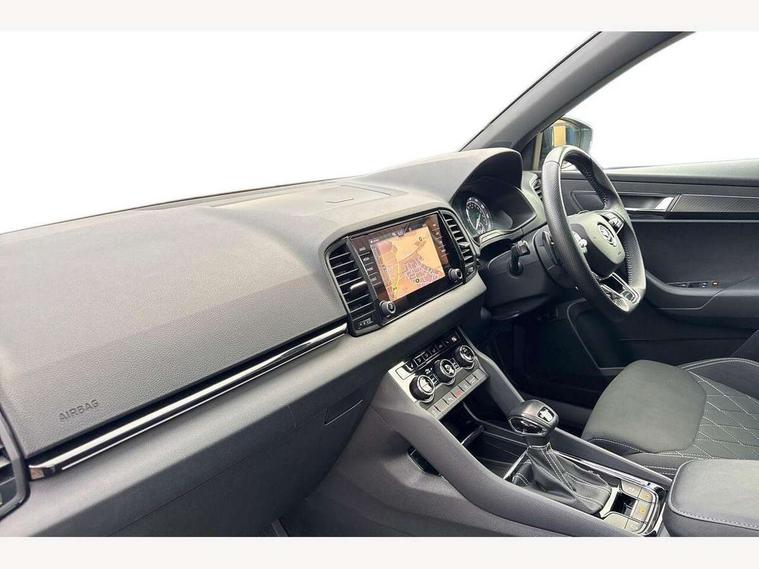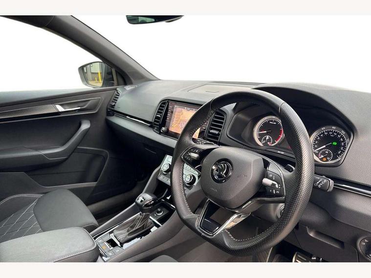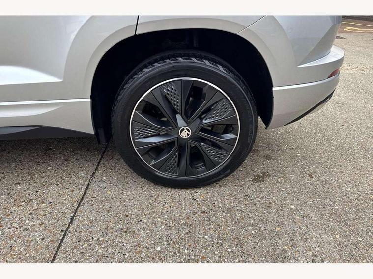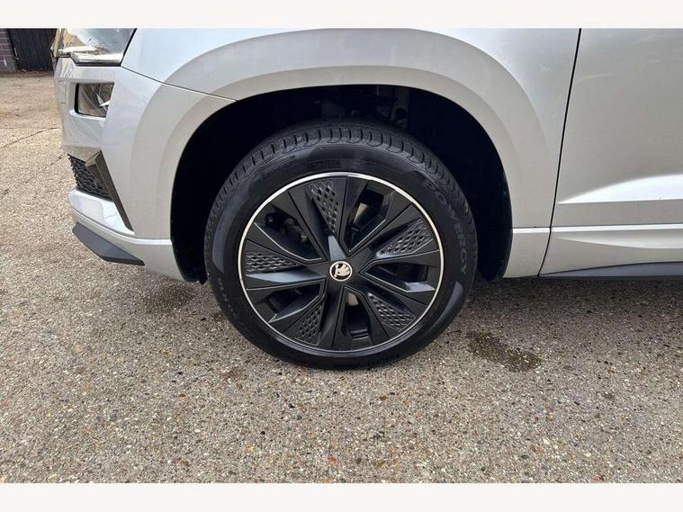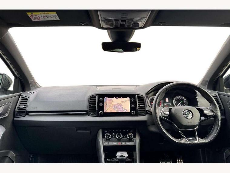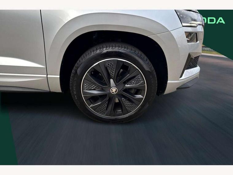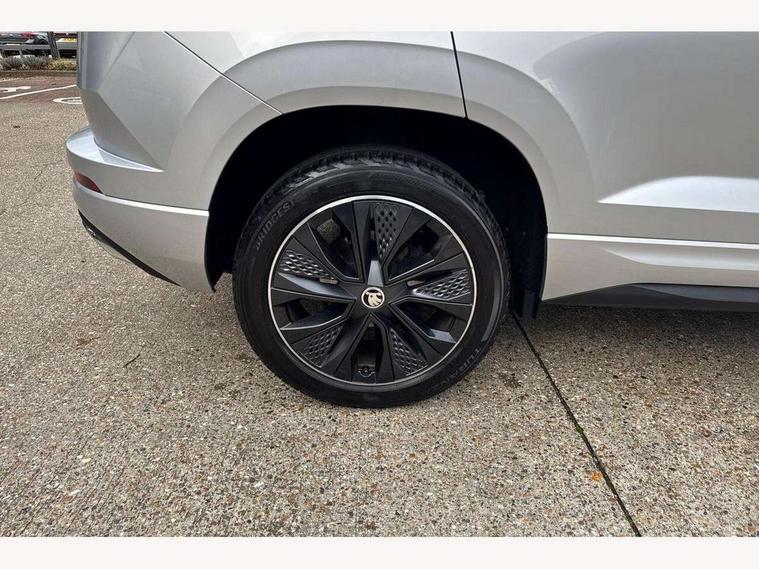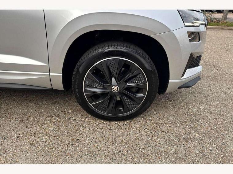 Care connect, Driver fatigue sensor, Emergency services call system, Multifunction colour trip computer, Outside temperature gauge, Service interval indicator, SmartLink wireless for Apple and wired for Android, Start/stop system with regenerative braking, USB C Port x 2 in front centre console, Virtual pedal with electrically operated boot door, 8 Speakers, DAB radio with Bluetooth, USB connection, Acoustic glass, Aero front windscreen wipers with intermittent function, Auto dimming rear view mirror with light and rain sensors, Automatic headlight control system, Black door mirrors, Black electric window control buttons, Black radiator grille, Black roof rails, Body colour door handles, Body coloured bumpers, Electric front and rear windows with child proof lock, Front door steps with SportLine logo, Heated rear windscreen, LED daytime running lights, LED rear lights with high functionality welcome effect and dynamic indicators, Light assistant (coming/leaving home/tunnel light), Panoramic sliding sunroof, Privacy glass, Protective door side sills in body colour, Rear diffuser, Rear side wing doors, Rear spoiler, Rear wiper, Safety reflectors on front doors, Skoda lettering on tailgate in black, Sportline badge on front fender, Sportline decorative inserts with badging, Sports front and rear bumpers, 1.5 litre bottle holders in driver and front passenger door panels, 12V socket in boot, 12v socket in front centre armrest with storage compartment and rear air vents, 2 Folding hooks and nets in boot, 3 rear height adjustable headrests, 3 seat bench in 2nd row, 3 spoke leather sports multifunction steering wheel and silver stitching with gear shift paddles, 4 foldable roof handles with rear coat hooks, Black floor carpet, Black roof headlining, Chrome inner door handles, Double sided boot floor, Foldable hooks in the boot, Front head restraints, Height adjustable front three point seats belts with tensioners, Height/reach adjust steering wheel, Ice scraper, Illuminated and cooled glovebox, Illuminated luggage compartment, Isofix child seat preparation outer rear, Manual lumbar support for front seats, Pen holder, Pollen filter, Rear reading lights, Rear seats fixed folding and divided 60:40, Retractable parcel shelf attachable to tailgate, Rubbish bin door, Safety vest holder, Single front passenger seat, Solid rear boot cover, Storage box in upper central dashboard closed, Sunvisors with illuminated vanity mirrors, Textile floor mats, Titan black interior ceiling, Umbrella under passenger seat, Welcome animation with sportline logo, Light Pack - Karoq, Parking pack - Karoq, Airbags - Front side, head, knee and curtain, Automatic door unlocking in case of crash, Automatic fuel cut off in case of crash, Child locks on rear doors, Driver airbag, Electronic parking brake with auto hold function, Emergency rear braking signal, ESC including ABS, MSR, ASR, EDS, HBA, DSR, RBS, MKB and traction control, Front assist radar scanning of the space in front of the car with automatic braking, Hill hold control, Passenger airbag with switch-off function, Pedestrian monitor, Seatbelt reminder signalisation and pretensioner for all seats, Three point seatbelts rear, Two tone horn, Tyre pressure display, Tyre pressure monitor, Alarm with interior monitoring, back up horn and tilt sensor with safe function, Electronic engine immobiliser, Keyless entry and start/stop system with SAFE system, Remote central locking with 2 remote folding keys, Black air vent surround, Black centre console, Satin black dashboard, Satin black door trim, 18" Procyon alloy wheels in black, Anti-theft wheel bolts protection, Matt black aero hub caps, Storage on wheel cover,