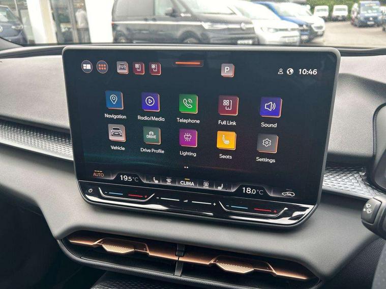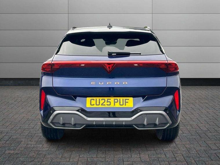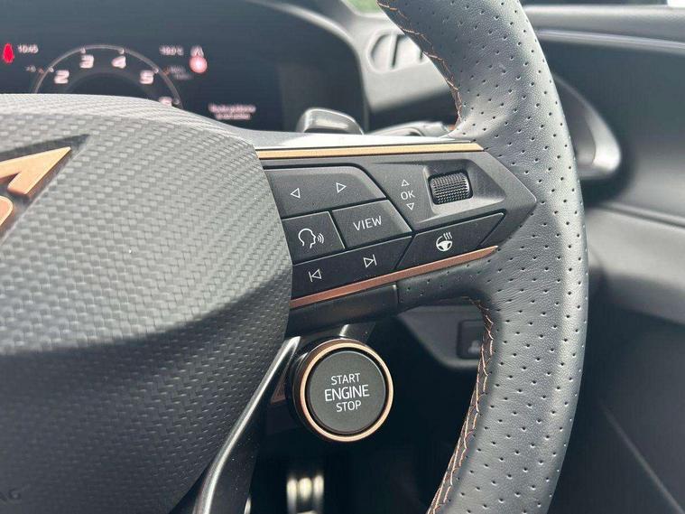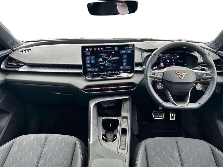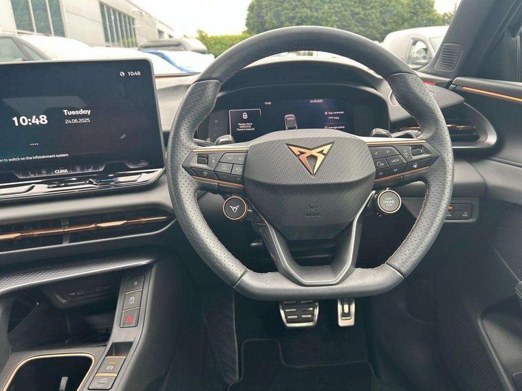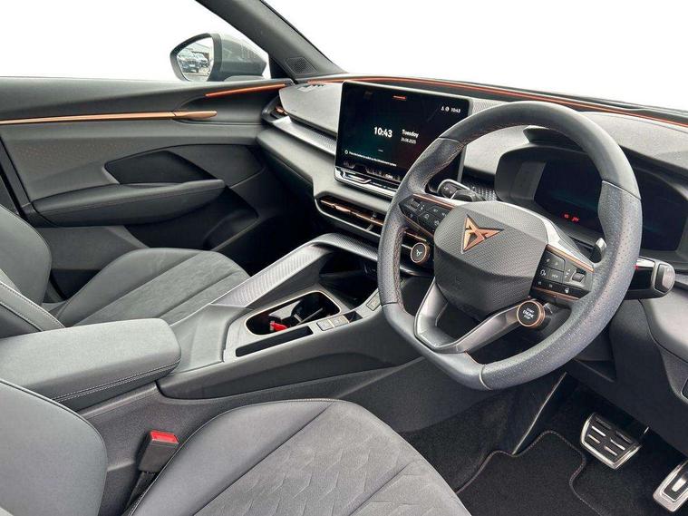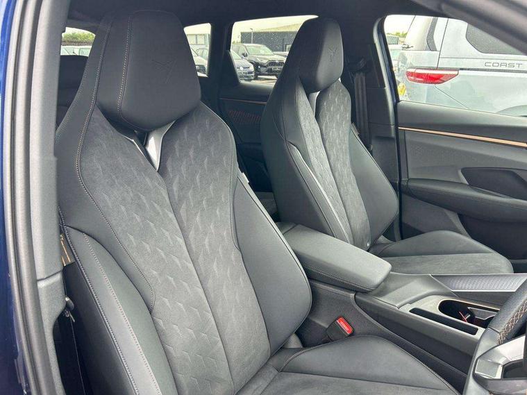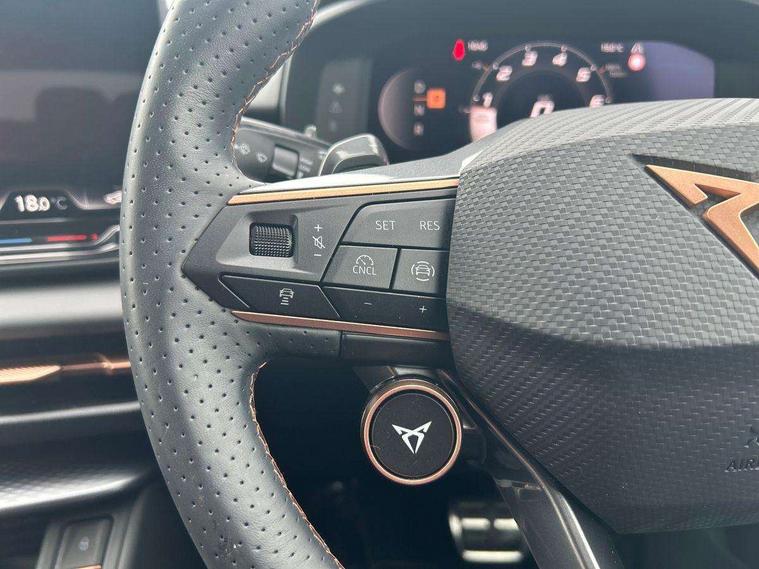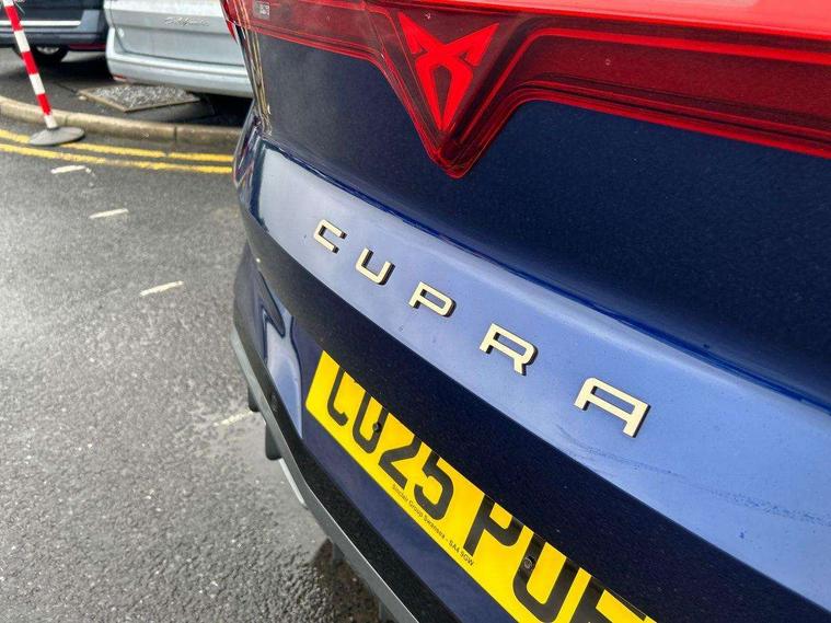10.25" digital cockpit and configurable dashboard, Adaptive cruise control with follow-to-stop and speed limiter, Advanced driver alert system, Advanced lane assist with semi-automatic vehicle control in a medical emergency and traffic jam assist, Driving profile selection and conventional shock absorber, Dynamic road sign display, E-call, Electric tailgate with virtual pedal, Emergency steering support with turn assist, Four x USB Type C ports (2 in front and 2 in rear), Front and rear parking sensors, Front assist (Forward collision warning with automatic braking) with multifunction camera and front cross traffic assist, Head up Display, Intelligent park assist, Media system with Nav - 12.9" touch display, voice control, full link phone (wired/wireless), DAB and Steering wheel mounted controls, Rear traffic assist, Side and exit assist, Speed sensitive power steering, Start/stop system with regenerative braking, Top view camera (front camera, rear camera, 2 side cameras), Wireless phone charger, Auto dimming rear view mirror, Black roof rails, CUPRA 3D rear lights with ceremony & swiping indicator and illuminated logo, Dark tinted rear windows, Daytime running lights with automatic headlight control and Coming and Leaving home function, Door mirrors with memory function and lowing function on passenger mirror, Dynamic headlight range control, Electric front/rear windows, Electrically adjustable, heated and folding door mirrors, Front fog lamps with cornering function, Heat reflecting windscreen, High beam assist, LED headlamps with signature "CUPRA LED", Rain sensing wipers, Rear fog light on one side, back up light on both sides, Rear side wing doors, Rear wash/wipe, Third brake light, Welcome lights (within exterior mirror housing), 3 seat bench in 2nd row, Black roof lining, Cupra sports pedals, Dinamica cloth upholstery, Driver seat memory function, Electrically adjustable front seats including lumbar support, Front and rear head restraints, Front and rear reading lights X 4, Front centre armrest, Heated front seats, Heated leather wrapped multi function sports steering wheel with tiptronic, Illuminated interior front door sills, Isofix, Operating voltage 12V, Single front passenger seat, Smart wraparound interior lighting, Sunvisors with illuminated mirror, Three zone climate control with control panel in rear, Unsplit rear seat bench, split folding backrest, with centre armrest, Variable luggage/load compartment floor, 3 point seatbelts in front with pretensioner and electric height adjustment, 3 point seatbelts on all rear seats, Brake control system - ESC and brake booster, Child proof door locks, Driver and front passenger airbags, Electronic parking brake, Front and rear disc brakes, Front interaction airbag, Front passenger airbag deactivation switch, Front side airbags with curtain airbags, Pre-crash front and rear seat belt tensioner, window closure and hazard lights, Tyre pressure monitoring system, Visual and acoustic seat belt reminder, electric contact in front and rear, Anti theft alarm, Keyless locking and starting system with keyless access, Locking wheel bolts, Black decorative trims, Chrome interior detailing, 19" Spectrum exclusive machine alloy wheels, Tool kit,