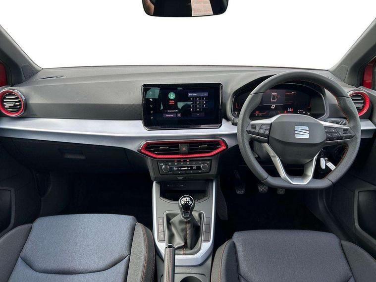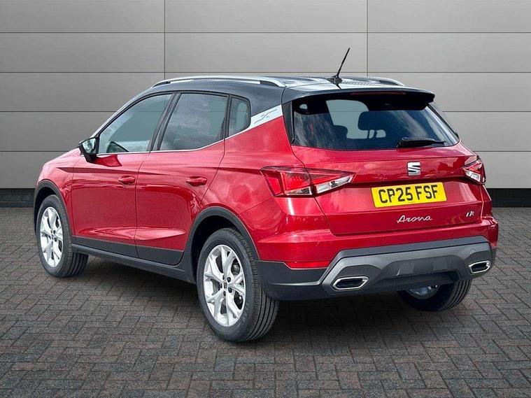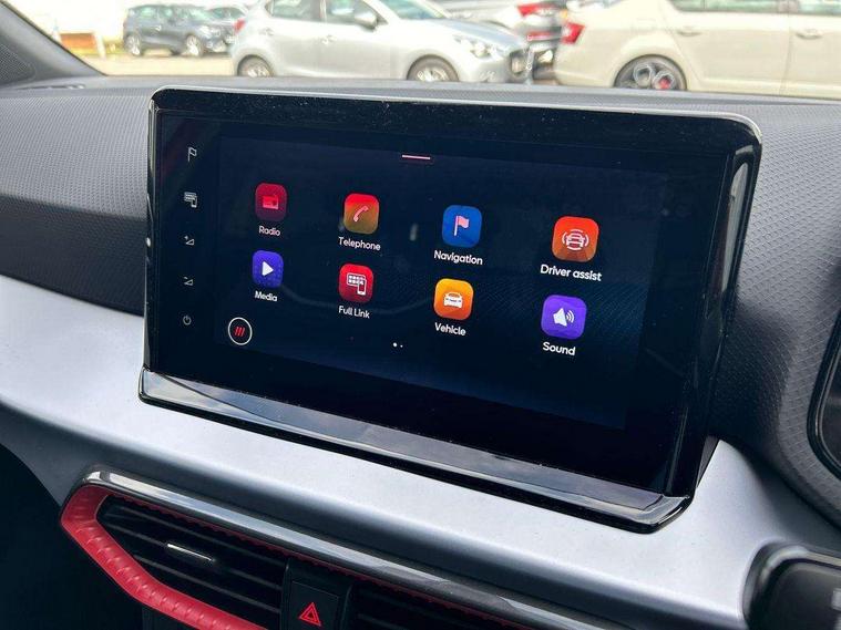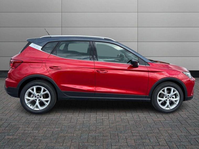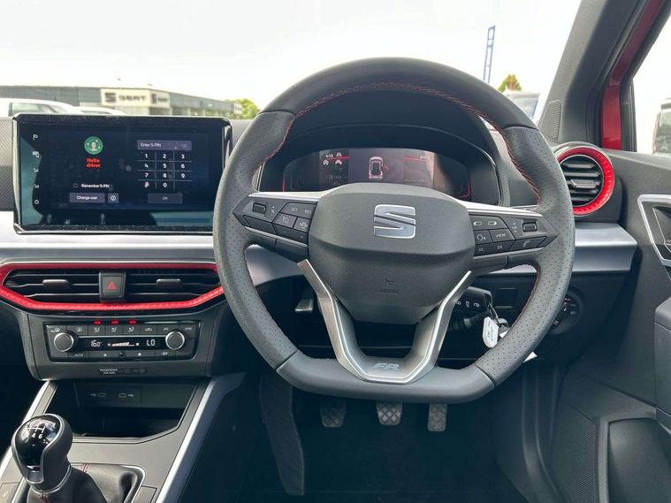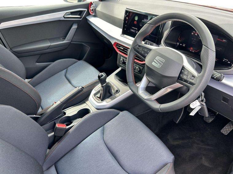 'Lights On' Reminder warning buzzer, 8" Digital cockpit, Digital clock, E-call, Electric speed sensitive power steering, Full link smartphone integration with mirror link, wireless apple carplay, Google android auto + USB Type C cable for apple and android devices, Lane keeping system, Low fuel warning light, Outside temperature display, RPM counter, SEAT Drive profile - Four different models normal-sport-eco-individual, steering response, throttle response, Trip computer, Wireless phone charger, 6 speakers, 9.2" colour touchscreen with navigation system, voice control and USB port (type c), Bluetooth interface for hands free and audio streaming, DAB digital radio and AM/FM radio, Steering wheel mounted audio controls, Anti theft roof antenna, Auto dimming interior rear view mirror, Automatic activation of hazard warning lights, Body coloured bumpers, Body coloured door handle inserts, Chrome roof rails and window surrounds, Dark tinted rear windows, Electric front/rear windows, Electrically adjustable, heated and folding door mirrors, Front fog lights with cornering function and rear fog light, FULL LED automatic headlights with dynamic headlight range control, coming and leaving home, LED daytime running lights, LED rear tail lights and licence plate lights, Protective side mouldings, Rain sensing wipers, Rear side wing doors, Rear spoiler, Rear window wash/wipe, Roof colour door mirrors, Third brake light, Twin exhaust pipe styling hidden exhaust pipe, Visible VIN plate, 2 cupholders, 3 seat bench in 2nd row, 60/40 split folding rear seat, Aircare filter, Black interior roof, Cloth upholstery, Double boot floor, Driver sunvisor with covered mirror + card holder, Dual zone climate control, Front courtesy light with front reading lights, Gear shift indicator, Height adjustable front seats, Height/reach adjustable steering column, Illuminated air vent surrounds, Illuminated boot, Instrument lighting with brightness control, Interior ambient lighting, Interior light in footwell, central console and door panel, ISOFIX points in outer rear seats with top tether anchorage points, Passenger sunvisor with vanity mirror, Perforated flat bottomed leather steering wheel/gear knob/handbrake with red stitching and FR logo, Potentiometer, Single front passenger seat, Two front and three rear height adjustable headrests, Interior chrome pack - Arona, Safe and driving pack (S) - Arona, 3 point seatbelts on all rear seats, ABS, Active front headrests, Child locks on rear doors, Driver and front passenger airbags with front passenger airbag de activation, front side and curtain airbags, Emergency Brake Assist (EBA) and front assist, Front and rear seatbelt reminder, Hill hold control, Multi-Collision braking, Tiredness recognition system, Traction control, Tyre pressure monitoring system, Alarm with back up horn with tow away protection, Deadlock, Electronic engine immobiliser, Locking wheel bolts, Remote central locking, Titan black dashboard, 17" Dynamic alloy wheels,