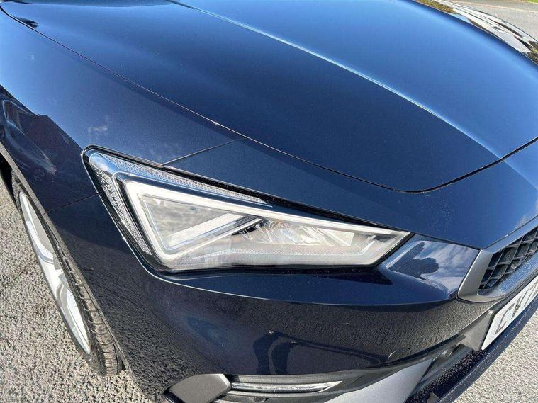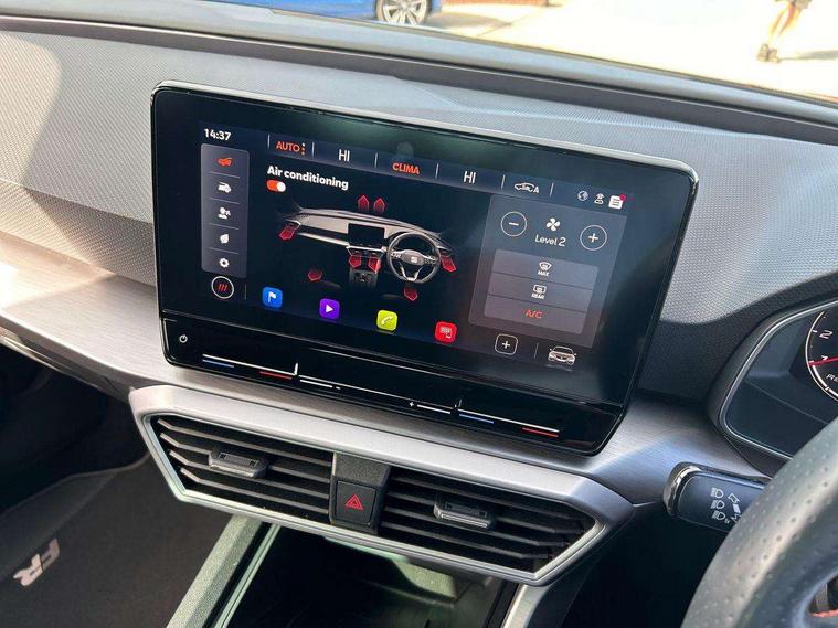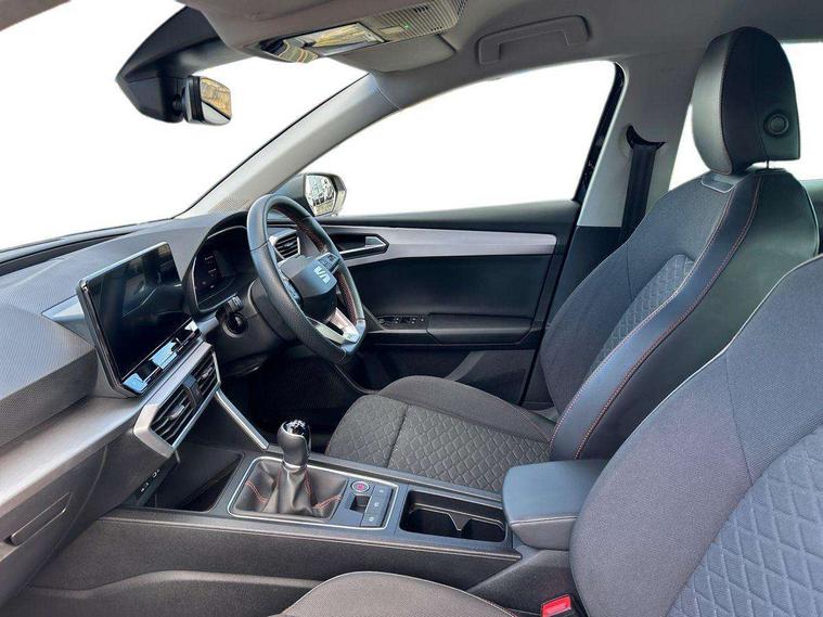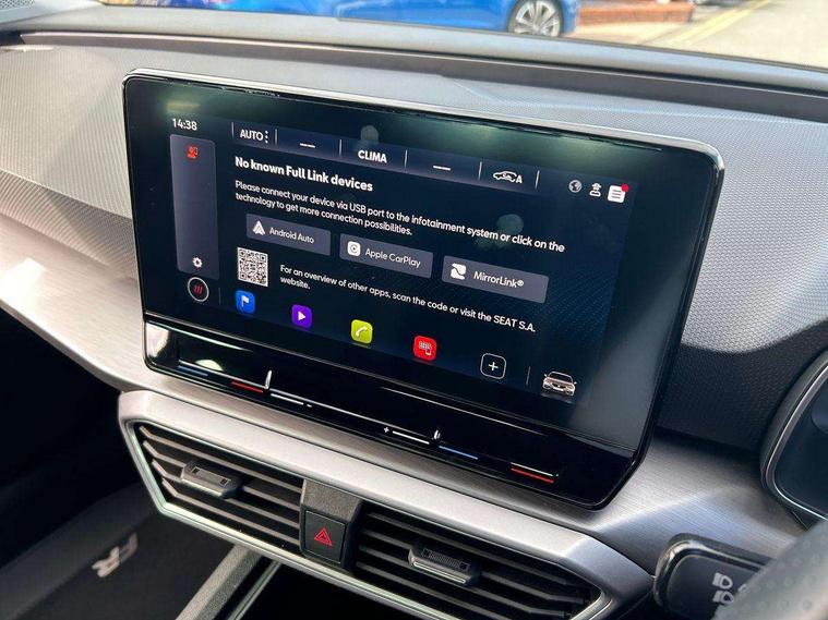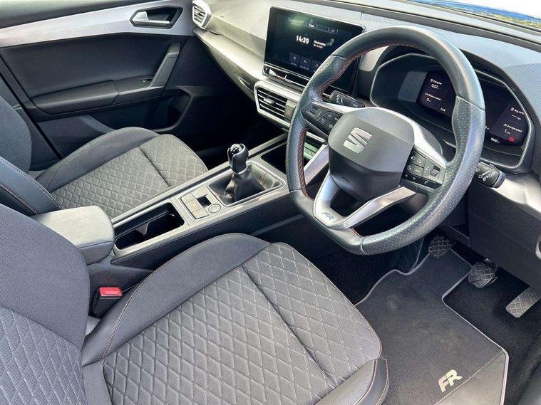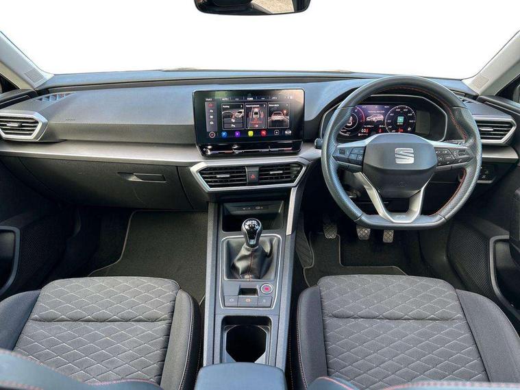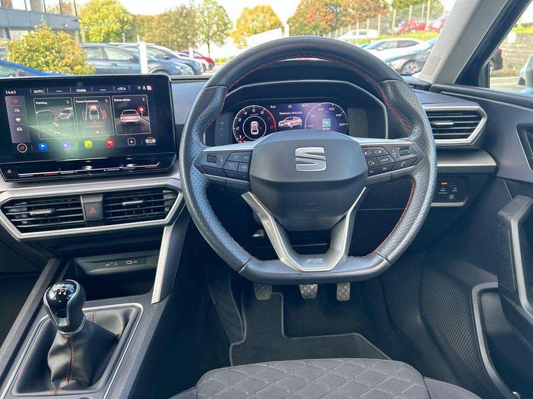Digital cockpit, E-call, Four x USB Type C ports, Front assist with forward collision warning braking reaction to vehicles, pedestrians and cyclists, Full link smartphone integration with Mirror Link, wireless Apple CarPlay and wired Google Android Auto, Lane assist, Lockable tailgate, Park assist (inc front/rear parking sensors), Power assisted speed sensitive electro-mechanical steering, RPM, trip computer, outside temp gauge, instrument light brightness, low fuel warning light, lights on reminder, gearshift indicator, SEAT drive profile with 4 modes (Eco/Normal/Sport/Individual), throttle response, Service interval indicator, Start/stop system with regenerative braking, Sports suspension, XDS electronic differential lock and dynamic traction support, 7 speakers, Auxiliary input socket, Auto dimming rear view mirror, Body colour door handles, Body coloured bumpers, Cosmo grey exterior mirrors with integrated LED indicators, Dark tinted rear windows, Dynamic headlight range control, Electric front/rear windows, Electrically adjustable, heated and folding door mirrors, FR sports bumper, Illuminated front door sill, LED front fog lamps with cornering function, LED Headlights with dynamic turn signals, LED tail lights and rear fog lights with rear coast to coast lighting, Rain sensing wipers, Rear side wing doors, Rear wash/wipe, Separate daytime running light with automatic headlight control and coming home feature, Third brake light, Welcome light silhouette from exterior mirrors, 12v power point in centre console, 3 seat bench in 2nd row, 60/40 split rear bench seat with armrest, Ambient lighting with glovebox, footwell and single monocolour, Driver/passenger manual seat height adjustment, Dust/pollen filter, Flat bottomed perforated leather steering wheel with red stitching and FR logo and leather gear stick, Folding boot cover, Front and rear height adjustable headrests, Front and rear reading lights X 4, Front centre armrest, Front seatback storage pockets, Height/reach adjust steering wheel, ISOFIX points in outer rear seats with top tether anchorage points, Luggage tie-down hooks, Lumbar adjustment for front seats, Single front passenger seat, Sunvisors with covered illuminated mirror, Three zone climate control, Two tone cloth upholstery, Media system plus with navigation - Leon, 3 point seatbelts on all rear seats, ABS, Brake control system - ESC and brake booster, Child proof door locks, Driver and front passenger airbags with front passenger airbag de-activation, front side and curtain airbags, Electronic parking brake, Extended safety system - seat belt tensioner, window closure and hazard lights, Hill hold control, Rear disc brakes, Seat belt reminder for front and rear seats, Tiredness recognition system, driver alert system, Tyre pressure monitoring system, Anti theft alarm system with interior monitoring in cab, backup horn and towing protection, KESSY Go (Keyless start), Locking wheel bolts, Wireless phone charging, Chrome interior detailing, 17" Dynamic Bi-spoke alloy wheels with 91W tyres, Tool kit,