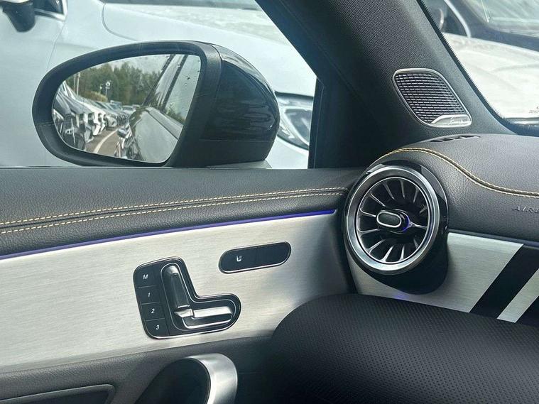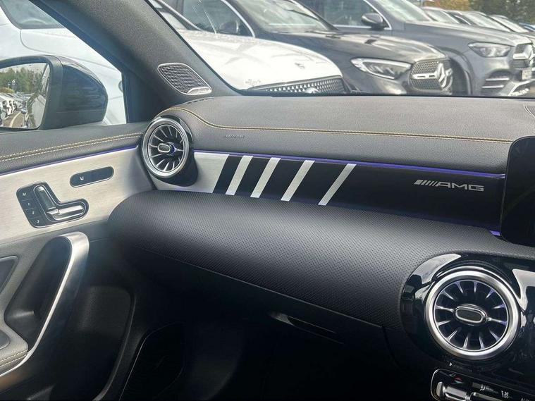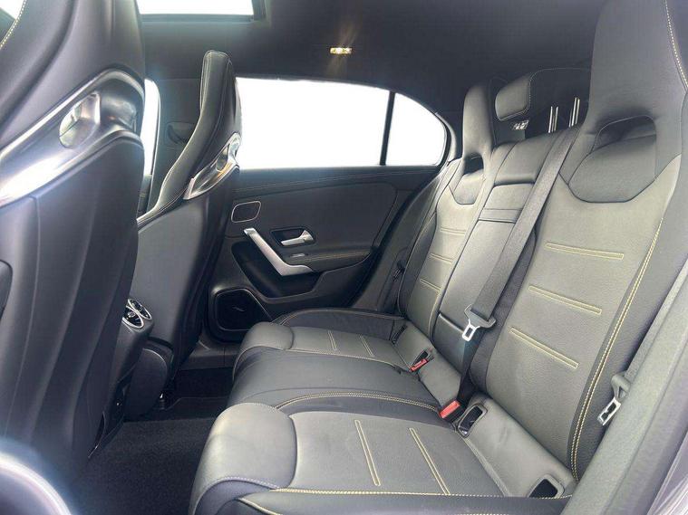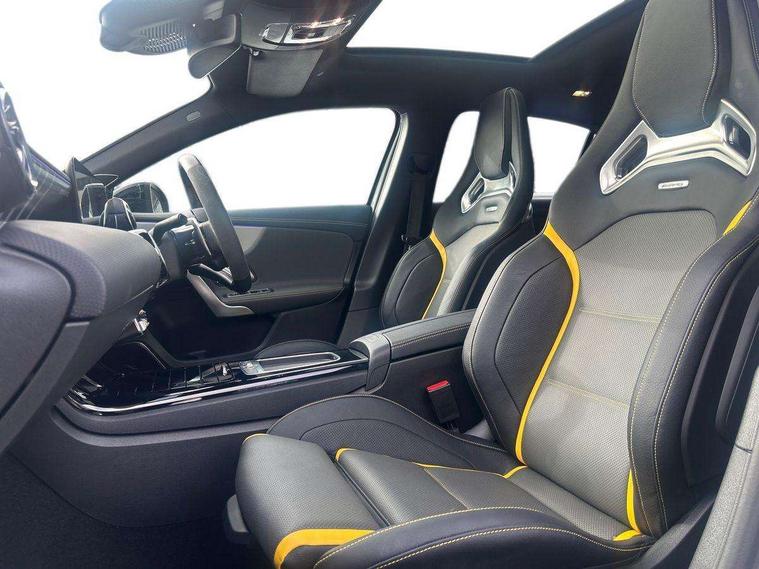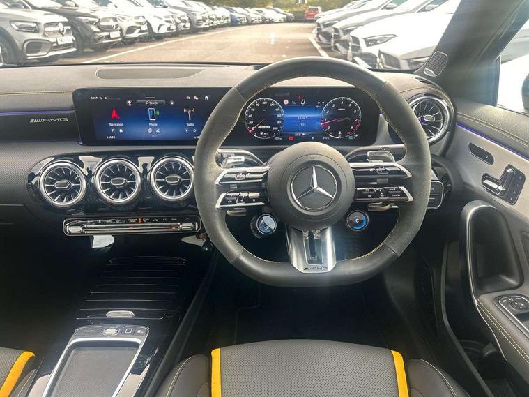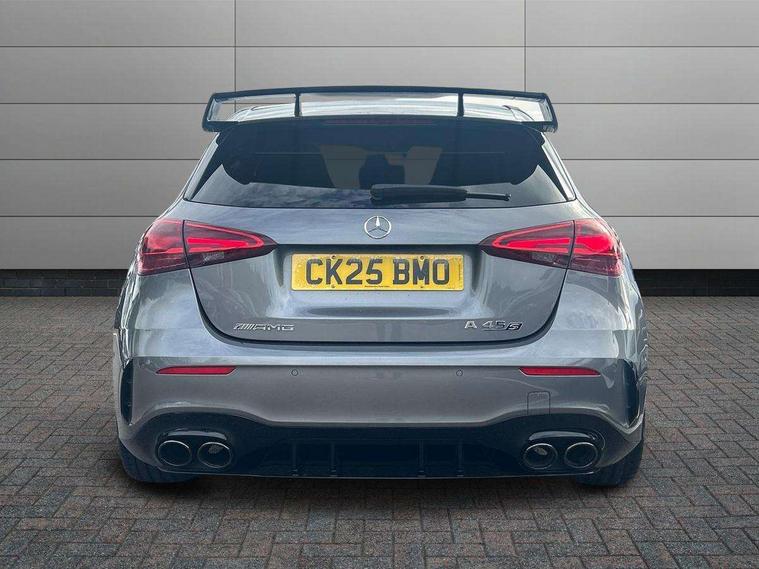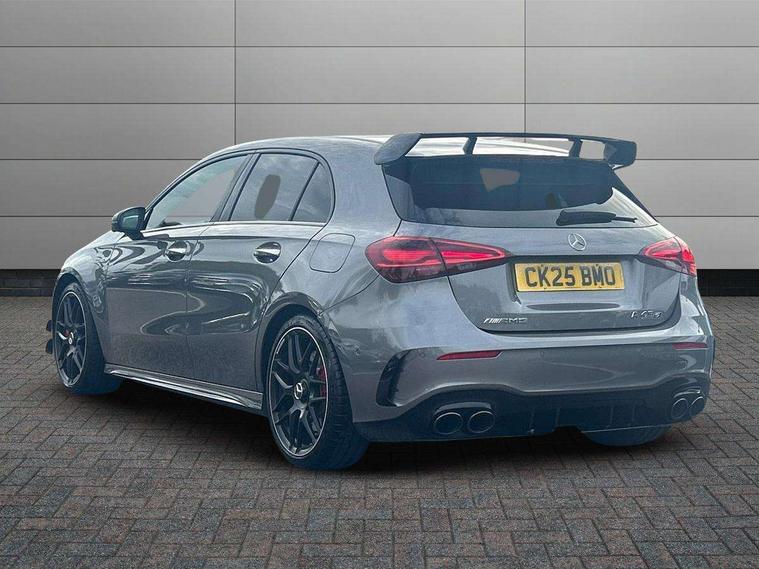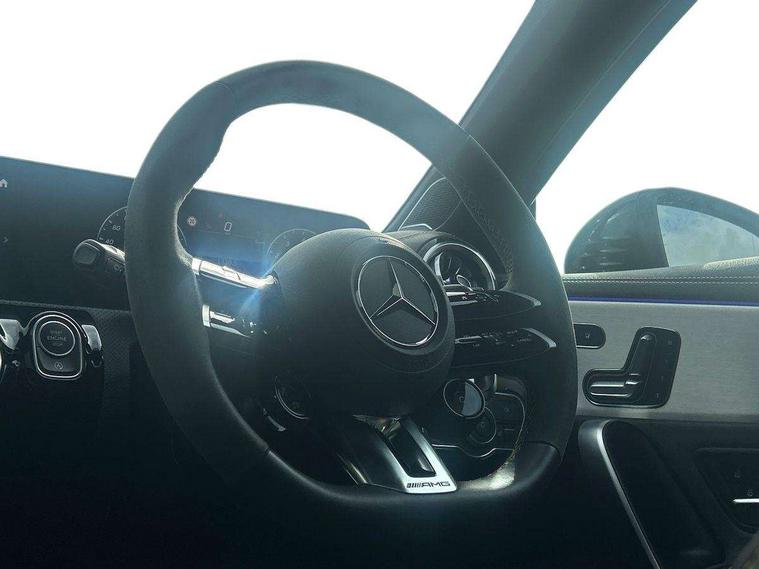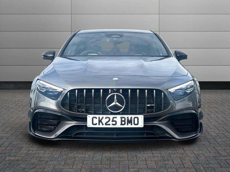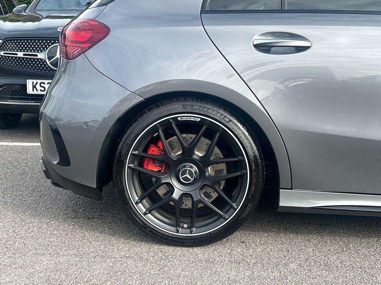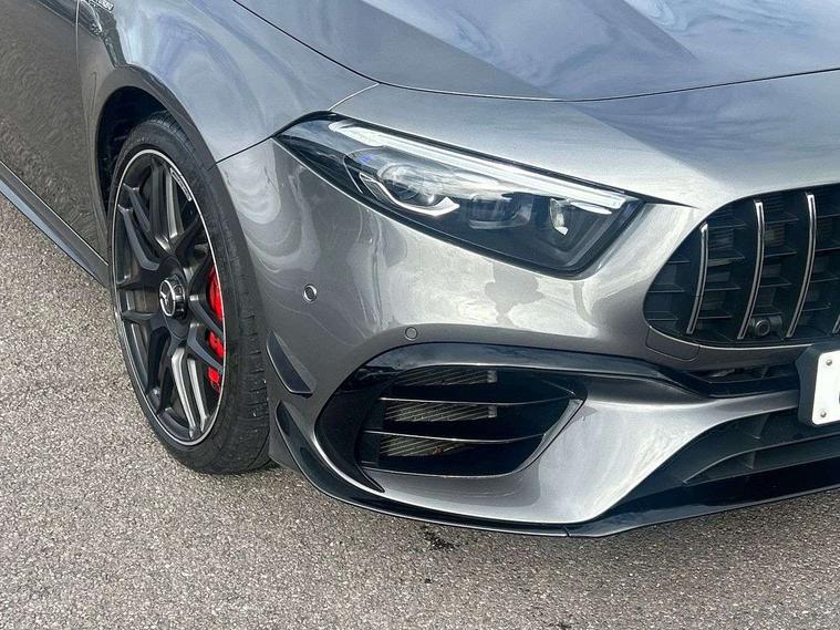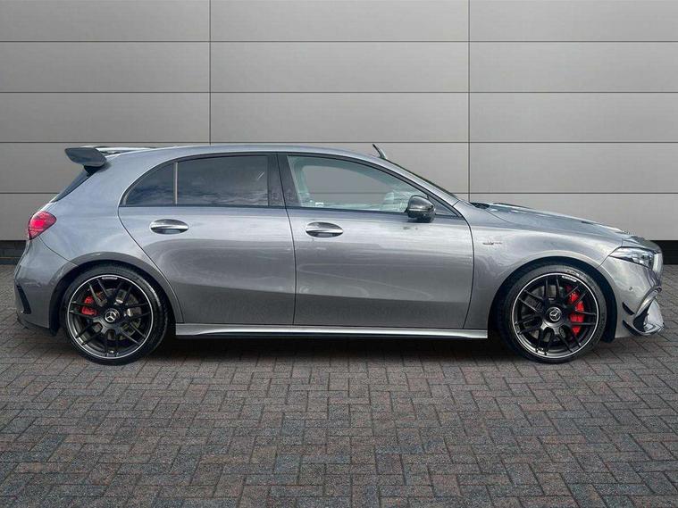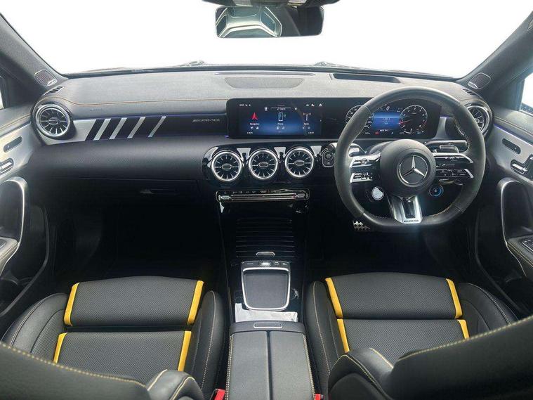 10.25 inch touchscreen central media display with AMG specific, AMG start up logo, visualisation of the AMG drive programs, vehicle and engine data, 10.25" Digital instrument cluster display screen, AMG DYNAMIC SELECT with drive modes(Slippery, Comfort, Sport, Sport+, Individual and Race) incl drift mode via steering wheel shift paddles+Race Start, AMG menu with sporty additional information - Gear indicator with yellow M symbol manual mode, Warm Up menu and Set Up menu, AMG speed sensitive steering with two sets of steering characteristics, Attention assist, Brake pad wear indicator warning light, Car wash mode, Direct steering, Dual bluetooth interfaces, ECO start/stop function, Engine start/stop button, Fingerprint scanner, Fluid level warning indicator for fuel, oil, coolant and washer fluid, Fluorescent jacket for driver, Hard-disk navigation, Head up Display, Hey Mercedes Voice activation, Lamp failure indicator, MBUX augmented reality for navigation, MBUX Interior assistant, Mercedes me connect including emergency call system, accident recovery, breakdown and maintenance management, Mercedes me remote services, Outside temperature gauge, Owners manual in English, Pre-installation of private car share, Remote boot closing, Service indicator (ASSYST), Smartphone integration with Apple CarPlay and Android auto, Speed sensitive power steering, Tailgate, Traffic sign assist, Trip computer in multifunction display with current consumption indicator, Wireless charging, AMG performance 4MATIC+ with torque control, AMG suspension including AMG specific axles and sporty spring/damper setup, Suspension with adaptive damping system, Burmester surround sound system (590W) with Dolby atmos, speakers - 1 center+4 doors+2 in C pillars, tweeter, subwoofer, DSP amp, burmester lettering, DAB Digital radio, MBUX multimedia system, 4 Electric Front and Rear windows, Adaptive brake lights, AMG A45 S bodystyling -rear apron, four vertical fins, side sill panels, roof spoiler lip, specific front apron, diffuser look and S label on boot lid, AMG real performance exhaust sound system, AMG specific radiator grille in high gloss chrome with AMG lettering, Beltline strips in High gloss Black, Body colour bumpers, Body colour door handles with chrome inserts, Body colour side skirt, Electric adjustable and heated door mirrors with integrated LED side indicators, Headlamp assist automatic headlamp activation, Heated glass rear windscreen + timer control, LED daytime running lights, LED High level third brake light, LED tail lamp, Multibeam LED headlamps with adaptive highbeam assist and cornering function, Panoramic sliding sunroof, Privacy glass, Radio aerial, Rain sensing windscreen wipers with two sensitivity settings, Rear fog lights, Rear side wing doors, Rear windscreen wiper, Surround lighting with logo projection, Two round twin tailpipe trim elements each measuring 90 mm in diameter and AMG lettering plus ribbing on the inside of the pipe, Valve control dependent on drive program, Wider wheel arches for AMG wheels, Window line trim strip in black, 3 seat bench in 2nd row, 3 Spoke flattened lower section sporty design AMG Performance steering wheel in nappa leather/microcut microfibre, 40:20:40 split folding rear seats, Air conditioning - Two zone thermotronic luxury automatic climate control with display, AMG brushed stainless steel sports pedals with rubber studs, AMG centre console finished with trim in silver chrome, AMG floor mats, AMG performance seats, AMG sporty centre console with raised front section and integral control switched for manual transmission mode, AMG steering wheel buttons, Automatic child seat recognition sensor, Black air vents with surround in silver chrome, Black roof lining, Electrically adjustable front memory seats including lumbar support and backrest inclination, Front centre armrest with stowage, Front seat head restraints, Height/reach adjustable steering column, Illuminated AMG front door sills with changeable cover, Interior lighting - 64 colour Ambient lighting, Interior mirror with reading lamps in black and frameless, Rear armrest with 2 cupholders, Rear head restraints, Seat occupancy sensor for front passenger seat, Silver coloured aluminium gear shift paddles on steering wheel, Single front passenger seat, Stowage compartment in centre console with retractable cover, Sunvisors with illuminated vanity mirrors, Twin front cupholders, Aerodynamic pack - A Class, AMG Driver's pack - A Class, AMG night pack - A Class, AMG performance high-end seat pack - A Class, Light and sight package - A Class, Mirror package - A Class, Multi-contour seat pack - A Class, Parking pack with 360 degree camera - A Class, Seat comfort pack - A Class, USB pack plus - A Class, Winter pack - A Class, 3 rear 3 point seatbelts, 3 stage electronic stability programme, ABS with Brake Assist, Active bonnet, Adaptive brake assist with hold function and hill start assist, AMG high performance brake system with red painted brake callipers and black AMG lettering at the front, ventilated and perforated brake discs, Black seatbelts, Bonnet with power domes, Childproof locks manually operated for rear doors and electrically operated for rear power windows, Crash responsive emergency lighting, Driver and passenger head and side airbags, Drivers knee airbag, Dual stage driver/passenger airbags, Electronic parking brake, ESP curve dynamic assist, ESP with ASR, Exit warning, Front and rear seatbelt reminder, ISOFIX and top tether child seat fixing points in two outer rear seats, Tyre pressure monitoring system, Warning triangle and first aid kit, Window airbags, Alarm system/interior protection/immobiliser, Guard 360 degree vehicle protection, Keyless entry lock/unlock, Keyless Go, Remote central locking and crash sensor with emergency opening function, Aluminium AMG design black/silver interior trim, 19" AMG cross spoke forged wheels painted in matt black with high sheen rim flange, Summer tyres, Tiref