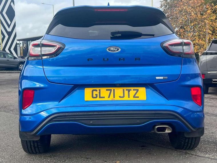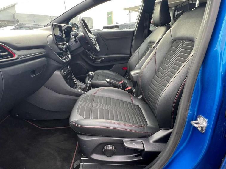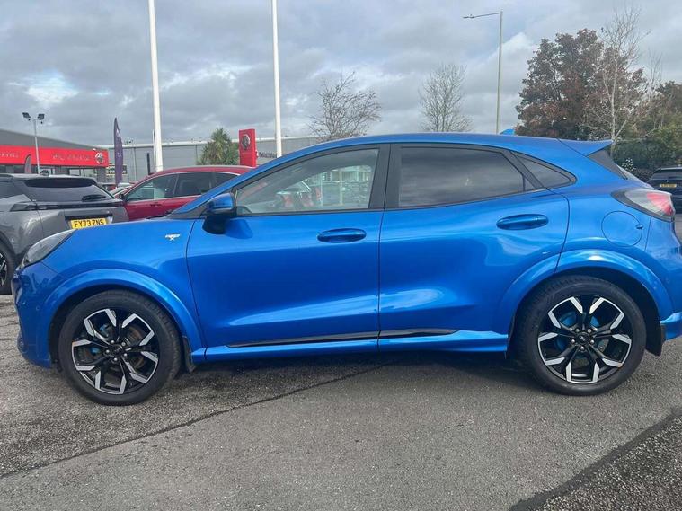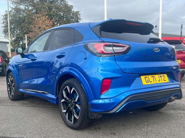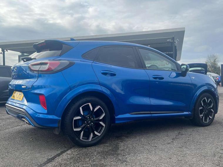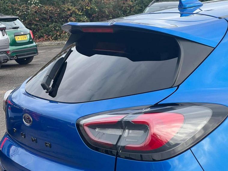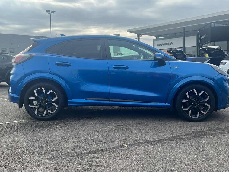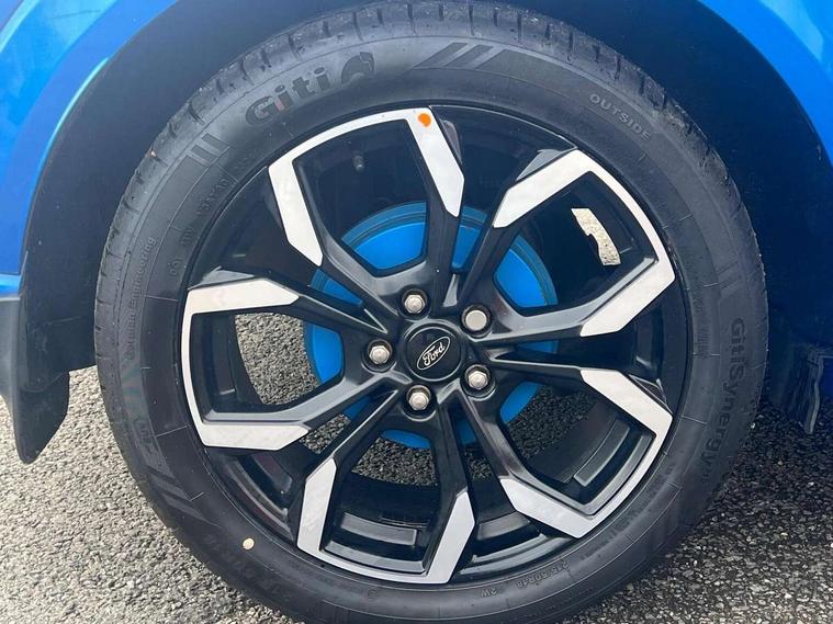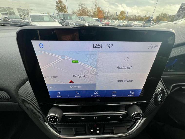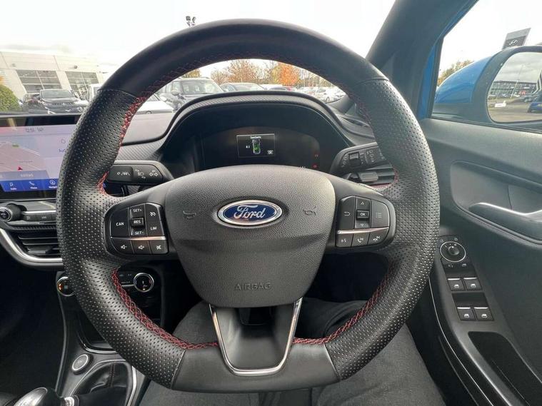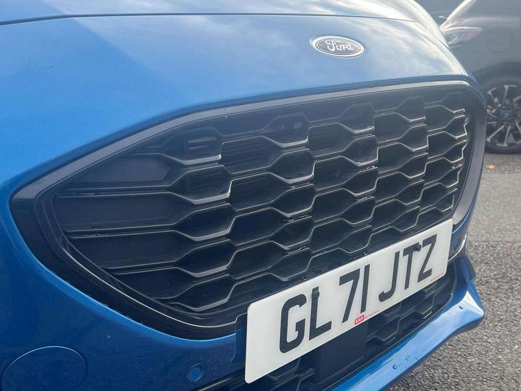 Ford easy fuel, Full digital 12.3" instrument cluster, Power assist steering, Power start button, Rear parking sensor, Selectable drive modes(Normal, sport, Eco, trail, slippery), Wireless charging pad, Automatic rain sensing wipers, Body coloured door mirrors, Front fog lights with cornering lights and LED rear lamps, Power foldable heated door mirrors with puddle lamps, Privacy glass to side rear windows and tailgate glass, Quickclear heated windscreen, Rear wiper, ST-Line body kit with large rear spoiler wth sports suspension, Centre console with armrest and stowage, Driver and passenger seat lumbar and height adjust, Ford megabox extended bootspace, Front and rear floor mats, Front and rear head restraints, Manual air conditioning, Sensico partial premium upholstery, ST-Line flat bottomed sensico leather steering wheel with leather handbrake and aluminium gear knob, Wireless charging pad with electronic air temperature control (EATC), B&O Premium Audio system + Ford SYNC 3 navigation pack - Puma, Driver assistance pack with Lane departure warning - Puma, 3 rear seatbelts, Electronic stability control (ESC) and hill start assist, Pedestrian/cyclist detection & post-collision braking, Tyre pressure monitoring system (TPMS), Thatcham alarm, Carbon look interior deco spears,