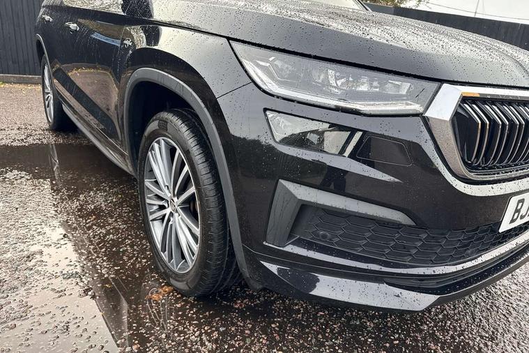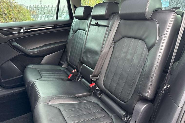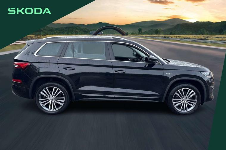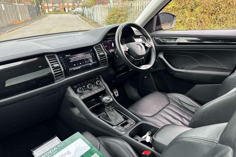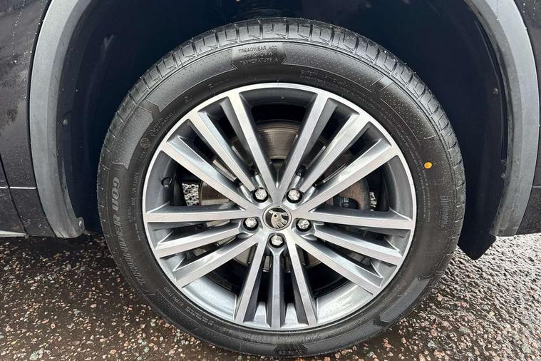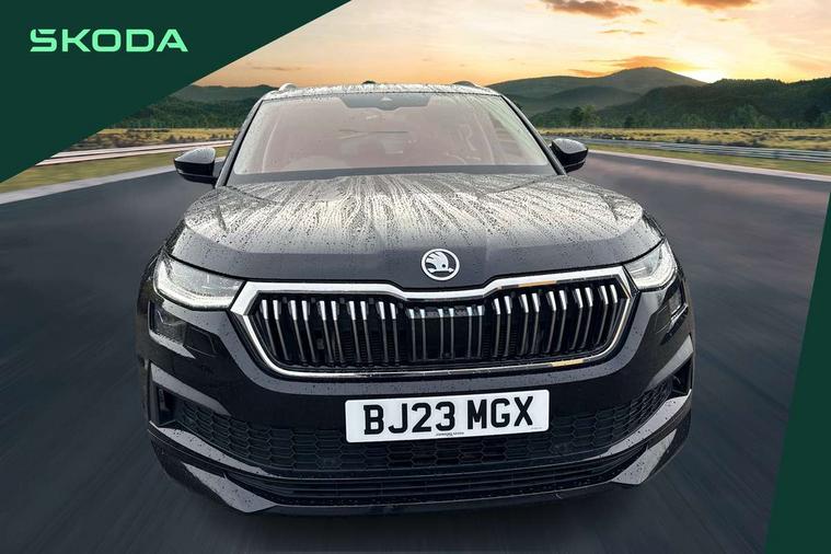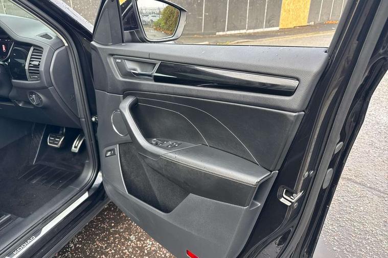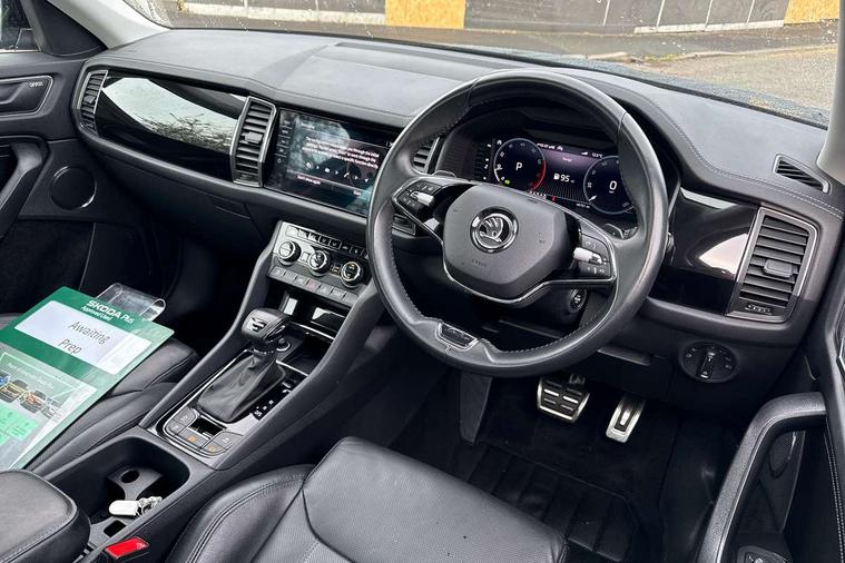 Area view, Blind spot detection system, Bluetooth system, Columbus satellite navigation with 9.2" touchscreen, integrated Wi-Fi, web radio, Digital voice enhancement, e call+, ECO Stop/start function, Exterior temperature indicator, Progressive steering, Smartlink wireless for apple carplay and wired for android auto, Speed limiter, Tailgate unlocking from outside, USB C Port x 2 in front centre console, Virtual Cockpit - 10.25" digital display, Wireless charging, Canton sound system, DAB Digital radio, Aero front windscreen wipers with intermittent function, Aero rear window wiper, Auto dimming rear view mirror, Black wheel arch surrounds, Body colour bumpers, Body colour door mirrors and handles, Body colour door panels, Chrome front grille, Chrome roof rails with chrome window surround, Electric adjustable/heated/folding door mirrors, driver side auto dimming with boarding sports and memory function, Electric front and rear windows, Extended rear spoiler with finlets in gloss black, Front fog lights, Full LED matrix headlights with AFS (adaptive front light system), cornering function and AWL (all weather lighting system), Headlight washers, Heated rear window, Invisible tailpipe, L&K front and rear bumpers including lower rear chrome strip, LED daytime running lights, LED rear fog light, LED third brake light in rear spoiler, Light assistant (coming/leaving home/tunnel light), Off-road style lower front bumper element, Panoramic sunroof, Privacy glass, Rain and light sensors, Rear LED lights (high functionality) with welcome effect and dynamic indicators, Rear side wing doors, Safety reflectors on front and rear doors, Window control switches with black trim, Without engine designation, 12V socket in boot, 2 rails with 2 hooks, 2 seat bench in 3rd row, 3 seat bench in 2nd row, 4 foldable roof handles with rear coat hooks, 60:40 foldable rear seat with sliding adjustment and backrest angle adjustment, Aluminium pedals, Bottle holders in door panel in the 1.5 litre front and 1 litre rear, Cargo storage compartments, Chrome headlight control button, Chrome interior door handles, Coat hooks on B pillar, Covered storage compartment on driver side, Decorative door sill covers, Front centre armrest with storage compartment, cup holder and 12V socket, Front courtesy lights, Gear shift lever with chrome frame and black gloss insert, Grey stitching in front and rear armrests and door armrests + door inserts, Height adjustable front headrests, Illuminated and cooled glovebox, Illuminated luggage compartment, Isofix child seat fittings in outer rear seats with top tether, Manually adjustable steering column, Net programme in boot (1x horizontal Net, 2x vertical Nets), Overhead glasses storage compartment, Pollen filter, Rear centre armrest with cupholders, Single front passenger seat, Sliding trunk cover, Small Bags on the inner sides of the front backrests, Sunvisors with illuminated vanity mirrors, Three rear height adjustable headrests, Ticket holder on A Pillar, Umbrella in door panel, Variable boot floor, LED Interior light pack - Kodiaq, Auto door release and activation of warning lights in the event of an accident, Child locks on rear doors, Driver and front passenger airbag with knee airbag and front passenger airbag deactivation, Electronic parking brake with hill start assist, Emergency rear braking signal, ESC (incl. ABS+MSR+ASR+EDS+HBA+DSR+RBS+MKB), Front assist with autonomous emergency braking, Front side airbags with curtain airbags, Fuel cut off safety device, Height adjustable front 3 point seatbelts + pretensioners, Hill hold control, Rear disc brakes, Safety vest holder in door, Seat belt reminder for all seats, Three point rear seat belts, Two tone horn, Tyre pressure monitor, Alarm with interior monitoring and tilt sensor with safe function, Anti-theft wheel bolts, Immobiliser, Keyless entry and start system (KESSY), Remote central locking with 2 keys, Grey stitching in dashboard, Piano black decorative inserts, Plaquette L&K front fenders, Temporary spare wheel (space saver),