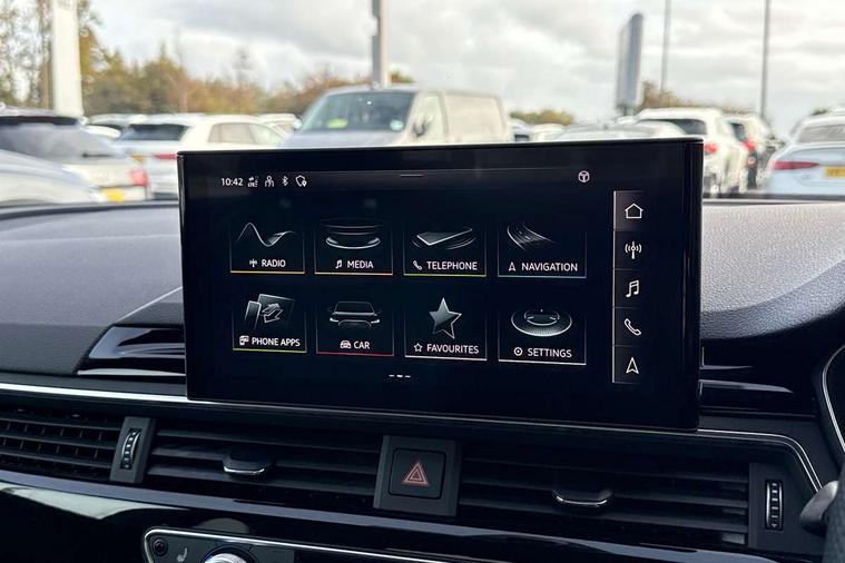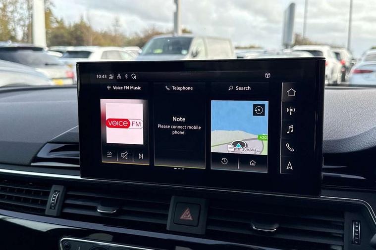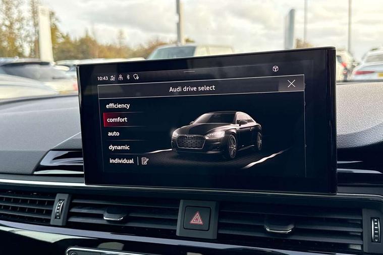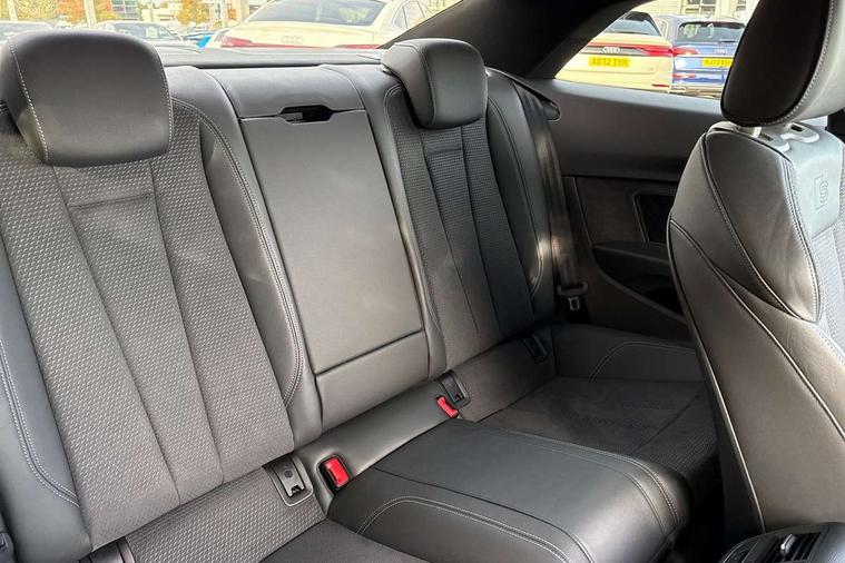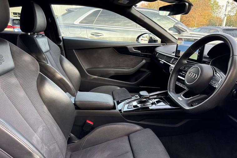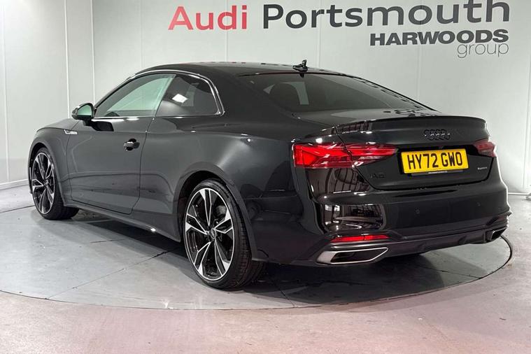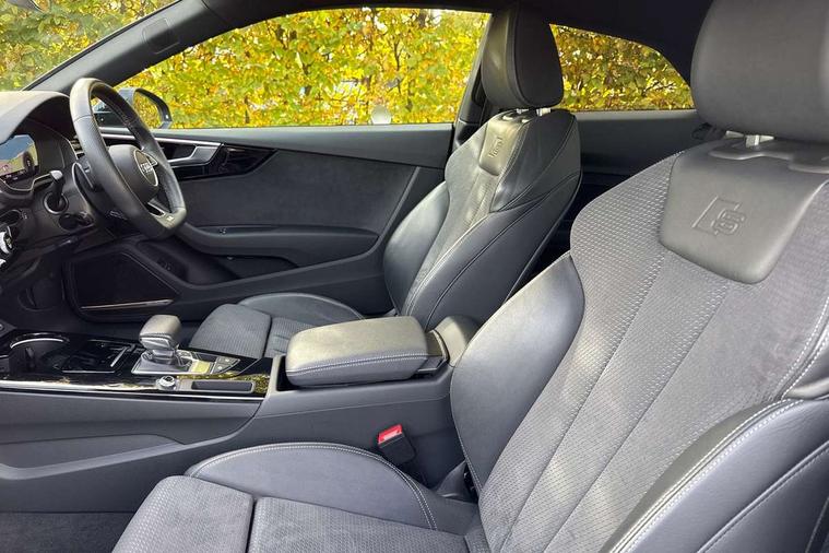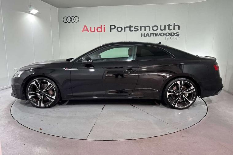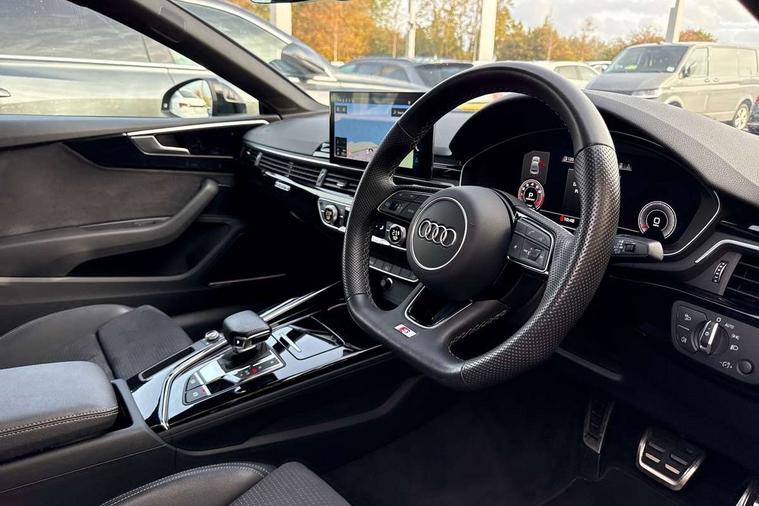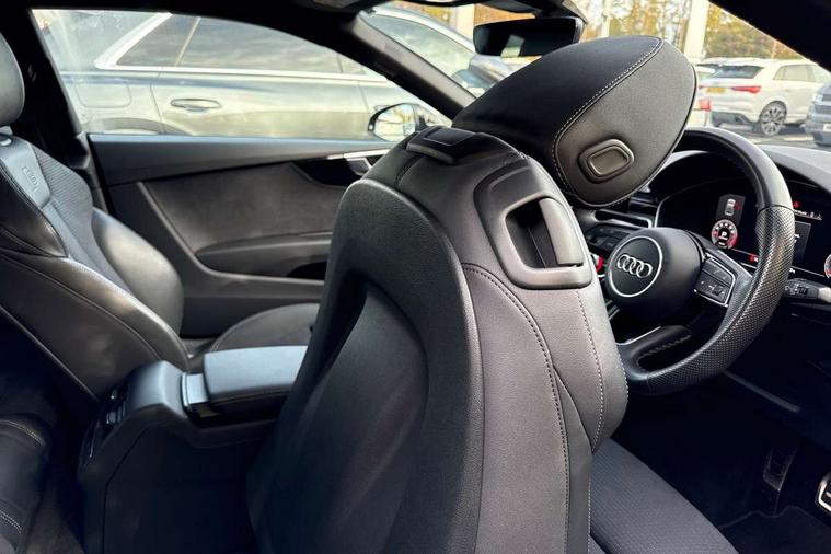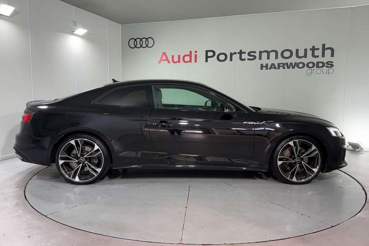 Audi connect safety and service (e-call), Audi connect with Amazon Alexa Integration, Audi drive select (Auto, Comfort, Dynamic, Efficiency and Individual), Audi parking system plus with front and rear sensors, Audi smartphone interface, Audi virtual cockpit - 12.3" full colour digital instrument cluster, vehicle/engine speed, Radio/media information+Driver assistance systems, Automatic start-stop system with coasting functionality and efficiency programme, Bluetooth interface, Electric boot lid release, Electro-mechanical power steering, Email, calendar and text messages displayed via MMI, MMI nav+ with MMI touch - 10.1" high resolution MMI display, touch sensitive, 3D map, route/country info, dynamic route guide, personal route assist, Rear view camera, Service interval indicator, Voice control system, Sports suspension lowered by 23mm, 8 passive loudspeakers, CD player, DAB digital radio reception, Two additional USB ports for rear passenger in rear centre console, Two SDXC card slots, Audi matrix LED headlights with LED rear lights + dynamic front and rear indicators, Auto dimming door mirrors, Auto dimming rear view mirror, Black door mirror housings, Body colour door handles, Body colour front spoiler lip, Body colour side sill trim, Electric adjustable heated door mirrors, Electric folding door mirrors, Electric front windows, Front and rear bumpers with side skirts, Front fog lights, Honeycomb structure radiator grille in grained matt black, Kerb-view function for passenger side, LED daytime running lights, LED side indicator lights integrated into door mirrors, LED third brake light, Matt aluminium silver tailpipe trim, Privacy glass, Rain and light sensors, Rear boot, Rear diffuser in matt titanium black with trim strip in matt aluminium silver, Rear side wing doors, S model rear spoiler in black, Side air inlets in grained matt black with matt aluminium silver inlay, Variable front intermittent wipers, Windscreen with acoustic glazing, 2 seat bench in 2nd row, 4 way electric lumbar support for driver and front passenger, 40/20/40 split folding 2 seater rear seat bench with rear centre armrest, Adjustable steering column, Black cloth headlining, Black perforated leather gearknob, Contrast stitching on seats, steering wheel and gear lever gaiter, Deluxe 3 zone electronic climate control, Front centre armrest, Front head restraints, Front/rear floor mats, Heated front seats, Illuminated door sill trim with S logo, ISOFIX child seat mounting and top tether, Luggage compartment mat, Manual seat adjustment, Rear headrests, Single front passenger seat, Stainless steel pedals, Sunvisors with vanity mirrors, Black styling pack - A5 Coupe/Sportback, LED interior light pack - A5/RS5, 2 x 3-point rear seatbelts, 6 airbags - Driver, front passenger, curtain and side airbags, Electromechanical parking brake, Electronic Stabilisation Control (ESC) including ABS, ASR and EDL, Front passenger airbag deactivation, Height adjustable front seatbelts, Hill hold assist, Multi collision brake assist, Pop-up bonnet for pedestrian protection, Pre sense city, Seatbelt monitoring, Tyre pressure warning, Variable restraint system, Warning triangle and first aid kit, Anti theft alarm system, Anti theft wheel bolts, Immobiliser, Keyless Go, Remote central locking, Piano black finish inlay, 20" 5 twin spoke polygon design alloy wheels in gloss anthracite black and gloss turned finish, Tool kit, Tyre repair kit,