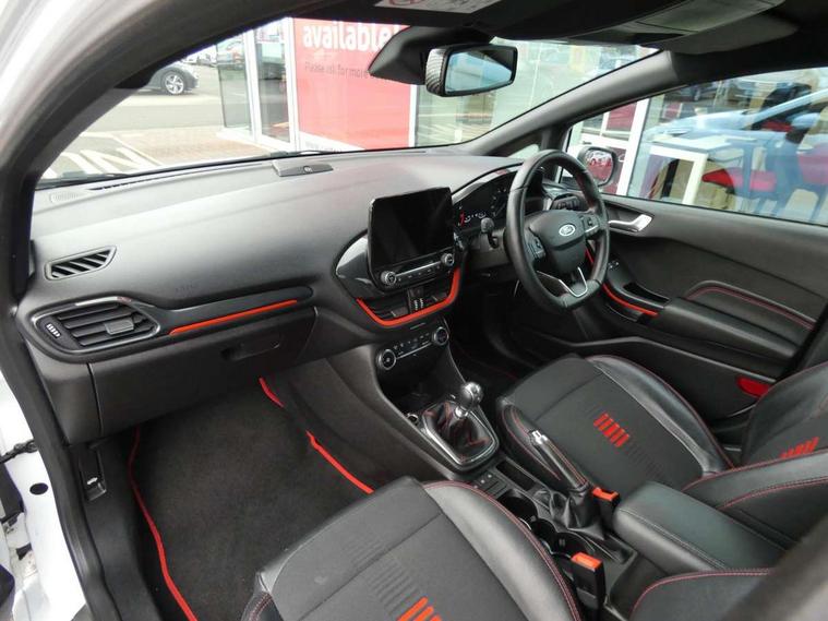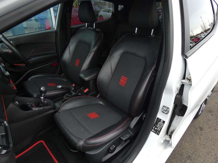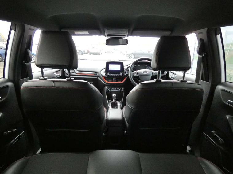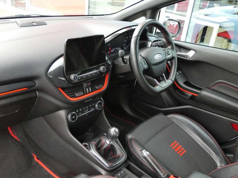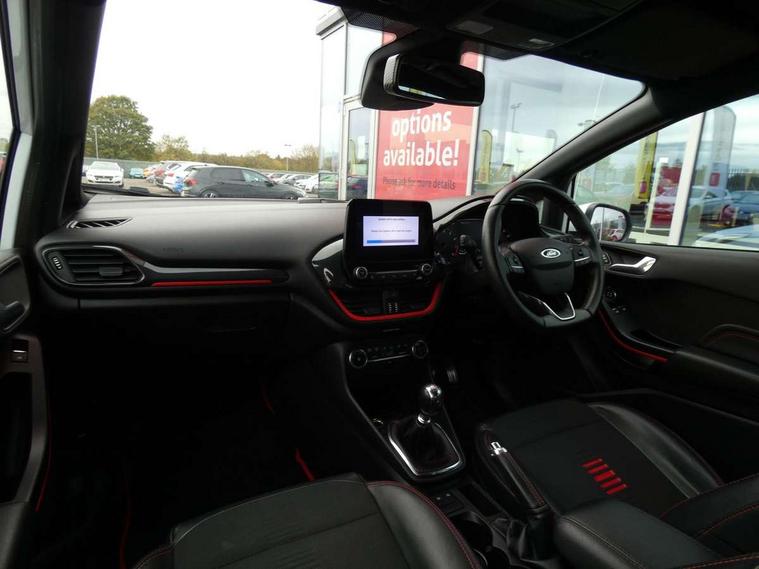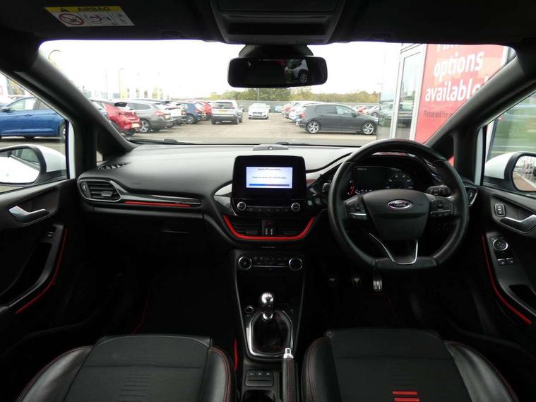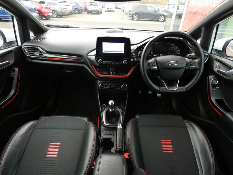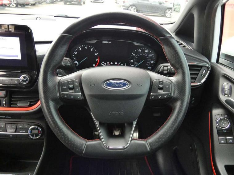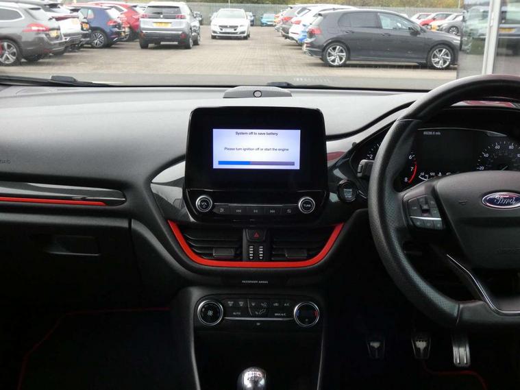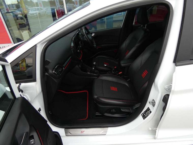 Bluetooth system, Electric power steering, Ford easy fuel, Trip computer, Sports suspension, 2 USB ports, Auxiliary input socket, DAB Digital radio, Steering wheel mounted controls, Auto dimming rear view mirror, Automatic headlights, Body colour bumpers, Body colour door handles, Body colour electric adjustable heated door mirrors with integral indicators, Body colour large rear spoiler, Chrome door handles, Chrome lower window surround, Cornering front fog lights, Electric front windows/one touch facility, LED Night signature to rear lights, LED rear lights, Power foldable door mirrors with puddle lights, Quickclear heated windscreen, Rain sensing wipers and auto dimming rear view mirror, Rear privacy glass, Rear wiper, Rugged body styling kit with active front wing badges, Tinted glass, Unique ST-Line upper grille & full bodystyling kit with ST-Line wing badges, 12V Accessory socket in centre console, 3 spoke flat bottomed leather steering wheel, 60/40 split folding rear seat, Adjustable head restraints, Black headlining, Boot carpet, Centre console with armrest and illuminated cupholders, Chrome inner door handles, Drivers and Passenger lumbar support, EATC - Electronic Auto Temperature control, Footwell illumination, Front and rear velour floor mats, Front map reading lights, Front seat and rear pockets, Illuminated glovebox, Leather gear knob, Leather trimmed handbrake handle, Load area light, Overhead console with sunglasses holder, Pollen filter, Rake/reach adjustable steering wheel, Rear centre head restraint, Sports front seats, Sports pedals, Driver assistance pack - Fiesta/Titanium/Titanium X/Active B+O/Active X/ST-Line X, NCAP Pack - Fiesta, Red pack - Fiesta ST-Line X, 3 point seatbelts on all rear seats, ABS+EBA, Curtain airbags, Driver and passenger airbags, Drivers knee airbag, Electronic stability control with hill start assist, Front passenger airbag deactivation, Front side airbags, Seatbelt warning, Tyre pressure monitoring system, MyKey system, Remote central locking & engine immobiliser, Thatcham Cat.1 alarm,