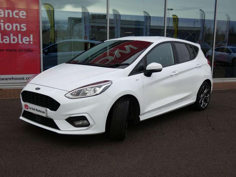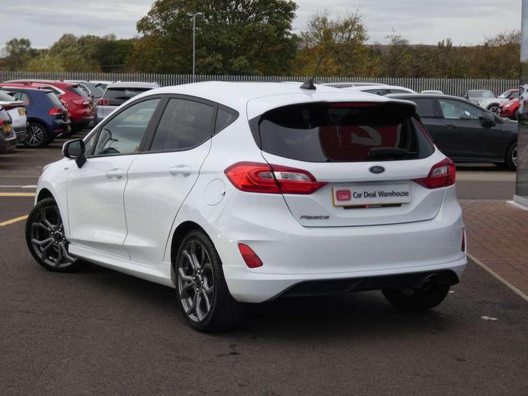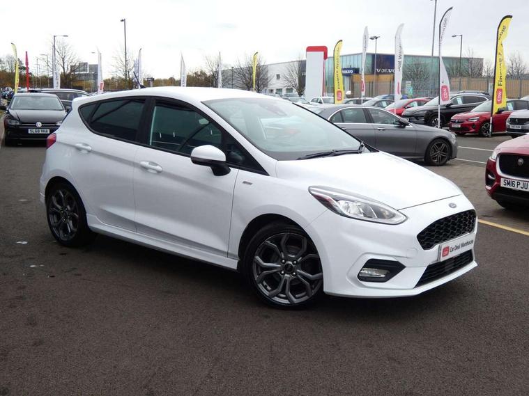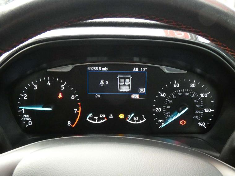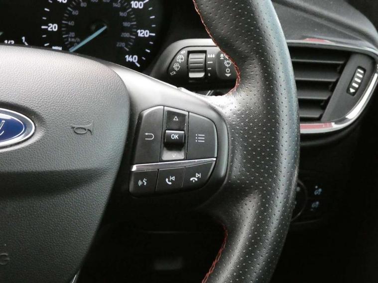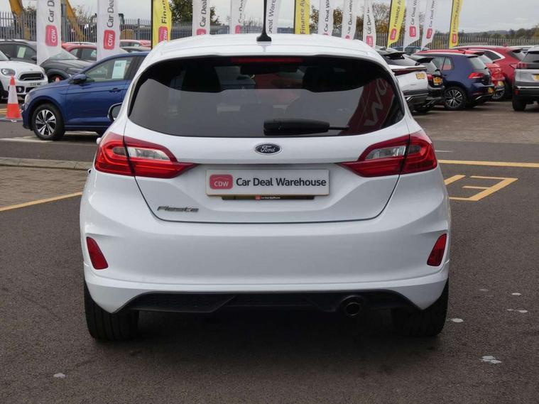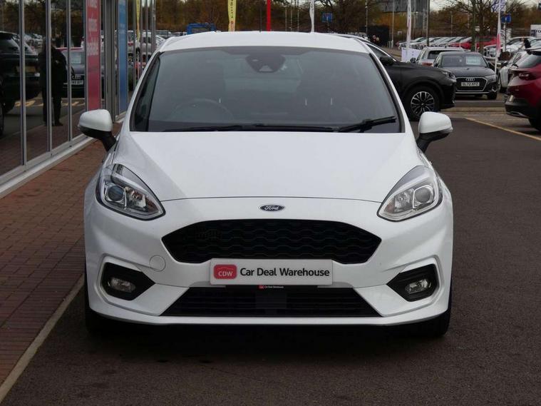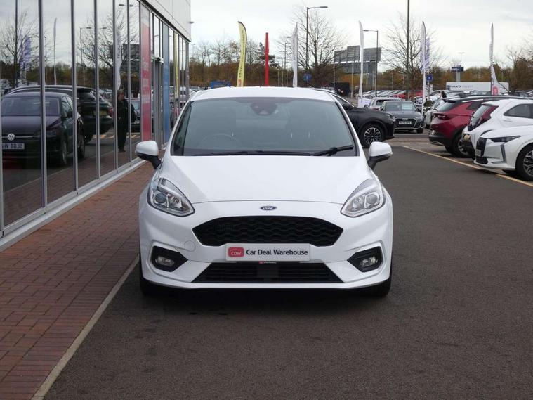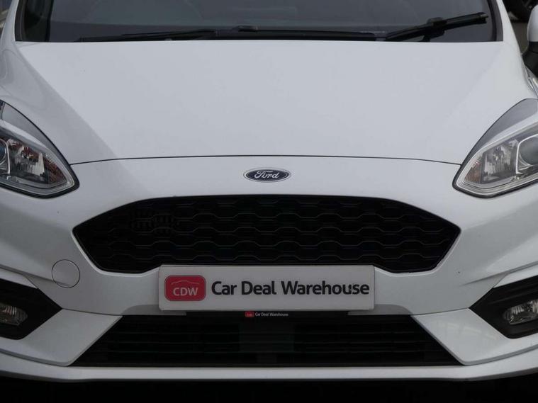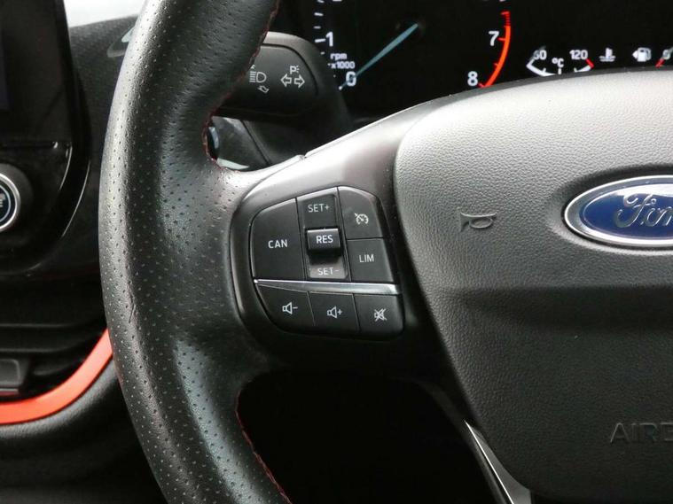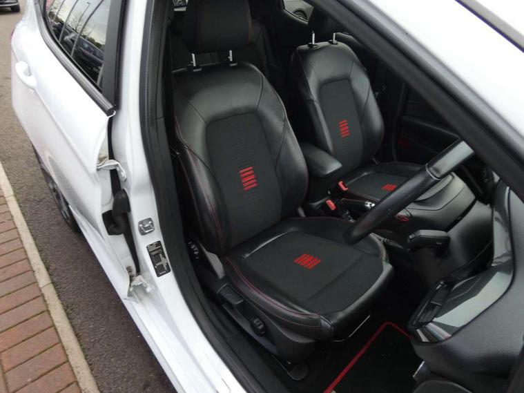 Bluetooth system, Electric power steering, Ford easy fuel, Trip computer, Sports suspension, 2 USB ports, Auxiliary input socket, DAB Digital radio, Steering wheel mounted controls, Auto dimming rear view mirror, Automatic headlights, Body colour bumpers, Body colour door handles, Body colour electric adjustable heated door mirrors with integral indicators, Body colour large rear spoiler, Chrome door handles, Chrome lower window surround, Cornering front fog lights, Electric front windows/one touch facility, LED Night signature to rear lights, LED rear lights, Power foldable door mirrors with puddle lights, Quickclear heated windscreen, Rain sensing wipers and auto dimming rear view mirror, Rear privacy glass, Rear wiper, Rugged body styling kit with active front wing badges, Tinted glass, Unique ST-Line upper grille & full bodystyling kit with ST-Line wing badges, 12V Accessory socket in centre console, 3 spoke flat bottomed leather steering wheel, 60/40 split folding rear seat, Adjustable head restraints, Black headlining, Boot carpet, Centre console with armrest and illuminated cupholders, Chrome inner door handles, Drivers and Passenger lumbar support, EATC - Electronic Auto Temperature control, Footwell illumination, Front and rear velour floor mats, Front map reading lights, Front seat and rear pockets, Illuminated glovebox, Leather gear knob, Leather trimmed handbrake handle, Load area light, Overhead console with sunglasses holder, Pollen filter, Rake/reach adjustable steering wheel, Rear centre head restraint, Sports front seats, Sports pedals, Driver assistance pack - Fiesta/Titanium/Titanium X/Active B+O/Active X/ST-Line X, NCAP Pack - Fiesta, Red pack - Fiesta ST-Line X, 3 point seatbelts on all rear seats, ABS+EBA, Curtain airbags, Driver and passenger airbags, Drivers knee airbag, Electronic stability control with hill start assist, Front passenger airbag deactivation, Front side airbags, Seatbelt warning, Tyre pressure monitoring system, MyKey system, Remote central locking & engine immobiliser, Thatcham Cat.1 alarm,