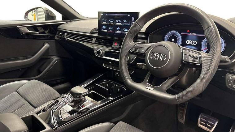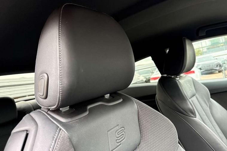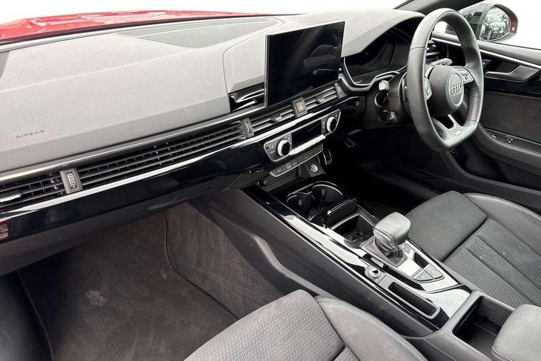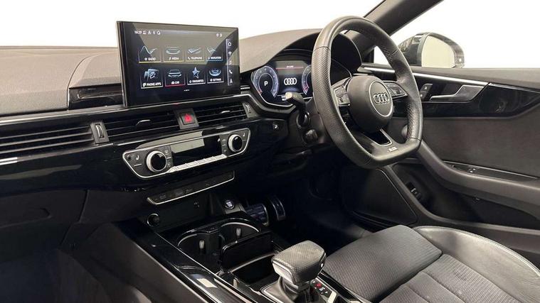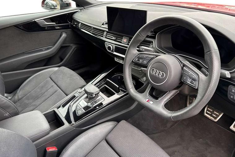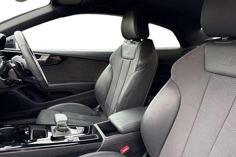 Audi connect safety and service (e-call), Audi connect with Amazon Alexa Integration, Audi drive select (Auto, Comfort, Dynamic and Individual), Audi parking system plus with front and rear sensors, Audi smartphone interface, Audi virtual cockpit - 12.3" full colour digital instrument cluster, vehicle/engine speed, Radio/media information+Driver assistance systems, Automatic start-stop system with coasting functionality and efficiency programme, Bluetooth interface, Electric boot lid release, Electro-mechanical power steering, Email, calendar and text messages displayed via MMI, MMI nav+ with MMI touch - 10.1" high resolution MMI display, touch sensitive, 3D map, route/country info, dynamic route guide, personal route assist, Rear view camera, Service interval indicator, Voice control system, Sports suspension lowered by 23mm, 8 passive loudspeakers, CD player, DAB digital radio reception, Two additional USB ports for rear passenger in rear centre console, Two SDXC card slots, Audi Beam uses LEDs to project the Audi logo, Audi matrix LED headlights with LED rear lights + dynamic front and rear indicators, Auto dimming door mirrors, Auto dimming rear view mirror, Black door mirror housings, Body colour door handles, Body colour front spoiler lip, Body colour side sill trim, Electric adjustable heated door mirrors, Electric folding door mirrors, Electric front windows, Exhaust tailpipe trims in dark chrome, Front and rear bumpers with side skirts, Front fog lights, Honeycomb structure radiator grille in grained matt black, Kerb-view function for passenger side, LED daytime running lights, LED side indicator lights integrated into door mirrors, LED third brake light, Privacy glass, Rain and light sensors, Rear boot, Rear diffuser in matt anthracite black with trim strip in matt aluminium silver, Rear side wing doors, S model rear spoiler in black, Side air inlets in grained matt black with matt aluminium silver inlay, Variable front intermittent wipers, Windscreen with acoustic glazing, 2 seat bench in 2nd row, 4 way electric lumbar support for driver and front passenger, 40/20/40 split folding 2 seater rear seat bench with rear centre armrest, Adjustable steering column, Black cloth headlining, Black perforated leather gearknob, Contrast stitching on seats, steering wheel and gear lever gaiter, Deluxe 3 zone electronic climate control, Front centre armrest, Front head restraints, Front/rear floor mats, Heated front seats, Illuminated door sill trim with S logo, ISOFIX child seat mounting and top tether, Luggage compartment mat, Manual seat adjustment, Rear headrests, Single front passenger seat, Stainless steel pedals, Sunvisors with vanity mirrors, Black styling pack - A5 Coupe/Sportback, LED interior light pack - A5/RS5, 2 x 3-point rear seatbelts, 6 airbags - Driver, front passenger, curtain and side airbags, Electromechanical parking brake, Electronic Stabilisation Control (ESC) including ABS, ASR and EDL, Front passenger airbag deactivation, Height adjustable front seatbelts, Hill hold assist, Multi collision brake assist, Pop-up bonnet for pedestrian protection, Pre sense city, Seatbelt monitoring, Tyre pressure warning, Variable restraint system, Warning triangle and first aid kit, Anti theft alarm system, Anti theft wheel bolts, Immobiliser, Keyless Go, Remote central locking, Piano black finish inlay, 20" 5 twin spoke polygon design alloy wheels in gloss anthracite black and gloss turned finish, Tool kit, Tyre repair kit,