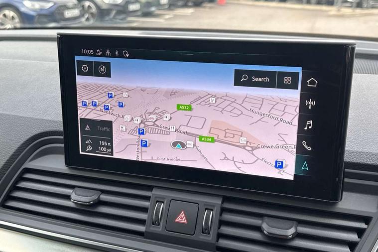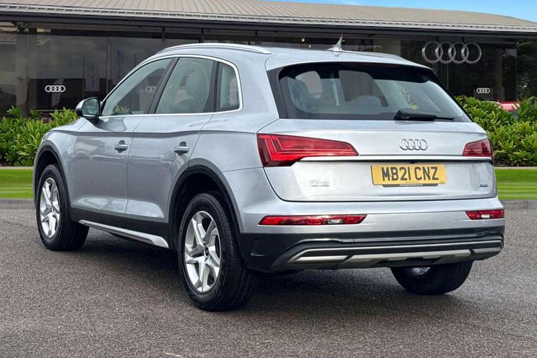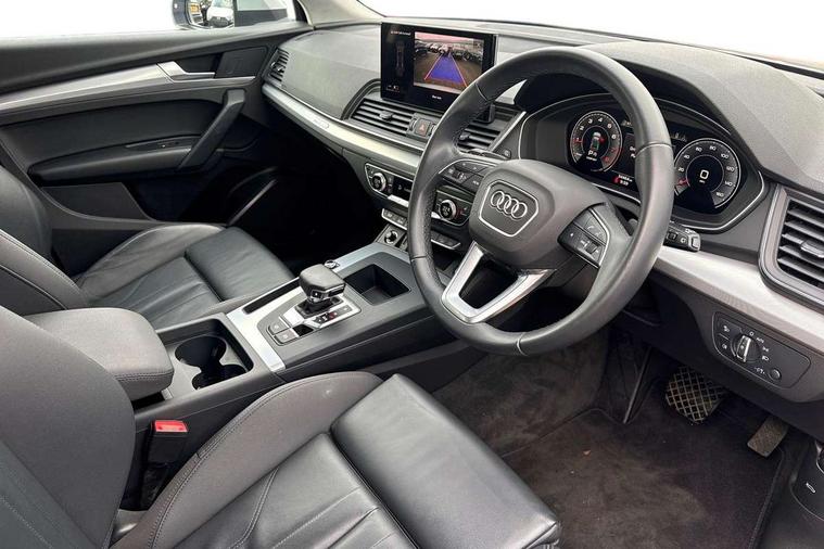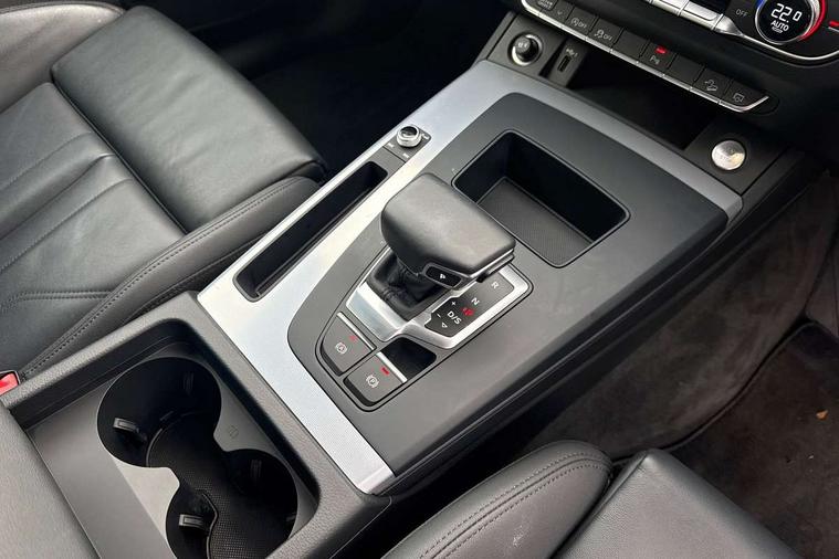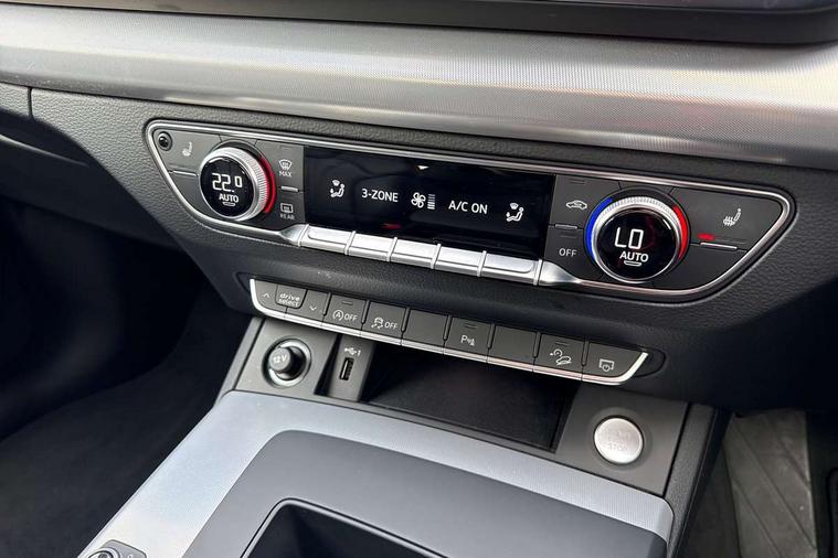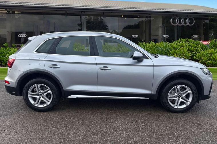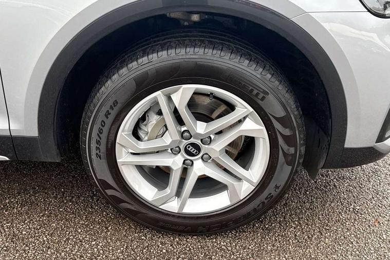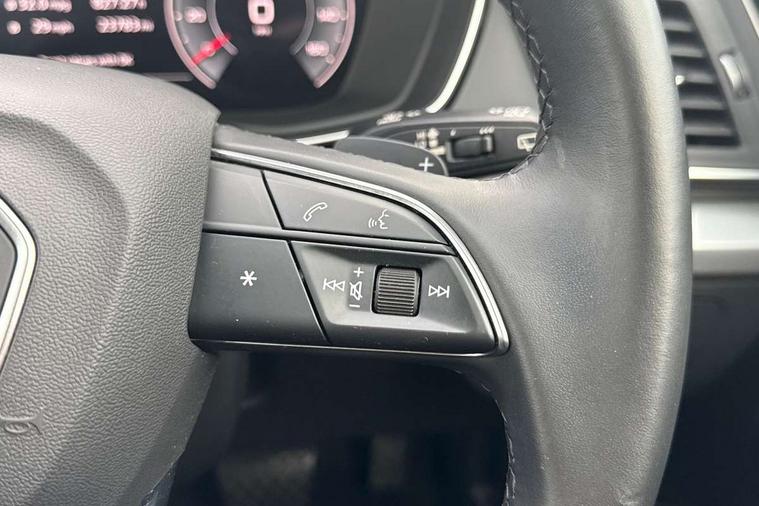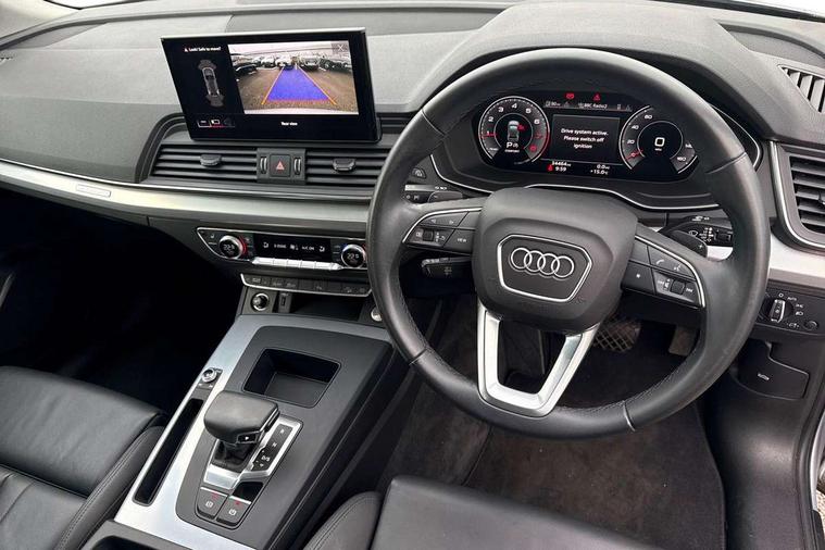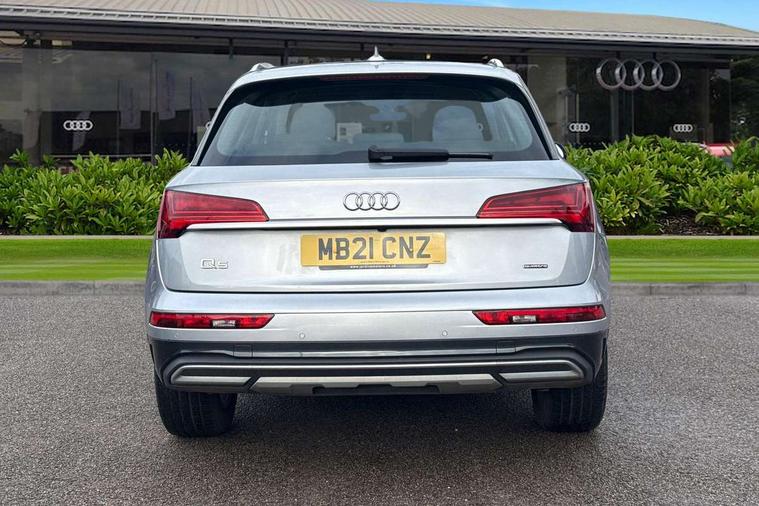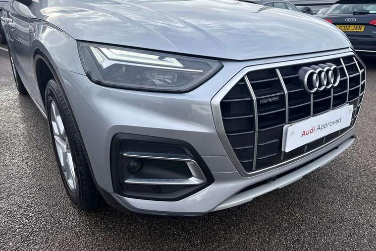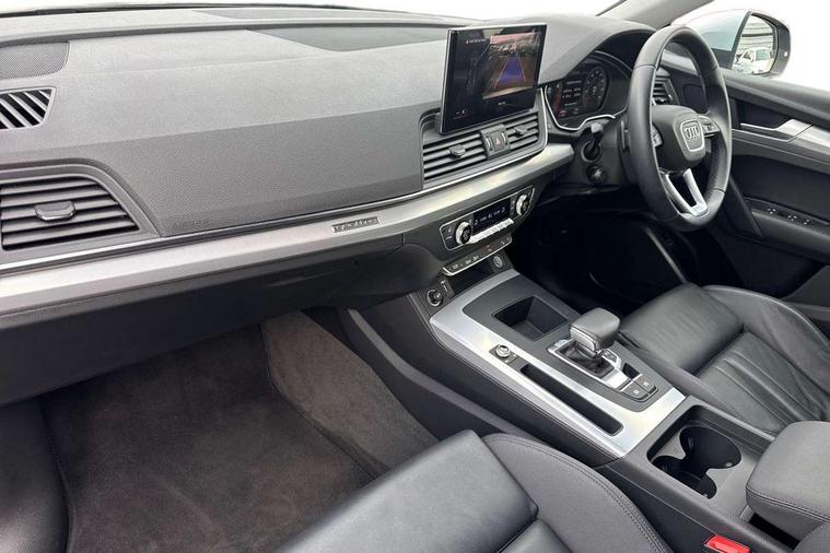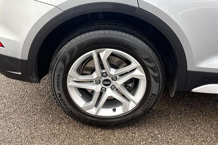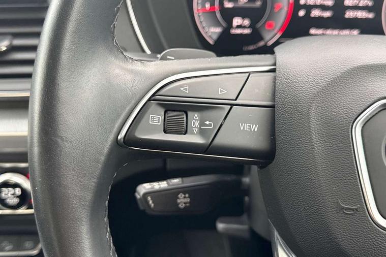 Acoustic front and rear parking sensor, Audi connect safety and service (e-call), Audi drive select, Audi virtual cockpit plus with 12.3" screen and three different layout designs, Audi wireless smartphone interface, Automatic start-stop system with coasting functionality and efficiency programme, Bluetooth interface, Cruise control + speed limiter, Electro - mechanical power assisted steering, MMI navigation plus with 10.1" touch screen, Power tailgate, Reversing camera, Service interval indicator, Voice control system with Audi hotword activation "Hey Audi", Dynamic suspension, Quattro on demand, DAB Digital radio, Acoustic windscreen, Air inlets in matt titanium black with blades in matt aluminium silver, Aluminium roof rails, Auto dimming rear view mirror, Automatic headlight adjustment, Automatic headlights and windscreen wipers, Body colour bumpers, Body colour door mirrors, Chrome plated exhaust trims, Door sills in Selenite silver, Electric adjustable/heated/folding door mirrors, Front and rear electric windows, LED headlights and LED tail lights, Lower bumpers painted in contrast Manhattan grey, Matt selenite silver underbody protection, Matt twilight grey radiator grille with chrome vertical struts, Rear chrome trim strip below lights, Rear diffuser strip in selenite silver, Rear spoiler, Rear wiper, Roof bars, 2 x USB charging port with aux input socket, 3 rear headrests, 3 spoke multifunction leather steering wheel with shift paddles, 40:20:40 split folding rear seat with rear centre armrest, Deluxe 3 zone electronic climate control, Door sills trims with aluminium inlays, Front centre armrest, Front/rear floor mats, Heated front seats, Height adjustable front head restraints, Height/reach adjustable steering column, ISOFIX child seat mounting and top tether, Luggage compartment cover, Manual seat adjustment with 4-way electric lumbar support, Removable luggage compartment floor, Silver cloth headlining, Sunvisors with vanity mirrors, Twin leather upholstery + front sports seats, High gloss pack - Q5, LED interior light pack - Q5, 3 point seatbelts on all seats, 6 airbags - Driver, front passenger, curtain and side airbags, Electrically operated child locks on rear doors, Electromechanical parking brake, Electronic stabilisation control including ABS, ASR and EDL, Front passenger airbag deactivation, Hill descent control, Hill hold assist, Multi collision brake assist, Pop-up bonnet for pedestrian protection, Pre sense city, Seat belt force limiter, Seatbelt monitoring, Tyre pressure warning, Warning triangle and first aid kit, Anti theft alarm, Anti-theft wheel bolts, Keyless Go access/ignition system, Aluminium rhombus inlay,