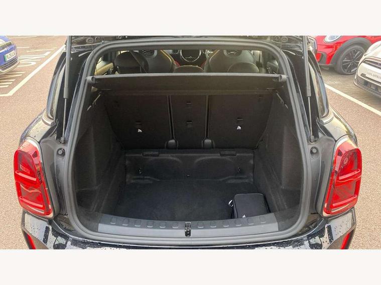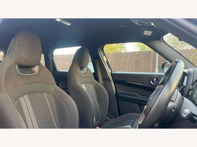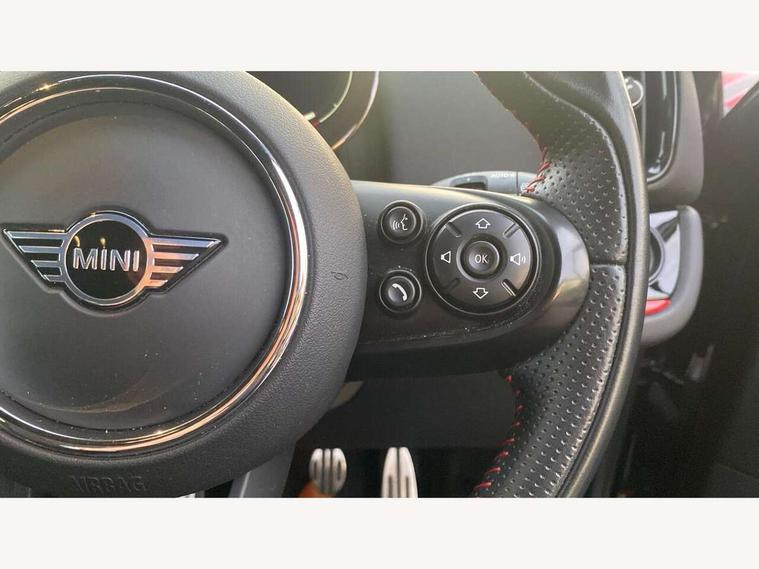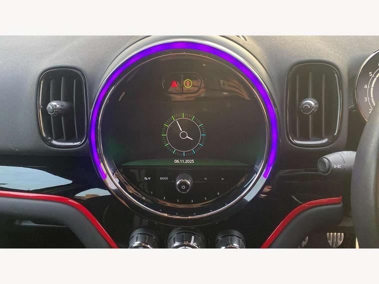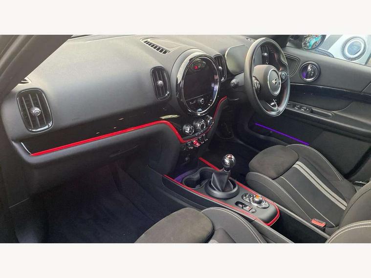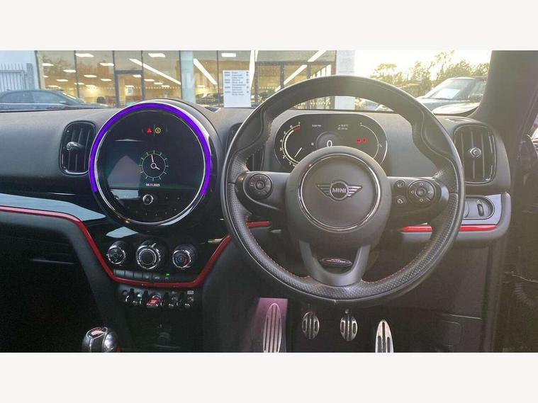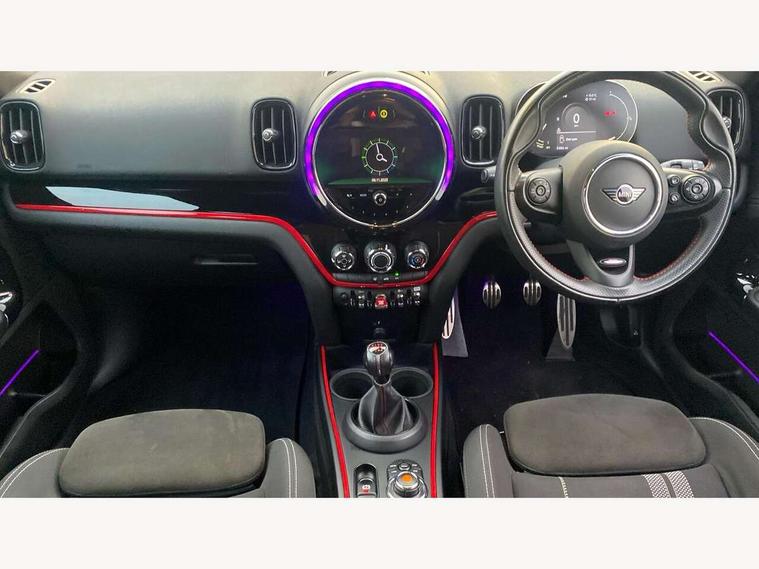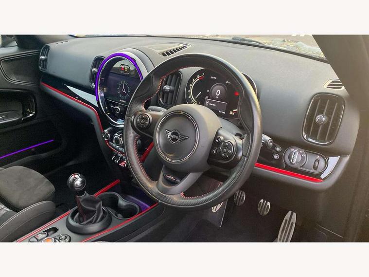 Active Guard incl speed limiting and lane departure functions with auto steering, and front collision warning with brake intervention, Automatic start/stop function with brake energy recuperation, Compatible mobile phone bluetooth with audio streaming, Electro-mechanical speed dependant steering assistance, Instrument cluster, On board computer, Rear parking distance control, 51 Litre fuel tank, 6 Speed manual transmission including gear change indicator display, Double Vanos system, Fully variable valve control, High precision injection, Performance Control, 6 speakers, FM tuner and DAB digital radio, Body colour fuel filler cap, Day time driving lights, Door sill strips, Dynamic brake lights, Electric windows, Heated rear window, Heated windscreen washer jets, John Cooper Works - aerodynamic kit (front and rear apron, spoiler), front and rear sport bumpers and part-painted side sills with door sill finishers, John Cooper Works Logo, LED fog lights, LED Headlights, Model logo, Model logo on Tailgate, Rain sensor with auto headlights, Rear fog lights, Rear window wiper, Side scuttle panel with integrated indicator, Split rear doors, Sun/heat protection glass, White indicator lenses, 12V socket in centre console, 360L luggage compartment capacity, 4 lashing eyes in luggage compartment, 40:20:40 split folding rear seats, Anthracite headlining with grab handles and clothes hooks, Chrome interior highlights, Colour line - Carbon black, Cupholders, English handbook, Floor mats, Front headrests, Glove compartment, Height and length steering column adjustment, Interior lighting with 12 basic colours selectable via toggle switch in roof, Isofix rear child seat preparation, LED reading lights, vanity mirror lights, front foot well light and spotlight on front seats, Manual air conditioning, Mini John Cooper Works leather gearshift lever and handbrake gaiters, Multifunction steering wheel, Nappa leather steering wheel with MINI Yours logo, Rear headrests, Stainless steel pedals and foot rest, Storage compartments in doors, Sunvisors with vanity mirrors, Excitement pack - Countryman, Navigation pack - Countryman, Piano black exterior pack - Countryman, 2 tone horn, 3 point seatbelts on all seats, 6 Airbags - front, side, head and seat belt tensioners, Anti-lock braking system (ABS), DSC - Dynamic Stability Control, Electronic handbrake, Front and rear disc brakes, Hill start assist, Tyre pressure monitoring system, Alarm system with tilt sensor, monitoring doors, bonnet interior and tailgate, Auto drive away locking, Deadlocking function, Electronic vehicle immobiliser, Locking wheel bolts, Start/stop toggle with keyless go, Piano black JCW interior trim, Tool kit,