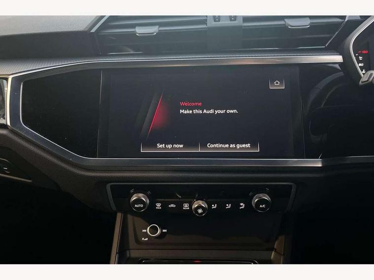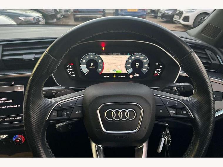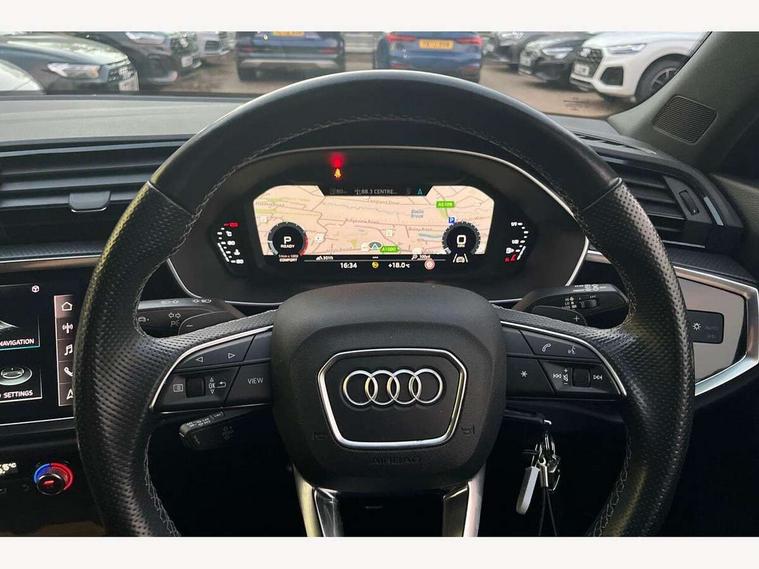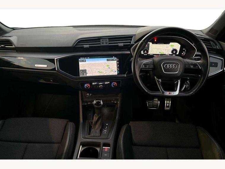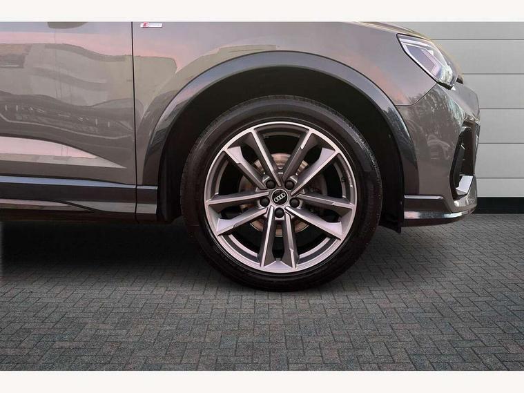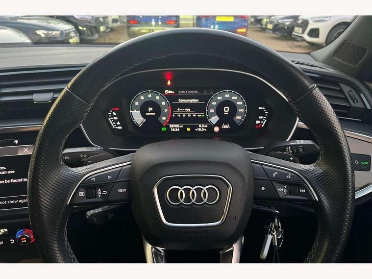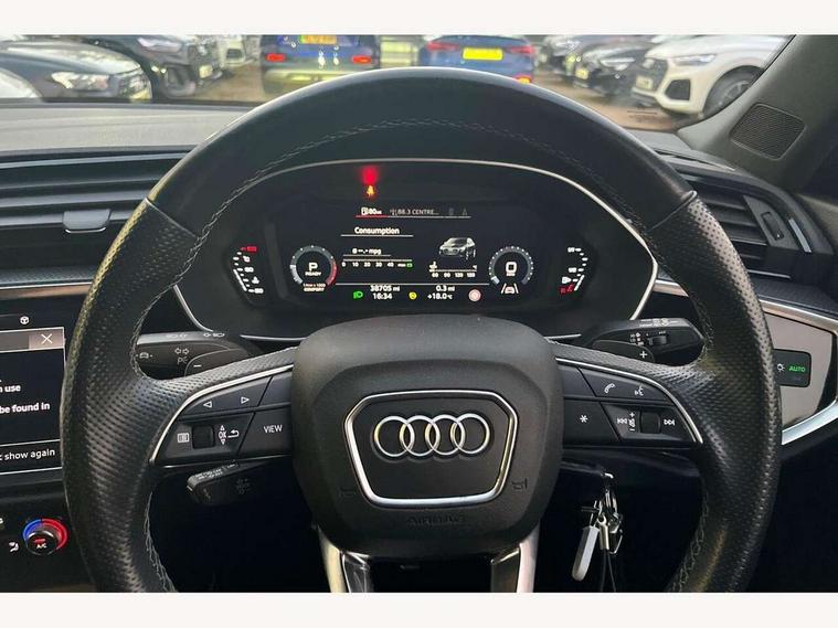 Audi connect safety and service (e-call), Audi drive select, Audi lane departure warning, Audi smartphone interface includes wireless Apple carplay/Android Auto, Audi Virtual Cockpit - 10.25" display, Bluetooth interface, Camera based traffic sign recognition, MMI Navigation Plus with high resolution 10.1 inch touchscreen colour display, Power operated tailgate, Progressive steering, Service interval indicator, Start stop system with recuperation, Voice control system with natural language interaction, 48V Mild hybrid technology, Sports suspension, 2 USB-C ports with charge and data functions, 6 passive loudspeakers, DAB digital radio module, Acoustic windscreen, Auto dimming frameless rear view mirror, Bumpers and underbody protection in contrasting manhattan grey paint finish, Diffuser grille in grained matt black, Diffuser trim in selenite silver, Electrically folding, adjustable and heated door mirrors with integrated LED side indicators and kerb view function for passenger side, Front and rear electric windows, Front fog lights, Front side air inlets in selenite silver, High gloss black finish B and C pillars, LED headlights with LED daytime running lights and dynamic rear indicator, LED rear lights, Privacy glass dark tinted rear and rear-side windows (from B-pillar backwards), Rain and light sensors, Rear underbody protection in matt black, 12V socket in rear centre console, 40:20:40 folding with manual adjustment for 60:40 forwards/backwards position and backrest angle, Adjustable rear seat bench/backrest with centre armrest and cupholder, Black cloth headlining, Dual zone electronic climate control, Front and rear black floor mats with contrast stitching, Front and rear headrests, Front and rear roof module including reading lights, Front centre armrest, Glove compartment lighting, Height and reach adjustable steering wheel, Illuminated door sill trims with S logo, ISOFIX child seat mounting for front passenger with airbag deactivation and outer rear seat including top tether attachment point for outer rear seats, Luggage compartment light, Manual front seats with height adjustment, Perforated leather gearknob, Stainless steel luggage compartment sill finisher, Stainless steel pedals, Tool kit, Black styling pack - Q3, Non smoking pack - Q3, 3x3 point rear seatbelts, 6 airbags - Driver, front passenger, curtain and side windows, Electrically operated child locks on rear doors, Electromechanical parking brake, Electronic stabilisation control including ABS, ASR and EDL, Hill descent control, Hill hold assist, Pre sense basic, Seatbelt monitoring, Tyre pressure warning, Warning triangle and first aid kit, Anti theft alarm, Anti theft wheel bolts, Audi pre-sense front with pedestrain and cyclist recognition, Remote central locking, Black dashboard, Leatherette door armrest, MMI touch colour display in glass look, black with surround in aluminium look, Piano black inlay, Tyre repair kit,