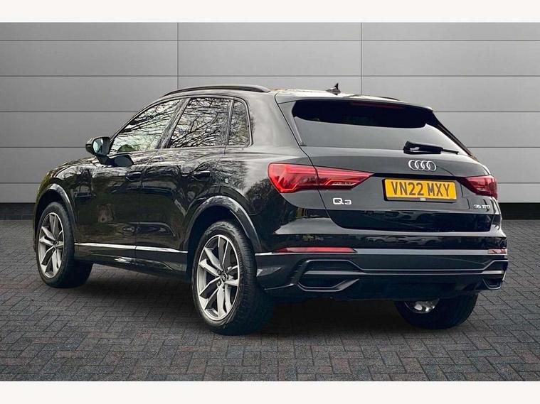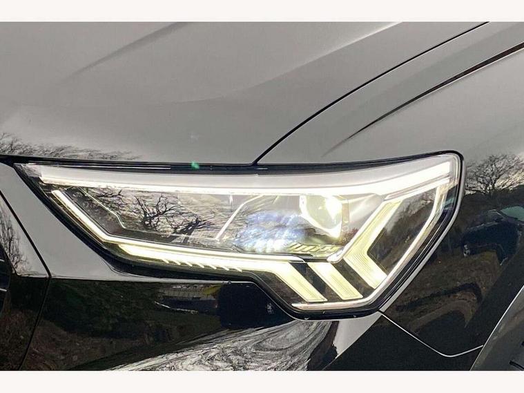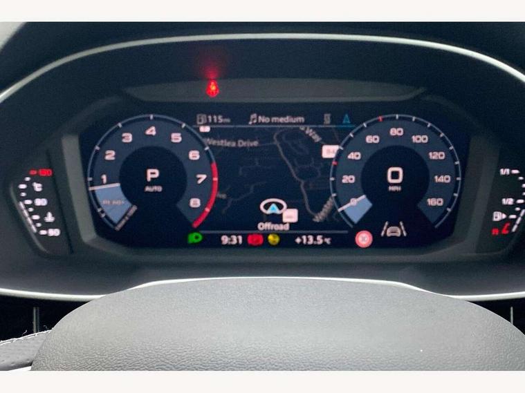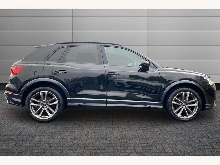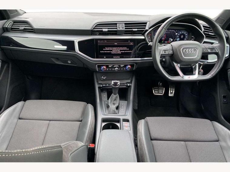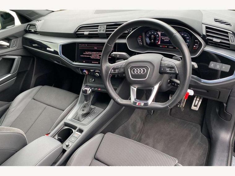 Amazon alexa Integration, Audi connect safety and service (e-call), Audi drive select, Audi lane departure warning, Audi smartphone interface includes wireless Apple carplay/Android Auto, Audi Virtual Cockpit - 10.25" display, Bluetooth interface, Camera based traffic sign recognition, MMI Navigation Plus with high resolution 10.1 inch touchscreen colour display, Power operated tailgate, Progressive steering, Service interval indicator, Start stop system with recuperation, Voice control system with natural language interaction, 48V Mild hybrid technology, Sports suspension, 2 USB-C ports with charge and data functions, 6 passive loudspeakers, DAB digital radio module, Acoustic windscreen, Auto dimming frameless rear view mirror, Black roof rails, Electrically folding, adjustable and heated door mirrors with integrated LED side indicators and kerb view function for passenger side, Front and rear electric windows, Front fog lights, Grille vertical bars in aluminium silver/Matt, High gloss black finish B and C pillars, LED headlights with LED daytime running lights, LED rear lights, LED third brake light, Privacy glass dark tinted rear and rear-side windows (from B-pillar backwards), Rain and light sensors, Rear diffuser strip in matt titanium black, Rear side wing doors, Rear wiper, S line bumpers in contrasting Manhattan grey, Variable front intermittent wipers, 12V socket in rear centre console, 3 seat bench in 2nd row, 40:20:40 folding with manual adjustment for 60:40 forwards/backwards position and backrest angle, Adjustable rear seat bench/backrest with centre armrest and cupholder, Black cloth headlining, Dual zone electronic climate control, Front and rear black floor mats with contrast stitching in rock grey, Front and rear headrests, Front and rear roof module including reading lights, Front centre armrest, Glove compartment lighting, Height and reach adjustable steering wheel, Illuminated door sill trims with S logo, ISOFIX child seat mounting for front passenger with airbag deactivation and outer rear seat including top tether attachment point for outer rear seats, Luggage compartment light, Manual front seats with height adjustment, Perforated leather gearknob, Single front passenger seat, Stainless steel luggage compartment sill finisher, Stainless steel pedals, Black styling pack - Q3, Non smoking pack - Q3, 3x3 point rear seatbelts, 6 airbags - Driver, front passenger, curtain and side windows, Audi pre-sense front with pedestrain and cyclist recognition, Electromechanical parking brake, Electronic stabilisation control including ABS, ASR and EDL, Front seatbelt reminder, Hill descent control, Hill hold assist, Manual child lock in rear doors, Pre sense basic, Seatbelt monitoring, Tyre pressure warning, Warning triangle and first aid kit, Anti theft alarm, Anti theft wheel bolts, Immobiliser, Remote central locking, Detail dashboard around MMI touch colour display in glass look, black with surround in aluminium look, Leatherette door armrest, Piano black inlay, Tool kit, Tyre repair kit,