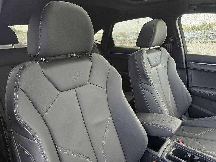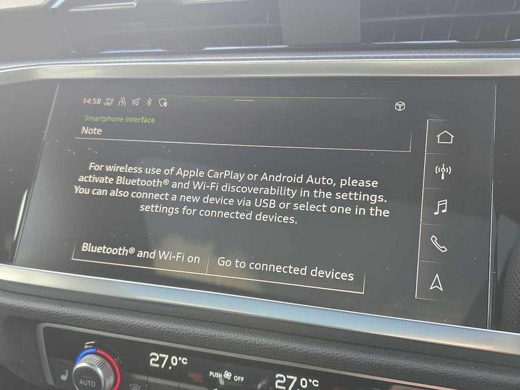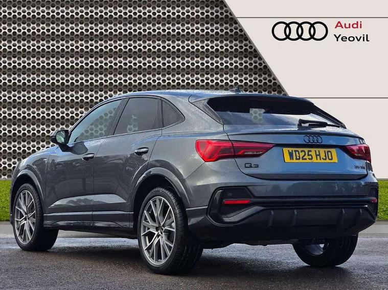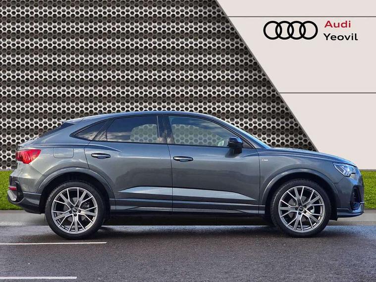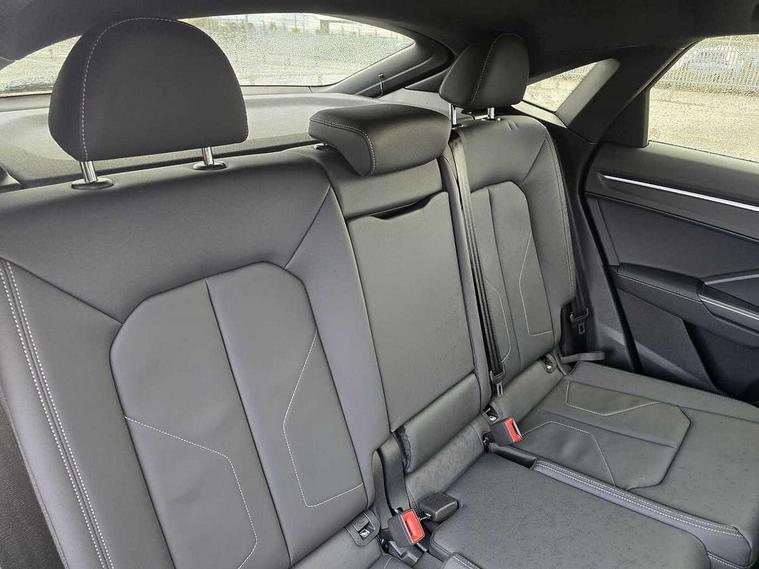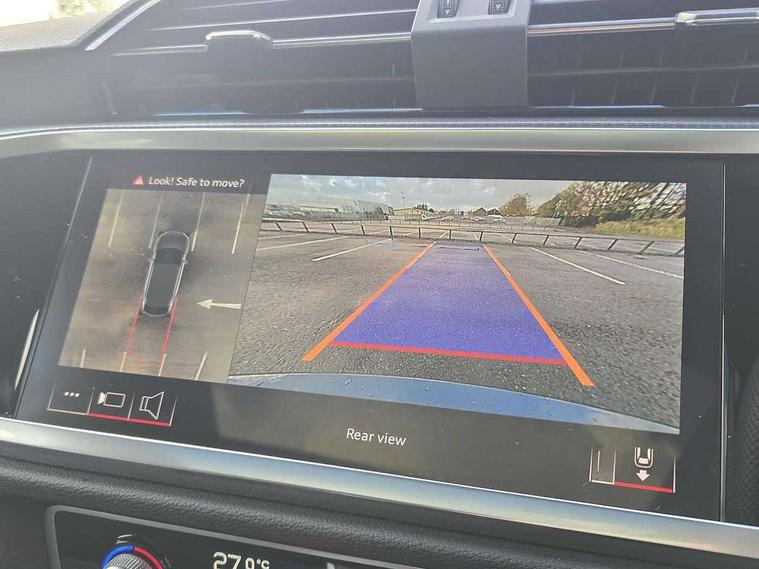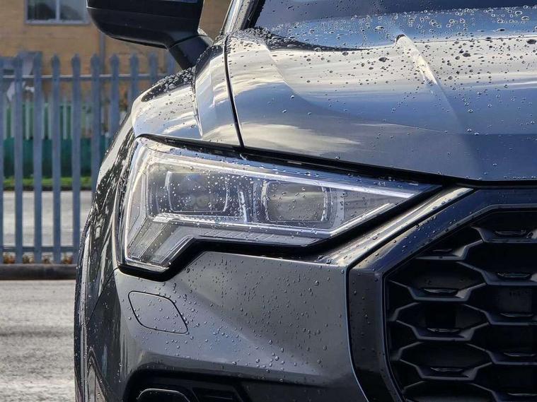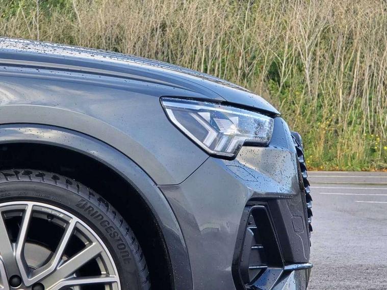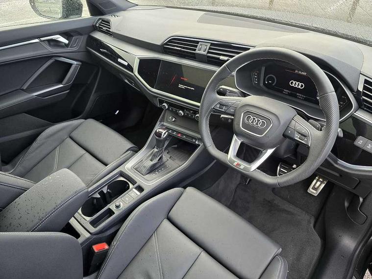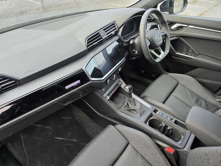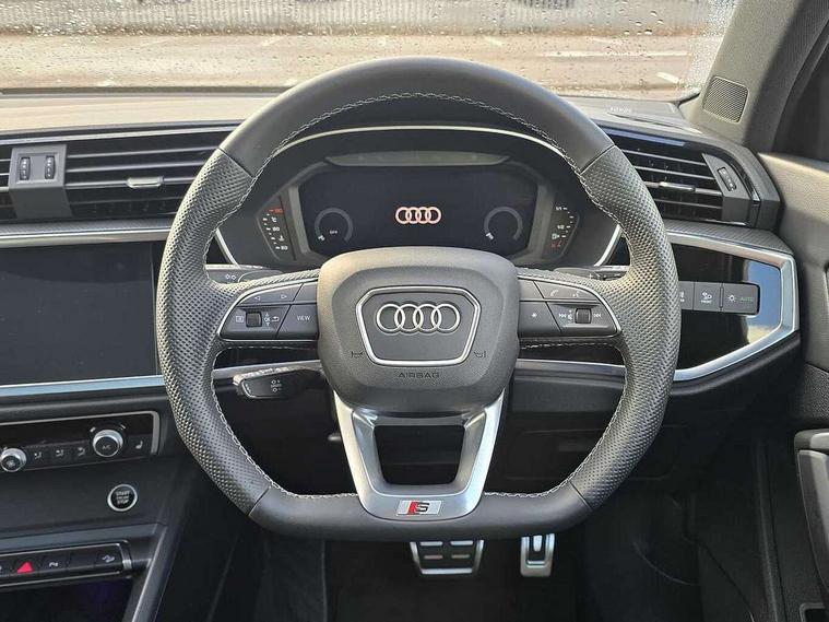 Audi connect safety and service, Audi drive select, Audi lane departure warning, Audi Virtual Cockpit - 10.25" display, Bluetooth interface, Camera based traffic sign recognition, Distraction and Fatigue warning, Legal emergency call, MMI Navigation Plus with high resolution 10.1 inch touchscreen colour display, Power operated tailgate, Progressive steering, Service interval indicator, Smartphone interface includes wireless Apple carplay/Android Auto, Start stop system with recuperation, Voice control system with natural language interaction, Diesel particulate filter, Sports suspension, 2 USB-C ports with charge and data functions, 6 passive loudspeakers, DAB digital radio module, Acoustic windscreen, Audi Beam uses LEDs to project the Audi logo onto the ground as you exit your Q3, Auto dimming door mirrors, Auto dimming frameless rear view mirror, Electrically folding, adjustable and heated door mirrors with integrated LED side indicators and kerb view function for passenger side, Front and rear electric windows, Front fog lights, Front underbody protection in manhattan grey paint finish, High gloss black finish B and C pillars, Honeycomb design radiator grille in matt anthracite black, LED Dynamic rear indicators, LED headlights with LED daytime running lights, LED rear lights, LED third brake light, Privacy glass dark tinted rear and rear-side windows (from B-pillar backwards), Rain and light sensors, Rear diffuser grille in grained matt black, Rear diffuser strip in matt anthracite black, Rear side wing doors, Rear underbody protection in matt black, Rear wiper, S line front and rear bumpers and side skirts in contrasting Manhattan grey paint finish, Variable front intermittent wipers, 12V socket in rear centre console, 3 seat bench in 2nd row, 40:20:40 folding with manual adjustment for 60:40 forwards/backwards position and backrest angle, Adjustable rear seat bench/backrest with centre armrest and cupholder, Black carpet mats, Black cloth headlining, Dual zone electronic climate control, Electric lumbar support, Front and rear black floor mats with contrast stitching in rock grey, Front and rear headrests, Front centre armrest, Height and reach adjustable steering wheel, Illuminated door sill trims with S logo, ISOFIX child seat mounting for front passenger with airbag deactivation and outer rear seat including top tether attachment point for outer rear seats, Luggage compartment sill protection in stainless steel, Manual front seats with height adjustment, Perforated leather gearknob, Single front passenger seat, Stainless steel pedals, Twin leather upholstery with front sport seats + S embossing, Black styling pack - Q3, Non smoking pack - Q3, 3x3 point rear seatbelts, 6 airbags - Driver, front passenger, curtain and side windows, Audi pre-sense front with pedestrain and cyclist recognition, Electrically operated child locks on rear doors, Electromechanical parking brake, Electronic stabilisation control including ABS, ASR and EDL, Front seatbelt reminder, Hill descent control, Hill hold assist, Pre sense basic, Seatbelt monitoring, Tyre pressure warning, Warning triangle and first aid kit, Anti theft wheel bolts, Immobiliser, Remote central locking, Thatcham approved category 1 anti theft alarm, Aluminium look interior elements, Detail dashboard around MMI touch colour display in glass look, black with surround in aluminium look, Leatherette door armrest, Piano black inlay,