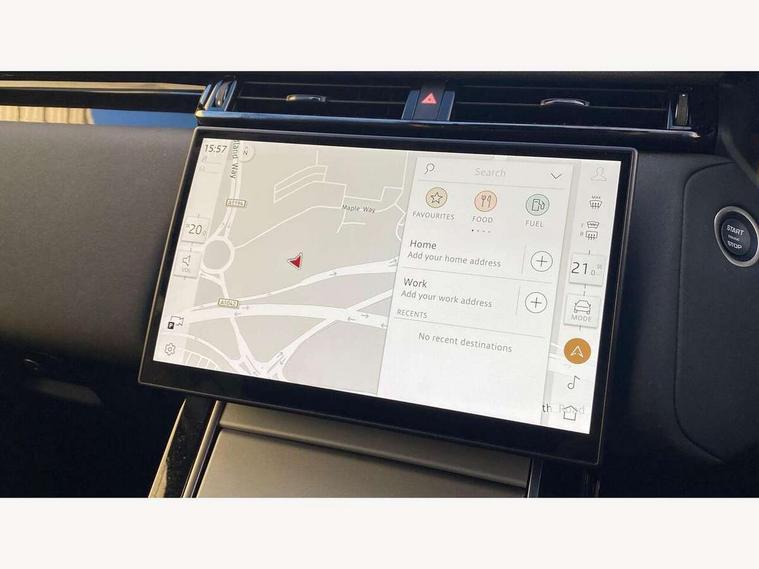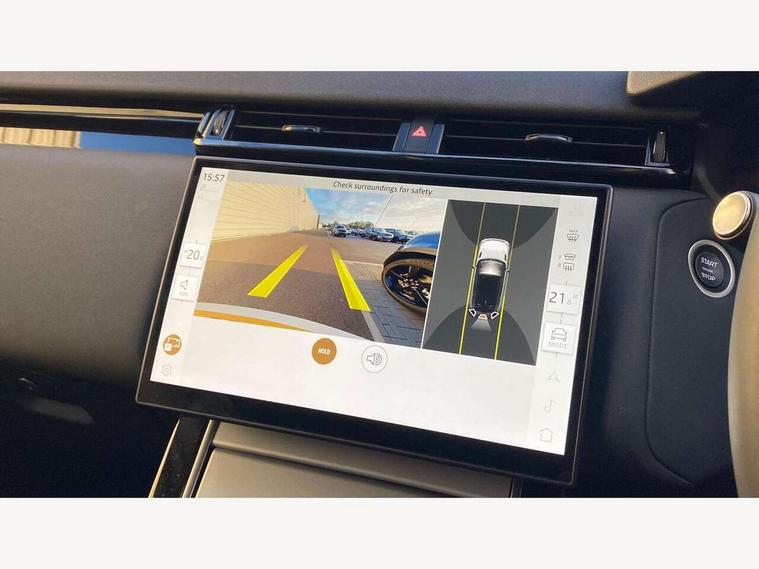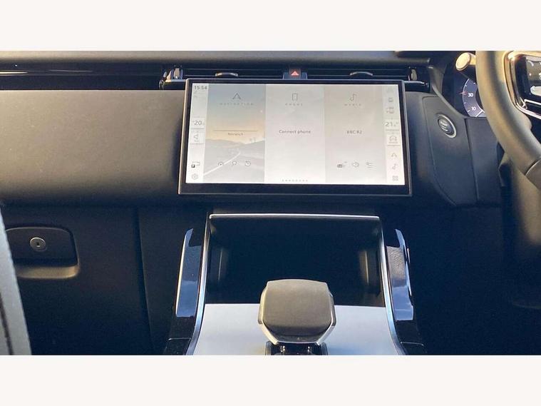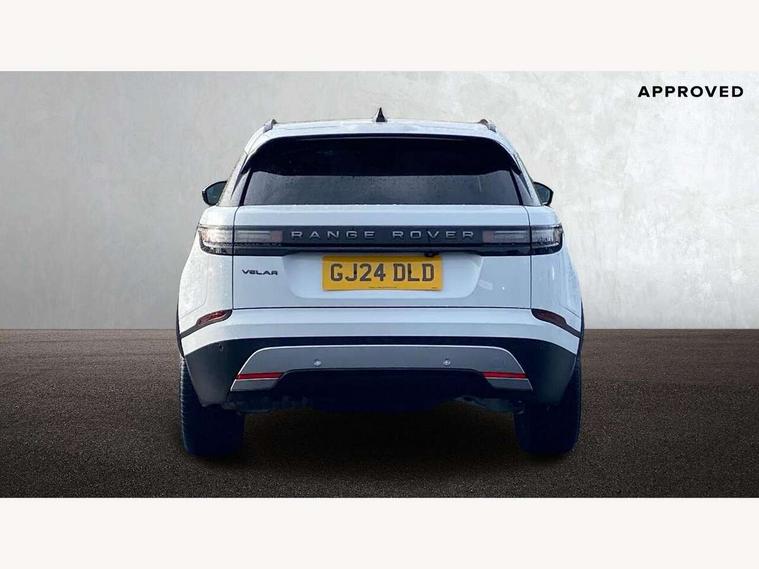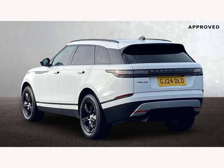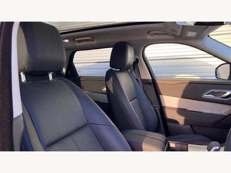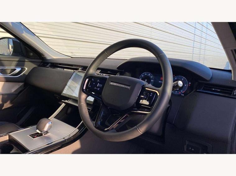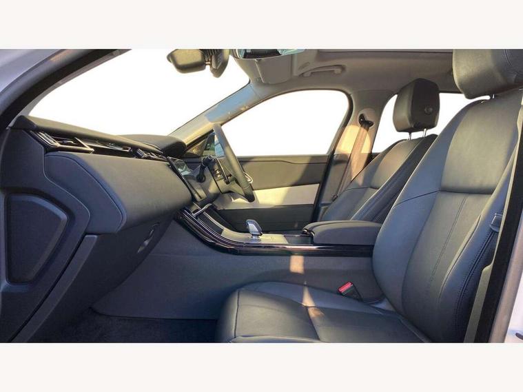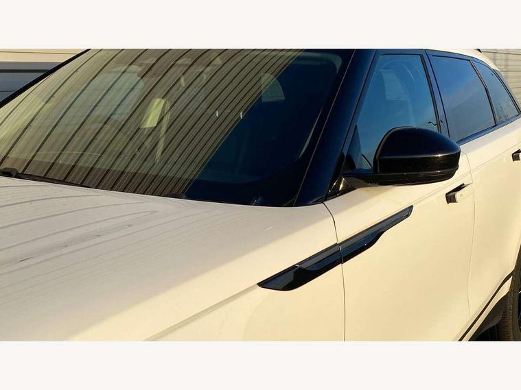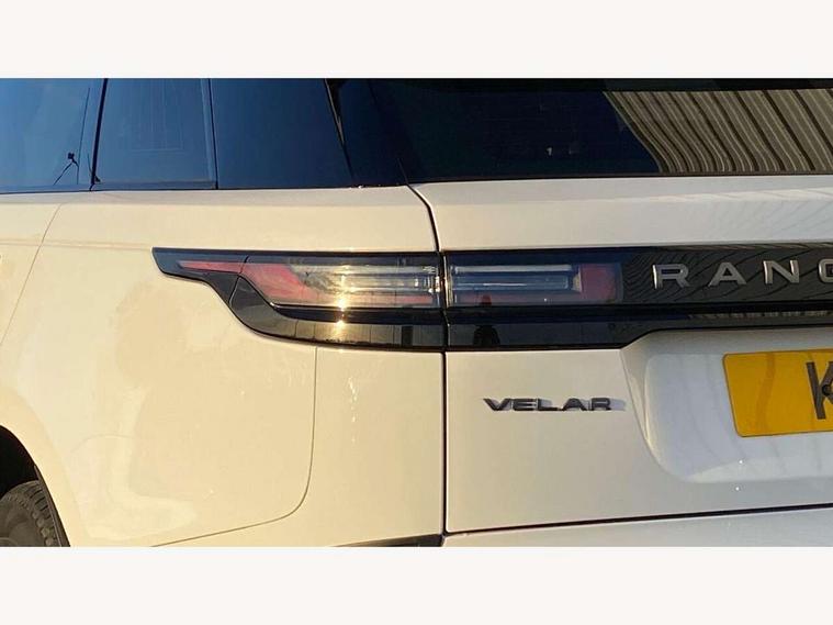 Android Auto, Apple CarPlay, Bluetooth connectivity, Brake pad wear indicator warning light, Driver condition monitor, eCall emergency call system, Front and rear parking aid, InControl remote, Land Rover InControl apps, Lane keep assist, Pivi pro with connected navigation, Service indicator, Speed proportional electronic power assisted steering (EPAS), Traffic sign recognition with adaptive speed limiter, Trip computer, Voice control system, Wireless device charging, 8 speed automatic transmission, All terrain progress control, Coil suspension system, Open differential with torque vectoring by braking, Single speed transfer box, DAB radio, Steering wheel mounted controls, 3rd brake light, Acoustic laminated windscreen, Auto dimming interior rear view mirror, Auto high beam assist, Automatic headlamp levelling, Automatic headlights, Body coloured bumpers, Boot protection plate, Electric windows with one touch open/close and anti trap, Flush deployable exterior door handles, Follow me home headlights, Heated rear window with timer, Heated washer jets, LED headlights with signature DRL, Metal front tread plates, Metal load space scuff plates, Power fold, auto-dimming, heated door mirrors with memory and approach lights, Rain sensor windscreen wipers, Rear animated directional indicators, Rear fog lights, Rear side wing doors, Rear wash/wipe, Tailgate/boot lid spoiler, Trailer stability assist, Velar badge, 14 way electrically adjustable front seats with driver's memory function, 3 seat bench in 2nd row, Ambient lighting, Driver/passenger sunvisors with illuminated vanity mirrors, Electrically adjustable steering column, Heated steering wheel, Isofix system on outer rear seats, Light oyster morzine headlining, Loadspace cover, Overhead lighting console, Overhead stowage for sunglasses, Passive front headrests, Rear air vents, Rear centre headrest, Single front passenger seat, Twin front cupholders, Twin sliding front centre armrest, Online pack with data plan - Velar, Power socket pack 2 - Velar, 355mm Front and 325mm Rear brakes, 3x3 point rear seatbelts, Anti-lock braking system (ABS), Cornering brake control, Curtain airbags, Customer configurable autolock, Door side intrusion beams, Driver airbag, DSC - Dynamic Stability Control, Electronic brake force distribution, Electronic parking brake, Electronic traction control, Emergency braking, Front and rear seatbelt reminder, Hill descent control, Hill launch assist, Low traction launch, Passenger airbag, Power operated child locks, Rear airbags, Roll stability control, Side airbags, Tyre pressure monitoring system (TPMS), Global lock and unlock switch on driver door, Immobiliser, Intrusion sensor, Keyless entry, Lock only switch on front passenger door, Locking wheel nuts, Perimetric alarm, Remote central locking, All season tyres,