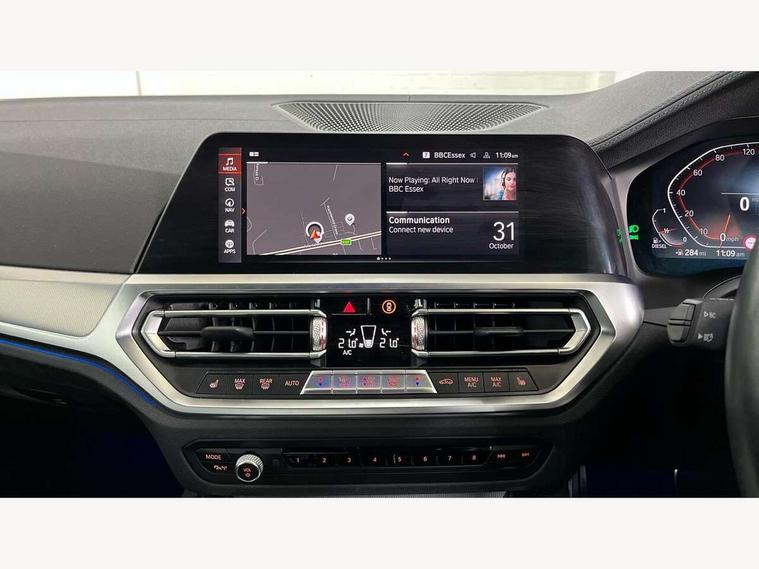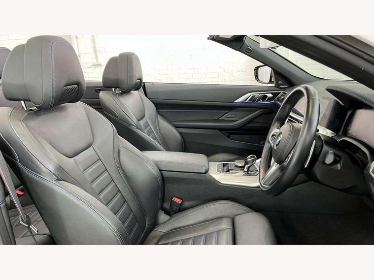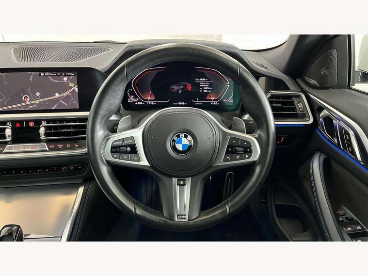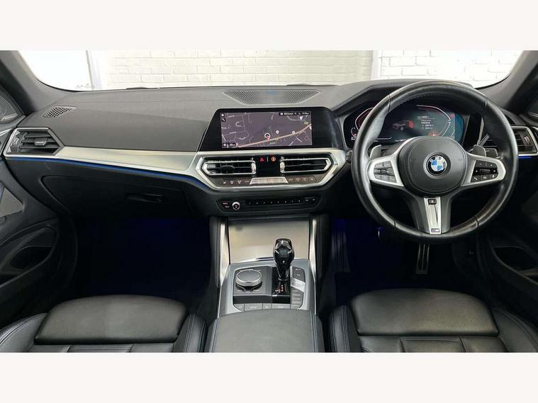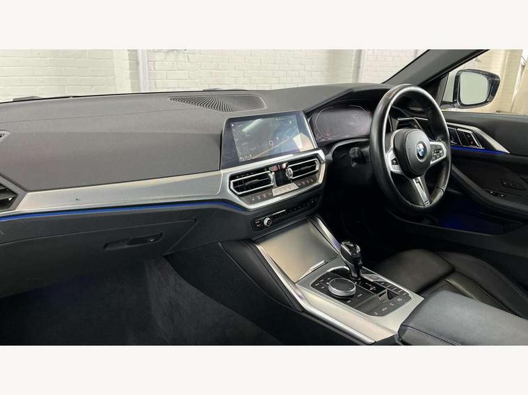 Active guard plus, Attentiveness assist, Auto start-stop, Bluetooth hands free facility with USB audio interface with audio streaming, BMW ConnectedDrive online services, BMW iDrive controller on centre console, BMW Live Cockpit Professional Nav with 12.3" instrument display + 10.25" display, Intelligent Voice Assist, BMW OS 7, HDD, 2USB, 4G LTE connect, BMW service history, BMW Teleservices, Brake pad wear indicator in front and rear, Check Control warning system for monitoring of lights and door/luggage compartment open warning, Condition based service, Cruise control with brake assist, Electric power steering, Electric power steering with Servotronic steering optimised at all speed ranges, Gearshift time display in manual mode, Instrument cluster with speedometer with mph readout, tachometer, fuel gauge and oil temperature gauge, Integrated owners handbook, Oil sensor for level and grade, warning by check control system, On board computer - average speed, fuel consumption, outside temp display with acoustic warning, clock/date, service interval, odometer/trip meter, Optimum shift indicator, Variable sport steering, 48V Mild hybrid technology, 8 speed automatic steptronic transmission with gearshift paddles, Balanced 50/50 weight distribution, Diesel particulate filter, Drive performance control - ECO PRO, comfort and sport modes, Incorrect fuelling protection, Low centre of gravity, M sport suspension, Stroke dependent dampers, DAB tuner, Electronic service booklet, Acoustic glazing, Adaptive LED Headlights, Automatic headlight beam throw control with load dependent regulating reaction, dynamic compensation of braking dive and acceleration squat, Automatically dimming electrochromatic rear view mirror, BMW emblem on engine compartment lid and tailgate, BMW kidney grille with mesh grille front side of the nuggets in matt aluminium and frame in chrome high gloss, Body colour fuel filler flap, Body colour roof fin, Brushed aluminium inserts in the front door sill finishers with BMW designation, Dynamic brake lights, Electric windows - front and rear, with open/close fingertip control, anti trap facility and comfort closing function all round, Exhaust tailpipe - split left and right, Exterior mirrors - electrically folding with anti-dazzle, Fading support, Front and rear bumper system, Front apron plastic in body colour, Green tinted heat protection glazing, High gloss shadow line exterior trim, Illuminated bow type door handles in body colour drivers side with door lock, Interior rear view electrochromatic mirror with automatic anti dazzle function, LED front fog lights, Licence plate panel integrated into front bumper and tailgate, Lightweight engineering, M designation on front side panels, left and right, Model designation on right side of tailgate, One piece front bumper cover including towing eye cover in body colour, Preparation for high beam assistant, Rain sensor, Side frame decorative moulding black matt, Two part LED tailights in L-shape with components in smoked glass, brake light, LED turn indicator and rear fog light, Visible VIN plate, Welcome lights in interior and door handle area, Widened track and increased camber values for max transverse dynamics, agility and steering precision, Window recess cover black high gloss, Windscreen wipers with integrated washing jets, 12V power socket in front centre console, 2 front cupholder in centre console with clamping elements and matt black inlay, 2 Rear seat headrests, 3 spoke M sport leather multifunction steering wheel, 3 zone automatic air conditioning, 4 pieces lashing eyelets in luggage compartment, 40:20:40 split folding rear seat and rear centre armrest with two cupholders, Ambient lighting with welcome carpet light, Armrest integrated in front and rear door trim + front centre console armrest, Electric seat adjustment with memory, Four grab handles integrated in roof lining, Front and rear door exit lighting (left / right), Front and rear door pockets, Front and rear footwell lights, Front and rear reading lights, Front headrests, Front seat backrest width adjustment, Front sport seats, Heated driver and front passenger seats, Height adjustable mechanically and infinitely variable steering column, Illuminated armrest storage compartment, Illuminated glove compartment with separate small compartment, Luggage compartment light, Make-up mirror lights, Storage compartment in rear centre console, Sunvisors with vanity mirrors and ticket pocket, Toolkit located in luggage compartment, Velour front floor mats, Vernasca leather upholstery, Connected professional package - 4 Series, M sport exterior styling pack - 4 Series, Park assist pack - 4 Series, 2 x 3-point rear seatbelts, Battery safety cut-off, BMW emergency call, Brake energy regeneration, Braking pre-tensioning, Child proof locking system in rear door, Child seat ISOFIX attachment for the two outer rear seats, Coasting in idle in ECO PRO mode, Cornering brake control (CBC), Crash sensor activating of airbags, Unlocking doors, hazard warning lights, interior light, safety battery terminal, Driver and front passenger side airbags, integrated in the door side seat backrest bolsters for all seat variants, Driver/Front Passenger airbags, Dry braking, Dynamic brake control, Dynamic stability control + (DSC+) - Anti-lock Braking System (ABS) with brake assist and cornering brake control + Automatic Stability Control (ASC), Dynamic Traction Control - DTC, Electric parking brake including automatic hold function and automatic release of the parking brake when driving off, Electronic differential lock control (EDLC), Front and rear ventilated brake disc, Front passenger manual airbag deactivation, Head airbags for all 4 outer seats, Hill start assistant, Seat belt security check for driver and front passenger, Seat belt with belt stopper, pyrotechnic belt tensioners and belt force limiters, Side impact protection, Tyre pressure monitoring with three level warning strategy, Warning
