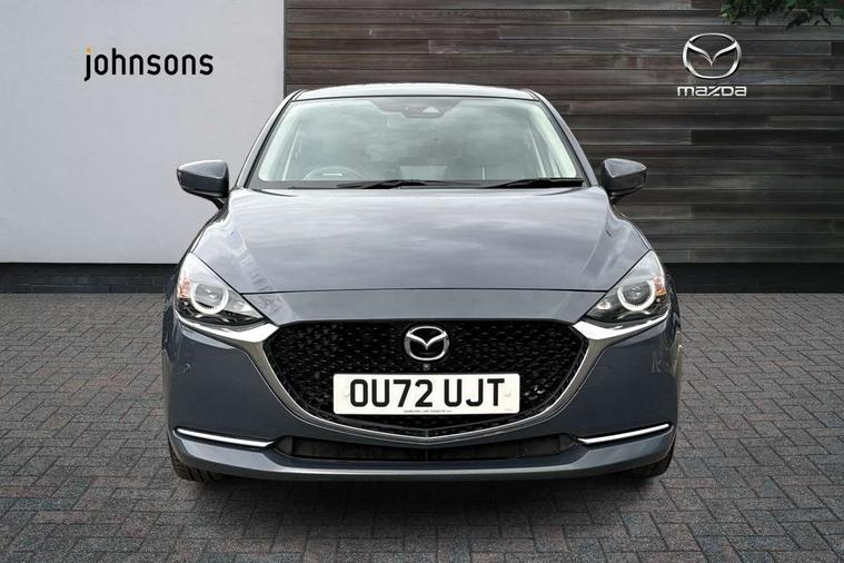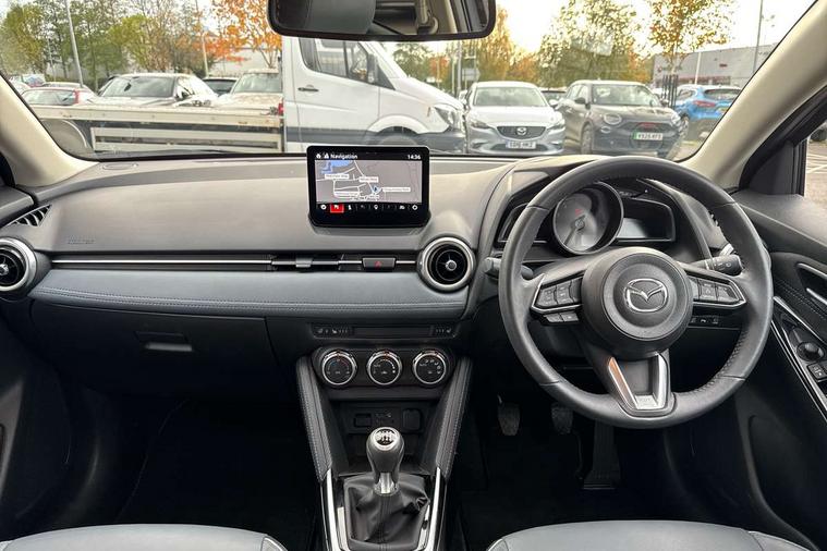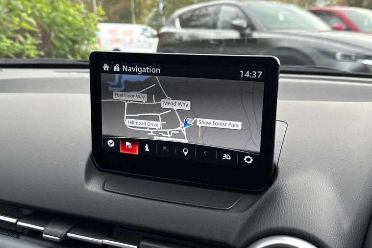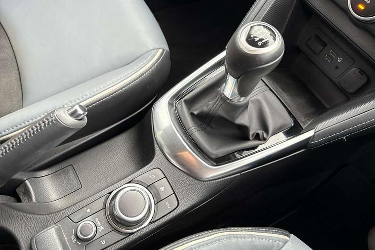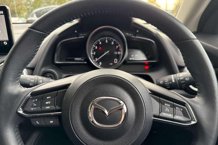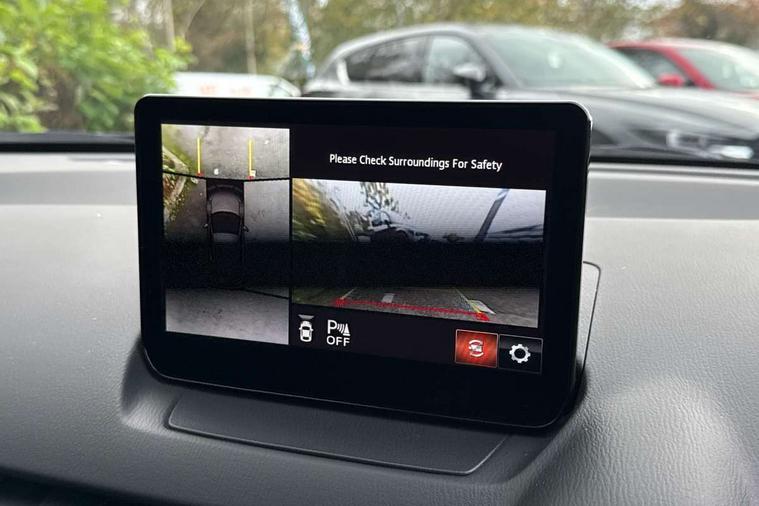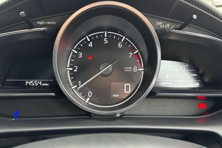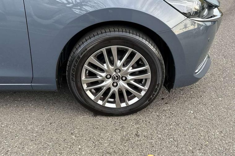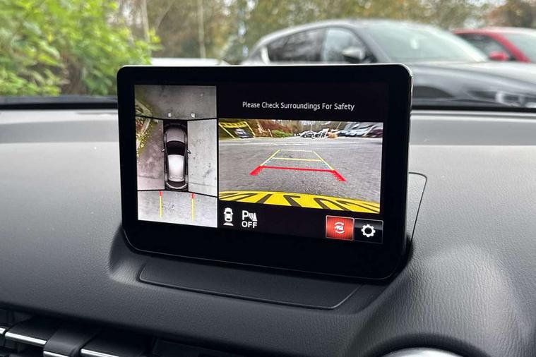 360 View Monitor, Adjustable speed limiter, Analogue rev counter, Blind spot monitoring with rear cross traffic alert, Cruise control, Digital instrument cluster, Digital speed display meter, Driver attention alert system, E-call, Emergency stop signalling system, Engine start/stop button, Front and rear parking sensors, Head up display - Colour active driving display, Integrated bluetooth, Lane departure warning system, Lane keep assist, Mazda connect with 8" colour touch screen, Navigation system, PAS, Service indicator, Trip computer, Wireless Apple CarPlay and wired Android Auto, i-stop, AM/FM/DAB radio with 6 speakers with USB and AUX inputs, Multimedia Commander including separate volume dial, Steering wheel mounted audio/bluetooth controls, Adaptive LED Headlights, Auto dimming rear view mirror, Auto headlight levelling, Body colour door mirrors, Body coloured front bumper with bright lower bezel, Body coloured rear bumper with bright lower mouldings, Chrome exhaust tailpipes, Chrome finish signature wing on front grille, Chrome front lower bezel, Chrome rear lower bezel, Coming/leaving home lighting function, Dusk sensing headlights, Electric adjustable/heated/folding door mirrors, Electric front/rear windows with one touch auto up/down for driver's window, Gloss black front grille, LED indicator lights, LED third brake light, Privacy glass, Rain sensing front wipers with adjustable sensitivity and speed, Rear side wing doors, Rear wiper, Shark fin antenna, Signature LED daytime running lights, 3 seat bench in 2nd row, 60/40 split rear seats, Climate control air conditioning, Driver, Front passenger and two rear grab handles with coathooks, Drivers seat manual slide recline and height adjustment, Drivers/front passengers covered vanity mirrors and drivers ticket holder, Folding rear seats, Front centre storage with two cupholders, Front head restraints, Front passenger and driver door pockets, Front passenger seat manual slide, recline and height adjust, Front passenger seatback pockets, Gear shift indicator, Glovebox, Heated front seats with 3 stage setting, Heated leather steering wheel, Interior courtesy light with integrated spotlight, ISOFIX child seat anchorage points attached on outer rear seats, Leather gear knob, Leather handbrake, Leather upholstery with black granlux inserts, Luggage compartment light, Satin silver dials, Single front passenger seat, Three height adjustable rear head restraints, Tilt/telescopic adjustable steering wheel, 2x3 point front seatbelts with pre-tensioners, 3 point seatbelts on all rear seats, Anti-lock braking system (ABS), Collision mitigation braking system, Dynamic stability control + Traction control, ESP, Front and rear curtain airbags, Front driver, passenger and rear seat seatbelt warning, Front dual stage driver and single stage front passenger airbags, Front side airbags, Front smart city brake support, G-Vectoring control plus, Hill launch assist, Manual child lock in rear doors, Passenger airbag cut-off switch, Rear smart city brake support, Tyre pressure monitoring system, Deadlocking system, Immobiliser, Power door locks, Remote central locking, Smart keyless entry, Thatcham accredited alarm and immobiliser, Blue/grey soft touch dashboard, 16" Bright finish alloy wheels, Emergency tyre repair kit,
