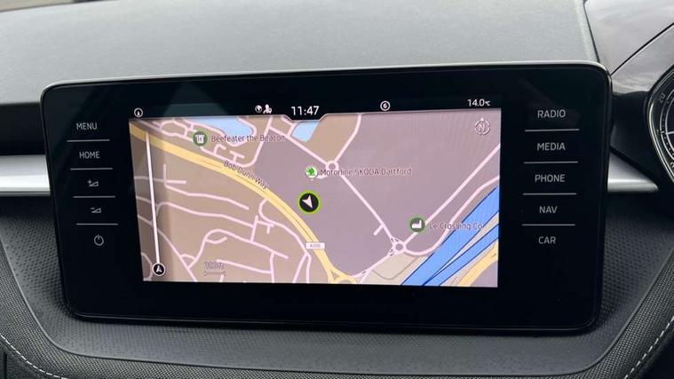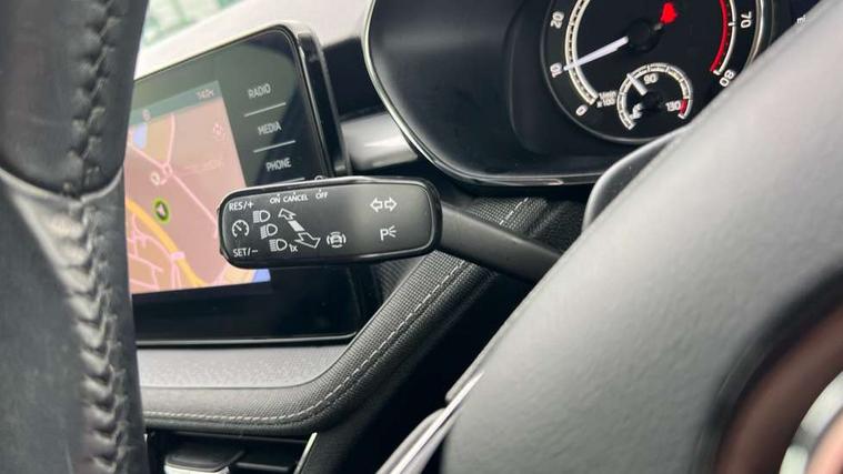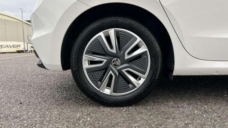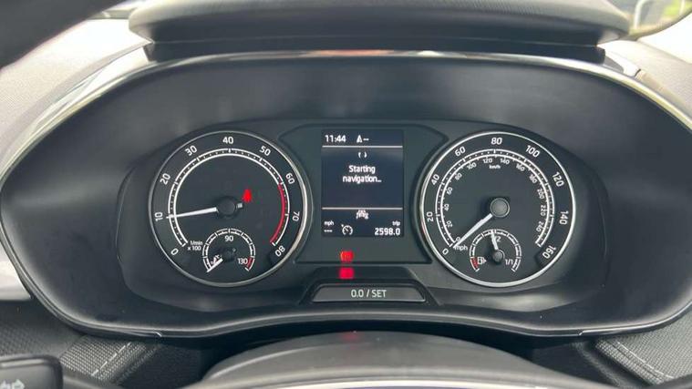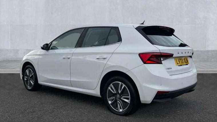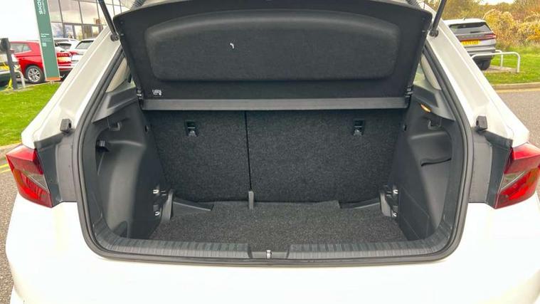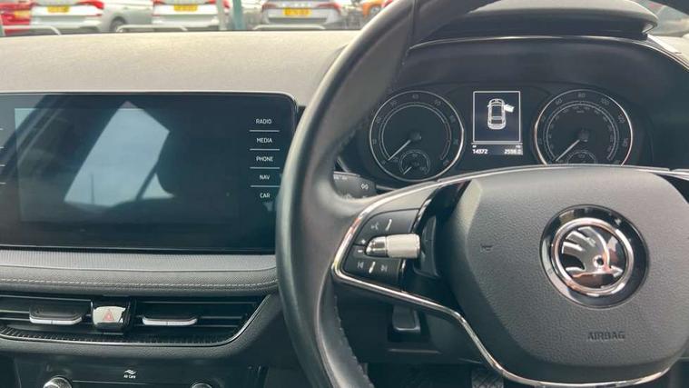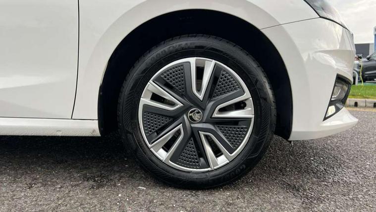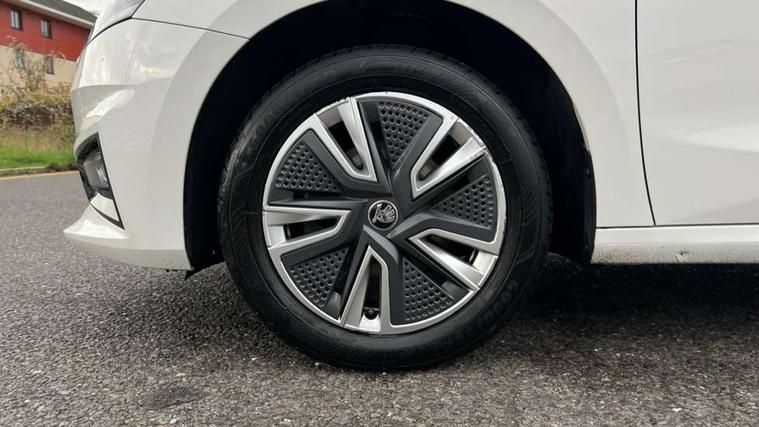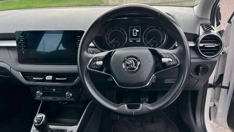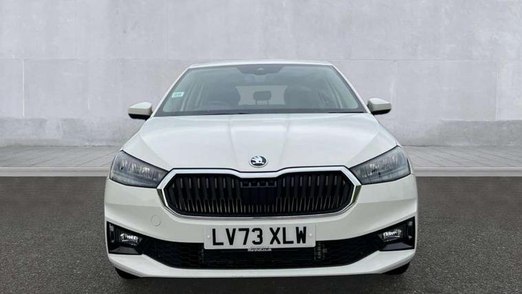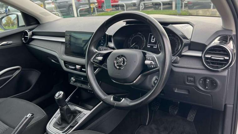 Bluetooth connection, Driver alert system - DAS, Electromechanical power steering, Exterior temperature gauge, Service interval indicator, 2x USB-C in the front (for data transmission and charging), 6 Speakers (4 in front and 2 in rear), Auxiliary socket for external MP3 player, DAB digital radio reception, Web radio, Auto dimming rear view mirror, Body colour door mirrors, Body coloured bumpers, Chrome window surround, Door mirror integrated indicators, Electrically adjustable and heated door mirrors, Front and rear electric windows, Front window wiper intermittent control, Headlight range control - Automatic, Ice scraper in fuel cap, LED daytime running lights with coming and leaving home feature, Rear LED fog light, Rear side wing doors, Rear window wiper with washing nozzles, Roof mounted spoiler, SKODA tailgate lettering in chrome, Third brake light, 3 rear headrests, Backrest split and folding, Central console with fixed cup holder and storage box, Chrome handbrake release button, Comfort seats, Fabric upholstery, Front centre armrest, Gearshift knob/handle in leather, Hand brake lever handle in leather, Height adjustable front headrests, Height adjustable front seats, Height adjustable steering wheel, ISOFIX and TopTether anchorage points to the outer rear seats, ISOFIX and TopTether on the front passenger seat, Luggage compartment lighting, Manually adjustable lumbar support in front seats, Pollen filter, Rear seat bench unsplit, Removable cup holder, Single front passenger seat, Storm grey headlining, Sun visors with mirror and airbag label on passenger side, Textile floor mats, Ticket holder, Umbrella in drivers door, Ambient lighting pack 2 - Fabia Hatchback, 3-point height adjustable front seats belts with pretensioner and force limiter, Automatic warning lights in case of crash, Driver and passengers airbag with switch off function, e-Call+, ESC including ABS, MSR, ASR, EDS, HBA and XDS, Front and rear seat belt warning, FRONT ASSIST (AEB City and AEB Inter Urban), Front side airbags, Head airbags, One tone horn, Pedestrian protection, Three rear 3-points safety seat belts with pretensioner and force limiter including stop function for outer rear seat belts, Tyre pressure monitoring system, Anti-theft alarm system including immobiliser, interior monitoring, backup horn, and towing protection, Chrome edged air vents, Satin black door and side trim panel in front, Anti-theft wheel bolts protection, Super-low rolling resistance tyres,