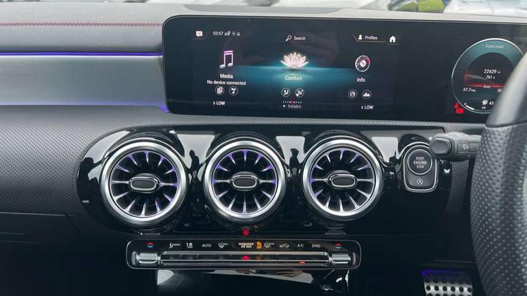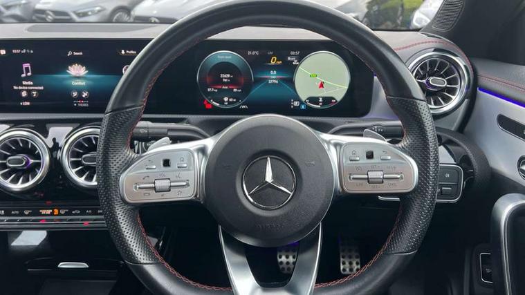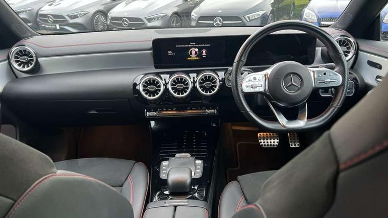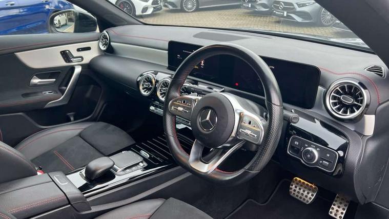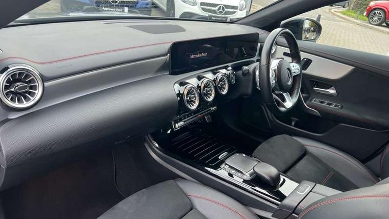 10.25 inch Instrument display with digital cockpit, 10.25 inch touchscreen central media display, Active lane keeping assist, Attention assist - Monitors steering behaviour and long journey fatigue, Blind spot assist, Bluetooth connection, Car wash mode, Cruise control with limiter, Direct steer system with speed sensitive power steering, DYNAMIC SELECT with a choice of driving modes (ECO, Comfort, Sport and Individual), ECO start/stop function, Fluid level warning indicator for fuel, oil, coolant and washer fluid, Hard-disk navigation, Hey Mercedes Voice activation, Lamp failure indicator, Mercedes me connect including emergency call system, accident recovery, breakdown and maintenance management, Mercedes me remote services, Outside temperature gauge, Owners manual and service booklet in English, Pre-installation of private car share, Preinstallation for Mercedes Benz link, Radio aerial integrated into front and rear windshields, Service indicator (ASSYST), Smartphone integration with Apple CarPlay and Android auto, Speed limit assist, Traffic sign assist, Trip computer in multifunction display with current consumption indicator, Lowered comfort suspension, Rear axle multi-link, DAB digital radio tuner, MBUX multimedia system, Mid-range sound system, USB (type C) ports (2) in stowage compartment and 1 in front of centre console, Adaptive brake lights, AMG body styling with AMG front apron and rear apron and visible exhaust tailpipe in chrome trim elements, AMG bodystyling side skirts, Body colour bumpers, Body colour door handles, Chrome beltline strips, Diamond radiator grille pins in chrome, Electric panoramic sunroof with automatic tilt and convenience closing fuinctions, rain sensor auto closing and electronic roller sunblind, Electric windows, Electrically adjustable and heated door mirrors with integrated LED indicators, Exhaust system with 2 Visible tailpipe trim elements and rear apron with trim in chrome, Headlamp assist automatic headlamp activation, Heated glass rear windscreen + timer control, High level LED third brake light, Integrated LED daytime running lights, Interior mirror with black reading lamps and frameless, LED tail lamp, Multibeam LED headlamps with adaptive highbeam assist plus, Privacy glass with dark tinting on rear side windows and rear window, Rain sensing windscreen wipers with two sensitivity settings, Rear boot, Rear fog lamp, Rear side wing doors, Variable front intermittent wipers, Window line trim strip in chrome, 3 seat bench in 2nd row, 3 spoke flattened bottom nappa leather multifunction steering wheel with perforated leather in grip area, 40:20:40 split folding rear seat backrests, Air conditioning - Two zone thermotronic luxury automatic climate control with display, Air vents with surround in silver chrome, Artico man-made leather upholstery, Automatic child seat recognition sensor, Black roof lining, Brushed stainless steel sports pedals with rubber studs, Electrically adjustable front memory seats including lumbar support, Floor mats with stitched AMG lettering, Front centre armrest with stowage, Galvanished gear shift paddles on steering wheel, Heated front seats, Illuminated front door sills with changeable cover, Illuminated glove compartment stowage, Interior lighting - 64 colour Ambient lighting, Luggage net on driver/front passenger seat backrest, Manually adjustable front seats, Manually height and reach adjustable steering column, Rear armrest with two integral cup holders for drinks, Rear head restraints, Single front passenger seat, Sport seats with fixed head restraints, Stowage compartment in centre console with retractable cover, Sunvisors with illuminated vanity mirrors, Touchpad on center console, Twin front cupholders, Two outer rear seat isofix and top tether child seat fixing points, Keyless go comfort pack - CLA, Light and sight pack - CLA, Mirror pack - CLA, Night package - CLA, Parking package - CLA, Active bonnet pedestrain safety measure which detects an impact and raises bonnet by 65mm, Active brake assist includes forward collision warning system with autonomous braking, Adaptive brake assist with hold function and hill start assist, Anti lock braking system (ABS) with brake assist, Black seat belts, Bonnet with power domes, Brake pad wear warning indicator, Childproof locks manually operated for rear doors and electrically operated for rear power windows, Crash responsive emergency lighting, Driver and front passenger head and sidebags, Driver and front passenger windowbags, Drivers knee airbag, Dual stage driver and front passenger airbags, Electric parking brake, Electronic stability programme with acceleration skid control, ESP curve dynamic assist, Exit warning, Front and rear seatbelt reminder, Front passenger seat occupancy sensor, Three point rear seat belts, Tyre pressure monitoring system, Warning triangle and first aid kit, Guard 360 degree guard vehicle protection system with immobiliser and interior protection, Remote central locking and crash sensor with emergency opening function, Light aluminium with longitudinal grain interior trim, 19" AMG multi-spoke black painted light alloy wheels with high sheen rim finish, Summer tyres, Tirefit tyre sealant kit,