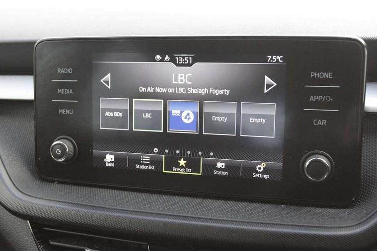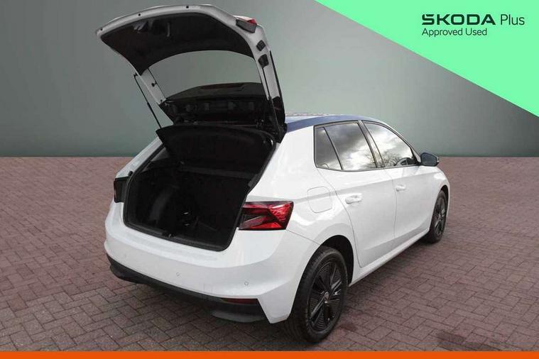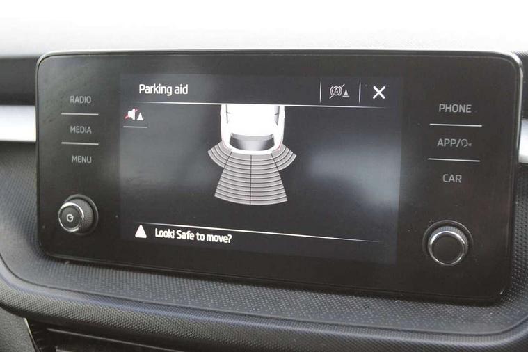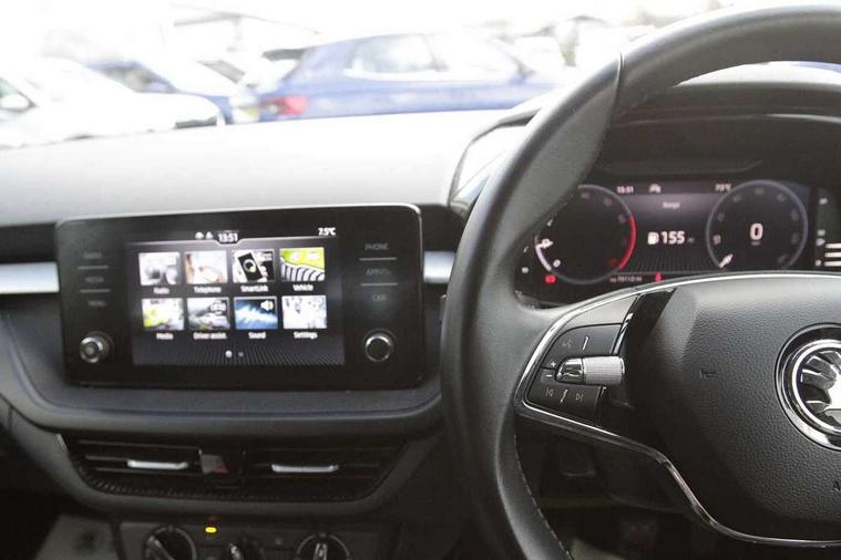 Bluetooth connection, Driver alert system - DAS, Electromechanical power steering, Exterior temperature gauge, Lane assist including road edge detection, Service interval indicator, Virtual cockpit with 10.25" colour display, 2x USB-C in the front (for data transmission and charging), 6 Speakers (4 in front and 2 in rear), Auxiliary socket for external MP3 player, Bolero radio with 8" colour display, DAB digital radio reception, Basic rear lights, Body coloured bumpers, Dimming rear view mirror with black frame, Door mirror integrated indicators, Electrically adjustable and heated door mirrors, Electrically adjustable front windows with function auto up/down, Front window wiper intermittent control, Headlight range control - Automatic, Ice scraper in fuel cap, LED daytime running lights with coming and leaving home feature, Mechanical adjustable rear windows, Privacy glass, Rear LED fog light, Rear side wing doors, Rear window wiper with washing nozzles, Roof mounted spoiler, SKODA tailgate lettering in chrome, Third brake light, 3 rear headrests, Backrest split and folding, Central console with fixed cup holder and storage box, Chrome handbrake release button, Fabric upholstery, Gearshift knob/handle in leather, Grain satin black interior door handles, Hand brake lever handle in leather, Height adjustable front headrests, Height adjustable steering wheel, ISOFIX and TopTether anchorage points to the outer rear seats, ISOFIX and TopTether on the front passenger seat, Luggage compartment lighting, Pollen filter, Rear seat bench unsplit, Single front passenger seat, Storm grey headlining, Sun visors with mirror and airbag label on passenger side, Ticket holder, Umbrella in drivers door, 3-point height adjustable front seats belts with pretensioner and force limiter, Automatic warning lights in case of crash, Driver and passengers airbag with switch off function, e-Call+, ESC including ABS, MSR, ASR, EDS, HBA and XDS, Front and rear seat belt warning, FRONT ASSIST (AEB City and AEB Inter Urban), Front side airbags, Head airbags, One tone horn, Pedestrian protection, Three rear 3-points safety seat belts with pretensioner and force limiter including stop function for outer rear seat belts, Tyre pressure monitoring system, Anti-theft alarm system including immobiliser, interior monitoring, backup horn, and towing protection, Anodized cross line upper decorative trim, Colour Edition air vents, Grain satin black central console cover, Grain satin black lower decorative trim, Satin black door and side trim panel in front, Anti-theft wheel bolts protection, Super-low rolling resistance tyres,