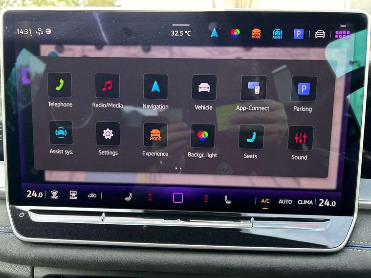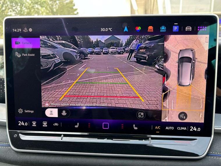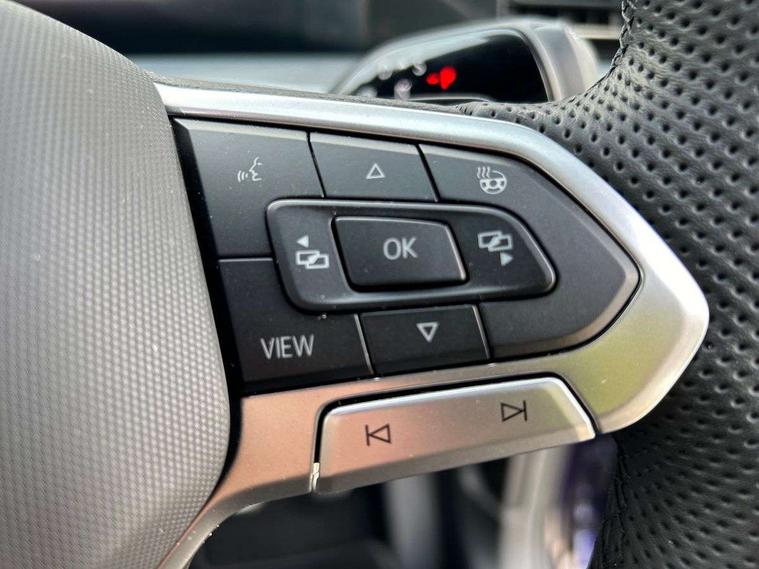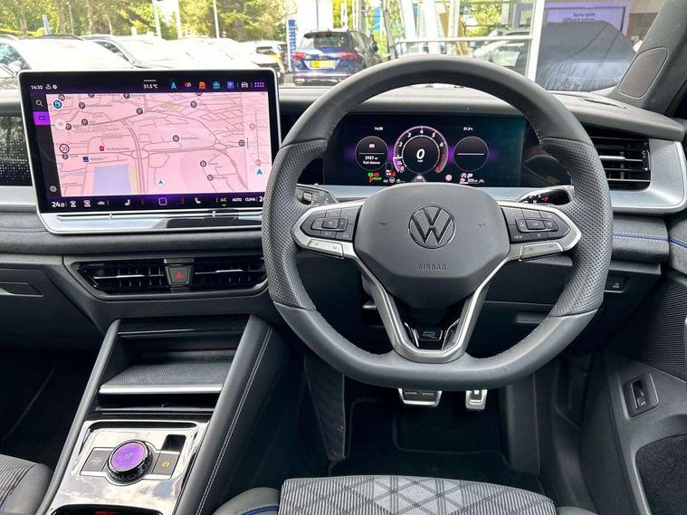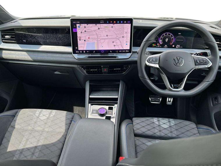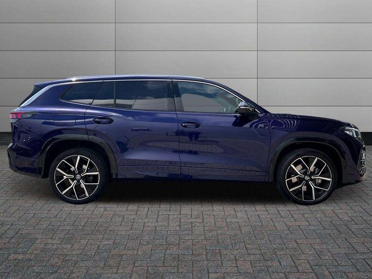 Adaptive cruise control (ACC), Digital Cockpit Pro - 10.25" high resolution dash display screen with customisable menus and information, Driver alert system, Driver attention monitoring system, Dynamic road sign display, E-Sim card for online connectivity, eCall emergency call system, Lane change system, Side assist, Rear traffic alert and Exit warning system, Multifunction front facing camera, Oncoming vehicle braking when turning including swerve support, Start/stop system with regenerative braking, Voice activation spoken voice commands for telephone and navigation system, Warning signal and warning light for front and rear seatbelts not fastened, Wireless App-Connect, Front wheel drive, Digital radio reception (DAB), Diversity antenna for FM reception, Air intake with Chrome trim, Auto dimming interior rear view mirror, Automatic headlight control system, Body colour door handles, Chrome moldings on the side windows, Coming/leaving home lighting function, Dynamic headlight range control with dynamic cornering light, Exterior mirrors convex on the left and aspherical on the right, Heat insulating glass in side and rear windows, Illuminated Volkswagen logo rear with animation, Laminated safety glass from B-pillar backwards 90% tinted, Laminated safety glass winshield, heat insulating, LED 3rd brake light, LED separate signature day time running light, Puddle lights, Rain sensor windscreen wipers, Rear fog light on one side, reversing light on both sides, Rear side wing doors, Rear wiper, Reverse activated passenger's door mirror, Surround lighting with welcome light, Volkswagen logo in front, illuminated lighting animation with wake up/goodbye scenario and illuminated door handles, 12V socket in centre console, 3 rear headrests, 3 rear seat bench in 2nd row, backrest split folding with centre armrest and 2 seats in 3rd row of seats, Black roof lining, Brushed stainless steel pedals, Carpet mats, front and rear, Centre console with illuminated storage compartment with sliding cover and two drinks holders, Chrome elements on the mirror switch and power window switches and door pulls, Door and side trim panel insert in Art velour, Flat luggage compartment floor, Front centre armrest, Front scuff plates in alumium, Interior ambient lighting with 30 colour options, ISOFIX anchors for child seats on outer rear seats and front passenger seat compatible with i-Size, Mechanical rear seat release, Power adjustable lumbar support in front, Single front passenger seat, Sports comfort seats in front, Sun visors with illuminated vanity mirrors, 3 Point seat belts in front with pretensioners, 3 point seatbelts in outer rear with ECE label, Autonomous emergency braking front assist with pedestrian and cyclist monitoring, Driver and front passenger airbag with front passenger airbag deactivation, Electronic parking brake with auto hold, First aid kit with warning triangle and safety vest, Front and rear curtain airbags, Front and rear side airbags, Front centre airbag, Front disc brakes, Hill start assist, Rear disc brakes, Two tone horn, Decorative material set R-Line, Interior door handle in matte chrome,