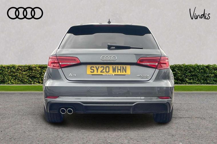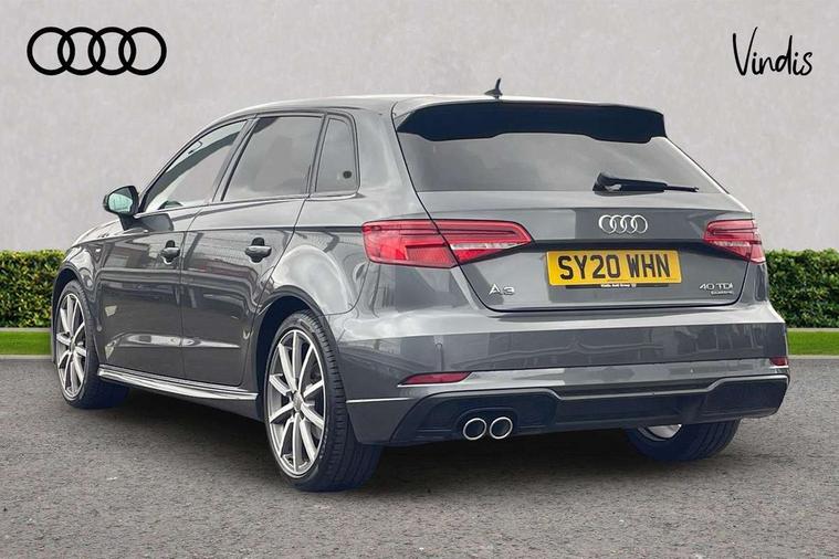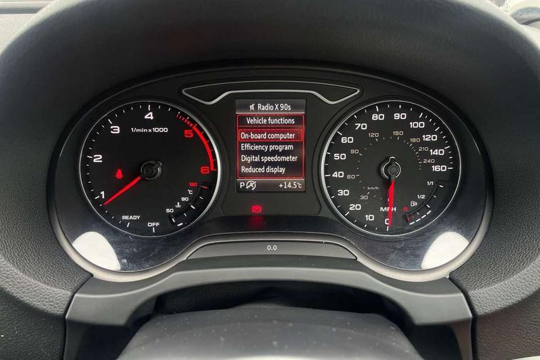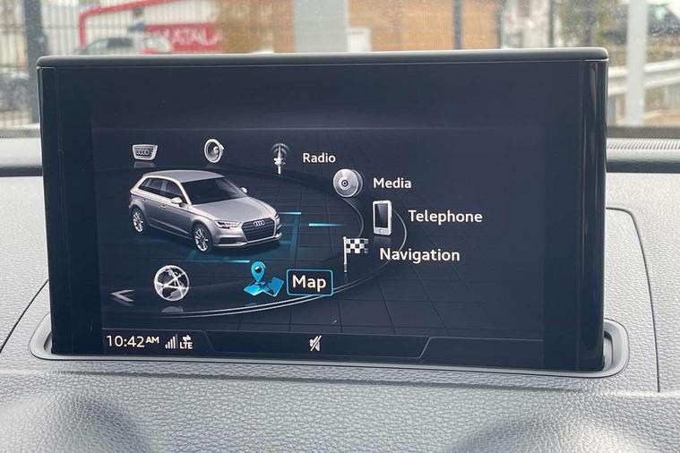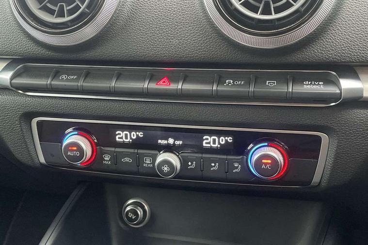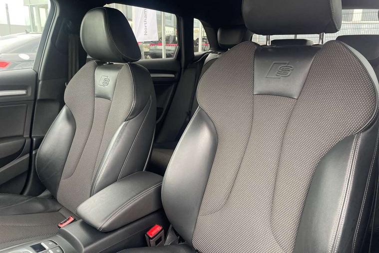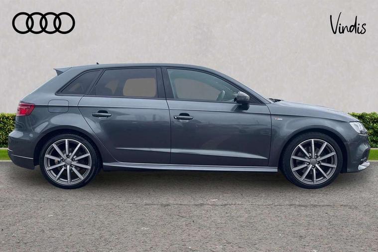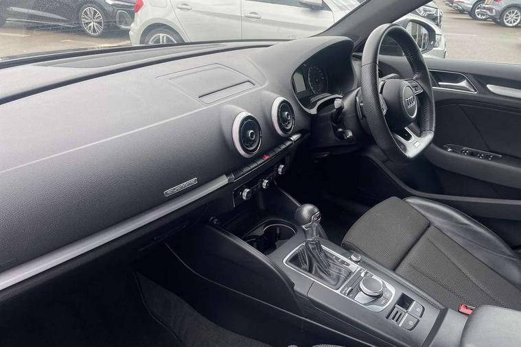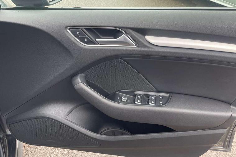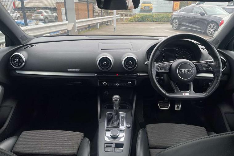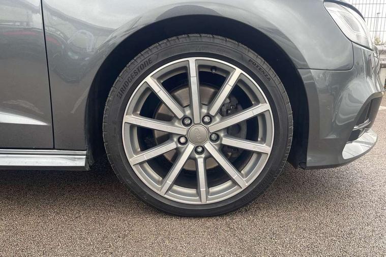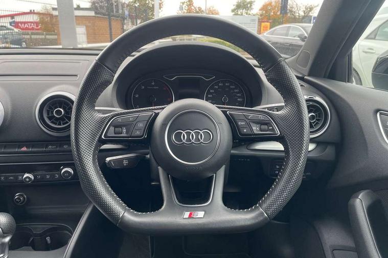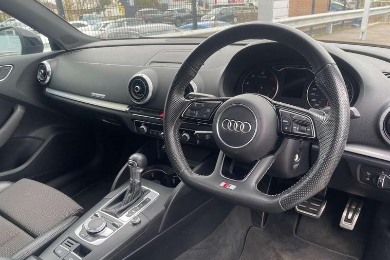 Audi drive select, Audi smartphone interface, Automatic start/stop system, Colour driver's information system display, Electro - mechanical power assisted steering, Mobile telephone preparation - bluetooth interface, SD card based MMI navigation, Service interval indicator, Speed limit display, Voice control system, Voice recognition for navigation system, Diesel particulate filter, Sports suspension, 2 USB interfaces and Aux-In jack, Audi music interface, CD player, DAB Digital radio, MMI radio plus with 7" colour MMI screen and MMI controller, Online entertainment, Auto dimming interior rear view mirror, Body colour roof spoiler with aerodynamic inserts in high gloss black, Chrome exhaust tailpipes, Electric front windows, Electric rear windows, Electrically adjustable and heated door mirrors with integrated LED side indicators, Heated windscreen washer jets, LED daytime running lights, Light and rain sensors, Privacy glass - dark tinted rear and rear side windows from B-pillar backwards, Rear wiper, Sport specific side air inlet grille and diffuser insert, 3 adjustable rear headrests, 3 spoke leather multifunction sports steering wheel with paddle shift gear change controls, 60/40 split folding rear seat, Adjustable front centre armrest, Black cloth headlining, Dual zone electronic climate control, Front and rear interior lights with delay, Front/rear floor mats, Height and reach adjustable steering wheel, Illuminated door sill trims with S logo, Isofix child seat preparation for front passenger/outer rear seats inc passenger airbag deactivation including top tether, Lashing point in luggage compartment, Manual height adjustable front seats, Stainless steel pedals, Storage compartments in doors side trims, centre console and under front drivers seat, Tool kit, Black styling pack - A3/S3, LED interior light pack - A3/RS3, Non smoking pack - A3, Storage and luggage pack - A3/RS3, 3 point seatbelts on all seats, ABS/EBD, Active bonnet, Active front headrests, Airbags - front driver/passenger, front & rear side, curtain, drivers knee, ASR, EDL, Electromechanical parking brake, ESC - Electronic Stability Control + traction control, Front passenger airbag deactivation, Hill hold assist, Manual rear child locks, Multi-Collision braking, Seatbelt warning, Tyre pressure warning, Warning triangle and first aid kit, Anti theft alarm, Anti-theft wheel bolts, Remote control central locking, Thatcham category 1 alarm + immobiliser, Aluminium air vent surrounds, Aluminium trim elements, Matt brushed aluminium inlays, 18" 10 spoke design alloy wheels in matt titanium look with diamond cut finish, Tyre repair kit,