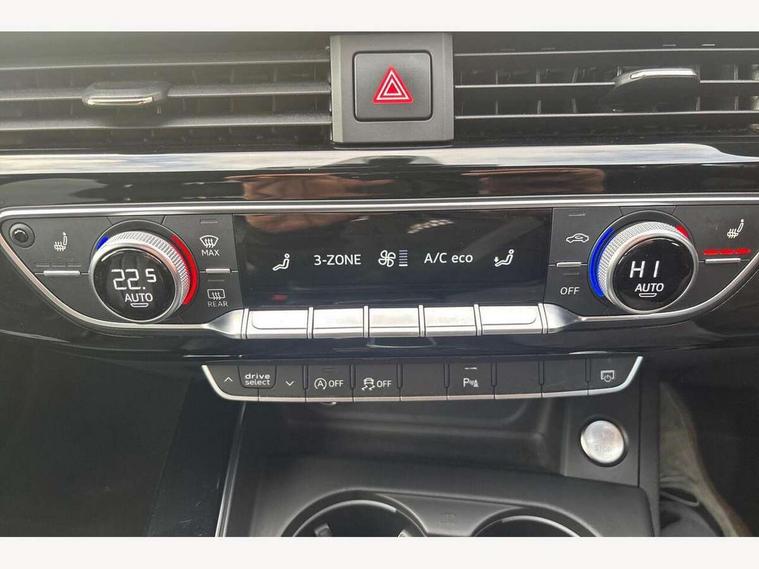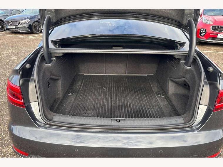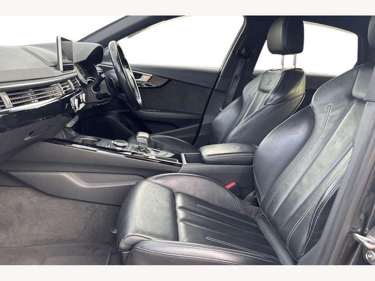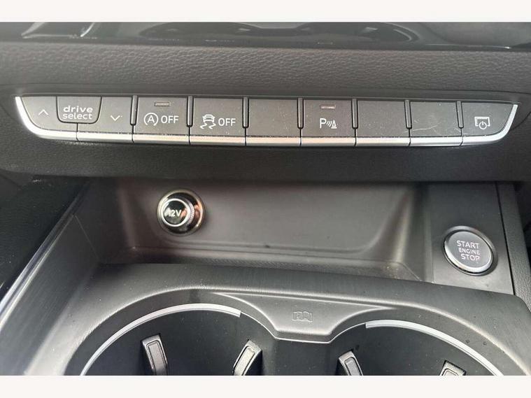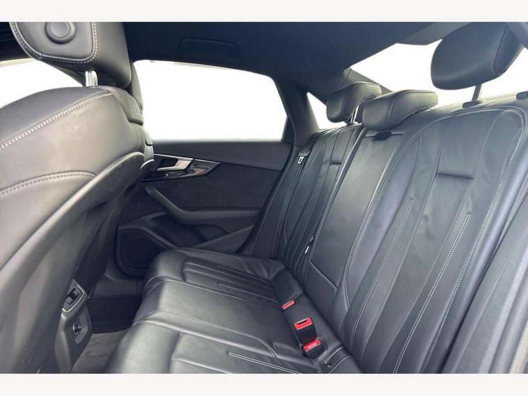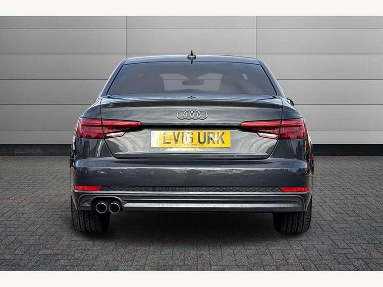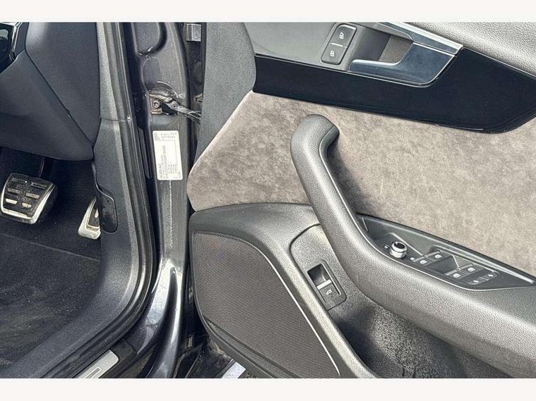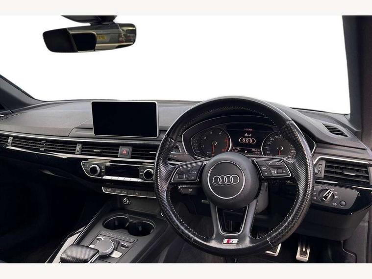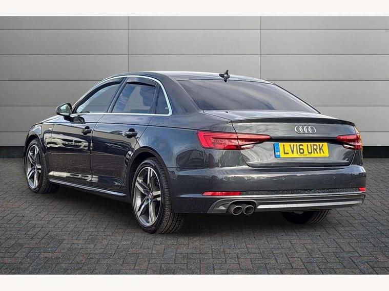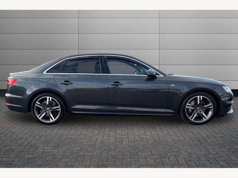 Audi drive select, Audi Pre sense collision avoidance, Auto boot lid opening, Electro-mechanical PAS, Service interval indicator, Stop/start button, Voice control system, 2 USB ports, Aux input, DAB digital radio module, MMI radio plus with CD player, Acoustic windscreen, Auto dimming rear view mirror, Automatic headlights + automatic windscreen wipers, Body colour bumpers, Body colour door mirrors, Chrome rolled exhaust, Electric adjustable heated door mirrors, Electric front windows, Electric rear windows, Headlight range control, LED daytime running lights, Rear diffuser in Twilight grey matt, Twilight grey matt radiator grille with chrome inlay, 3 zone climate control, 4 way electric lumbar support for driver and front passenger, Black cloth headlining, Front centre armrest with 12v socket, Front sport seats, Front/rear floor mats, Gearshift paddles, Illuminated door sill finishers, Isofix child seat preparation for front passenger/outer rear seats inc passenger airbag deactivation, Jack and tool kit, Perforated leather gearknob, Reach + rake adjustable steering column, Rear headrests, Split folding rear seats, Stainless steel pedals, Top tether anchor plate for isofix child seat, Exterior aluminium pack - A4, S line exterior styling pack - A4 Saloon, 3 point seatbelts on all rear seats, ABS/EBD, Adaptive driver and front passenger airbags, Electromechanical parking brake, ESP, First aid kit, Front head airbags, Front seatbelt pretensioners + load limiters, Front side airbags, Seatbelt warning, Traction control, Tyre pressure monitoring system, Warning triangle, Locking wheel bolts, Remote central locking, Thatcham category 1 alarm + immobiliser, Space saver spare wheel,