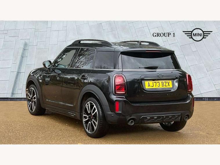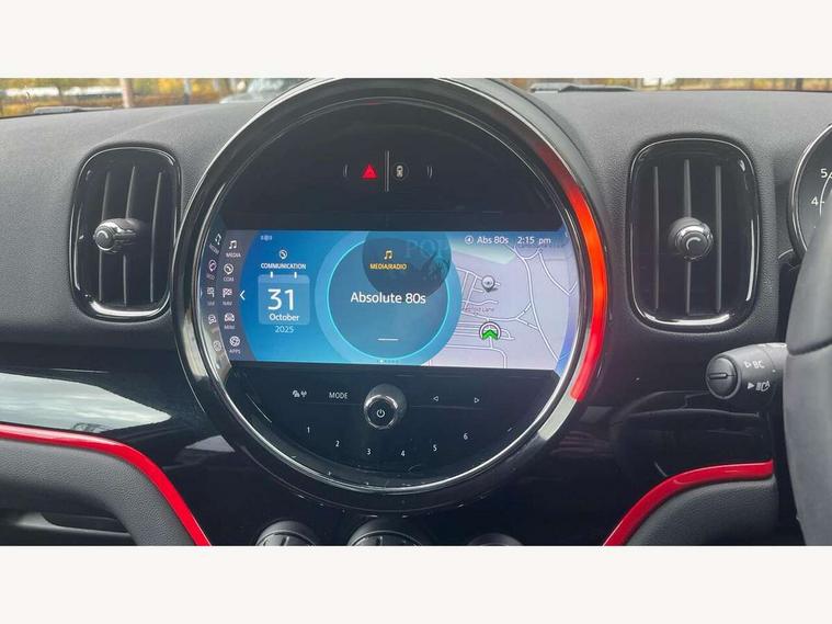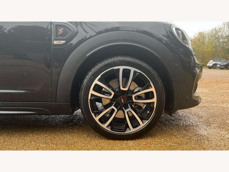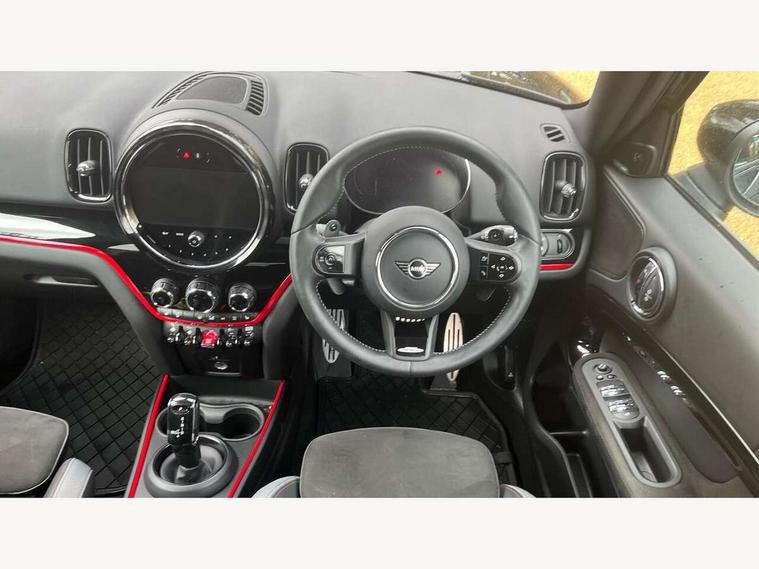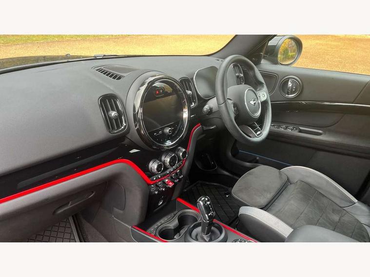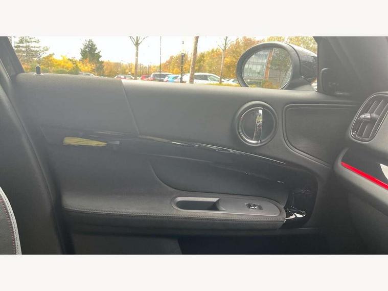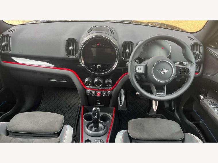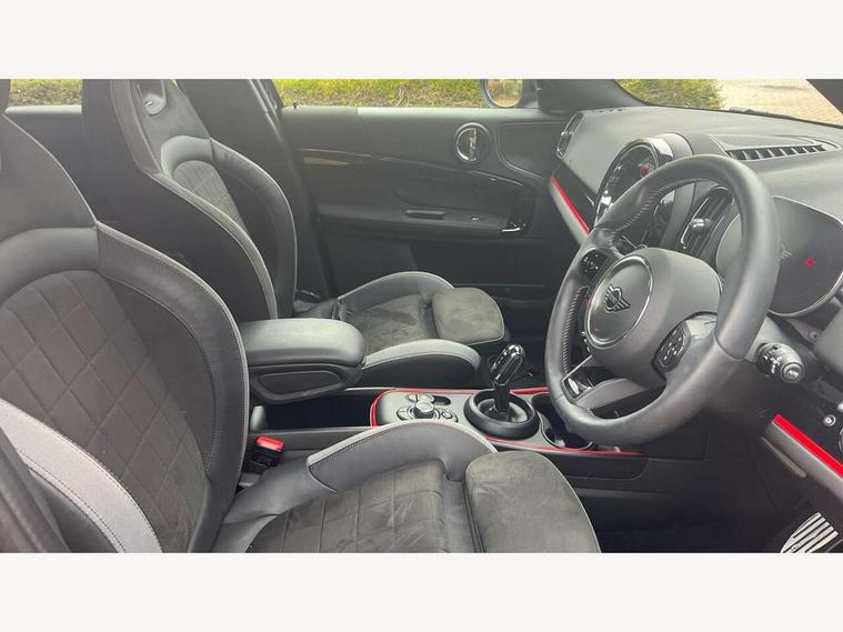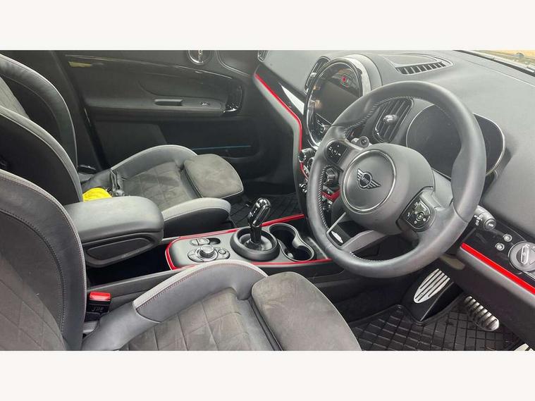 Active Guard incl speed limiting and lane departure functions with auto steering, and front collision warning with brake intervention, Automatic start/stop function with brake energy recuperation, Compatible mobile phone bluetooth with audio streaming, Cruise control with brake assist, Electro-mechanical speed dependant steering assistance, Instrument cluster, MINI Driving Modes - centre toggle switch to control driving setting (sport, mid and green), Mini E-call, On board computer, Double Vanos system, Fully variable valve control, High precision injection, Performance Control, Steptronic sport transmission with double clutch and steering wheel paddles, FM tuner and DAB digital radio, 3rd brake light, Bonnet scoop, Chrome fuel filler cap, Day time driving lights, Dynamic brake lights, Electric windows, Heated rear window, Heated windscreen washer jets, John Cooper Works - aerodynamic kit (front and rear apron, spoiler), front and rear sport bumpers and part-painted side sills with door sill finishers, John Cooper Works Logo, LED fog lights, Metal door sill strips with Cooper S imprint, Model logo, Model logo on Tailgate, Rain sensor with auto headlights, Rear fog lights, Rear side wing doors, Rear window wiper, Side scuttle panel with integrated indicator, Split rear doors, Sun/heat protection glass, White indicator lenses, 12V socket in centre console, 3 seat bench in 2nd row, 360L luggage compartment capacity, 4 lashing eyes in luggage compartment, 40:20:40 split folding rear seats, Anthracite headlining with grab handles and clothes hooks, Chrome interior highlights, Colour line - Carbon black, Cupholders, English handbook, Front headrests, Glove compartment, Height and length steering column adjustment, Interior lighting with 12 basic colours selectable via toggle switch in roof, Isofix rear child seat preparation, LED reading lights, vanity mirror lights, front foot well light and spotlight on front seats, Mini John Cooper Works leather gearshift lever and handbrake gaiters, Multifunction steering wheel, Nappa leather steering wheel with MINI Yours logo, Rear headrests, Single front passenger seat, Stainless steel pedals and foot rest, Storage compartments in doors, Sunvisors with vanity mirrors, Excitement pack - Countryman, Navigation pack - Countryman, Piano black exterior pack - Countryman Cooper S/SD/SE/Boardwalk, 2 tone horn, 3 point seatbelts on all seats, 6 Airbags - front, side, head and seat belt tensioners, Anti-lock braking system (ABS), DSC - Dynamic Stability Control, Electronic handbrake, Front and rear disc brakes, Hill start assist, Manual rear child locks, Tyre pressure monitoring system, Alarm system with tilt sensor, monitoring doors, bonnet interior and tailgate, Auto drive away locking, Deadlocking function, Electronic vehicle immobiliser, Locking wheel bolts, Start/stop toggle with keyless go, Piano black JCW interior trim, Tool kit,