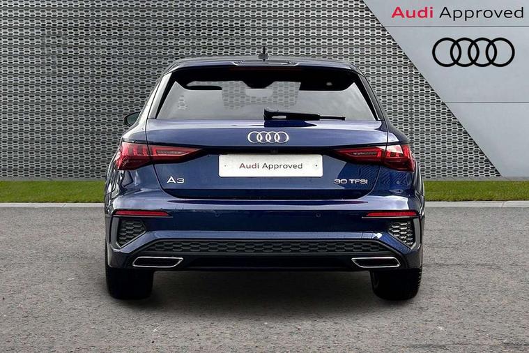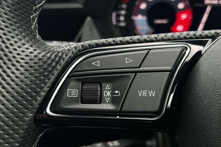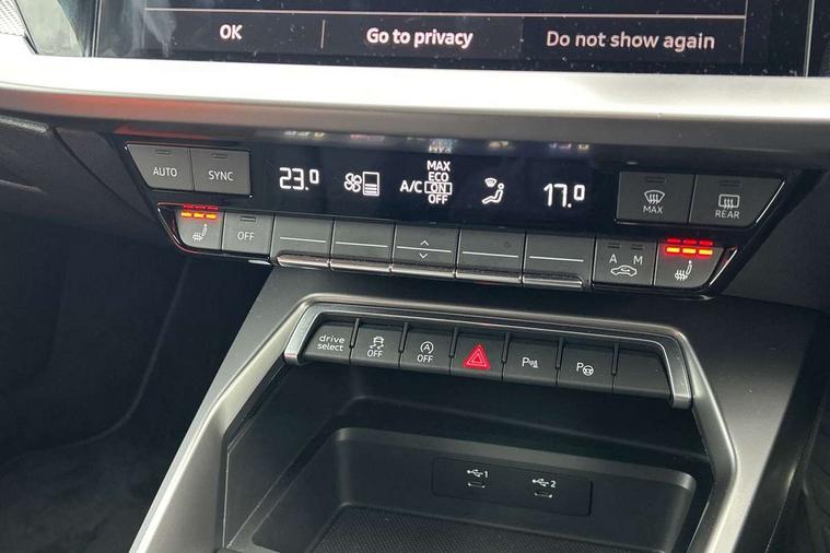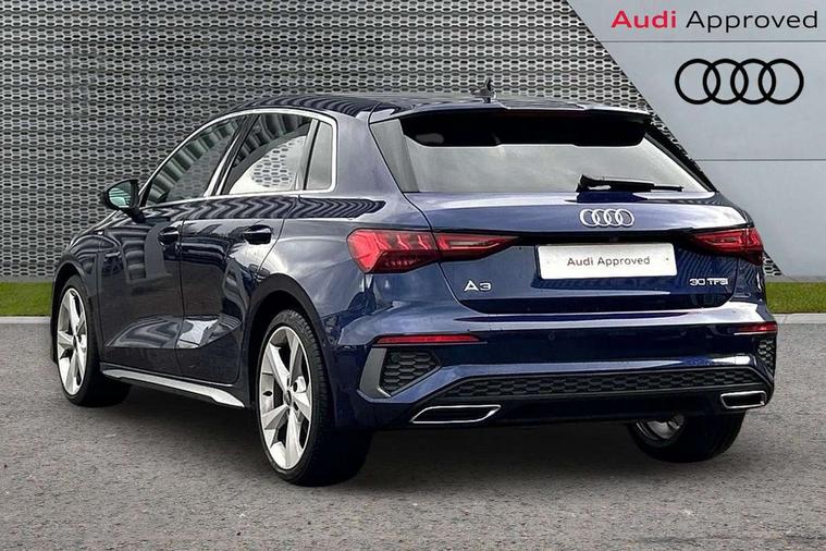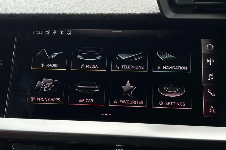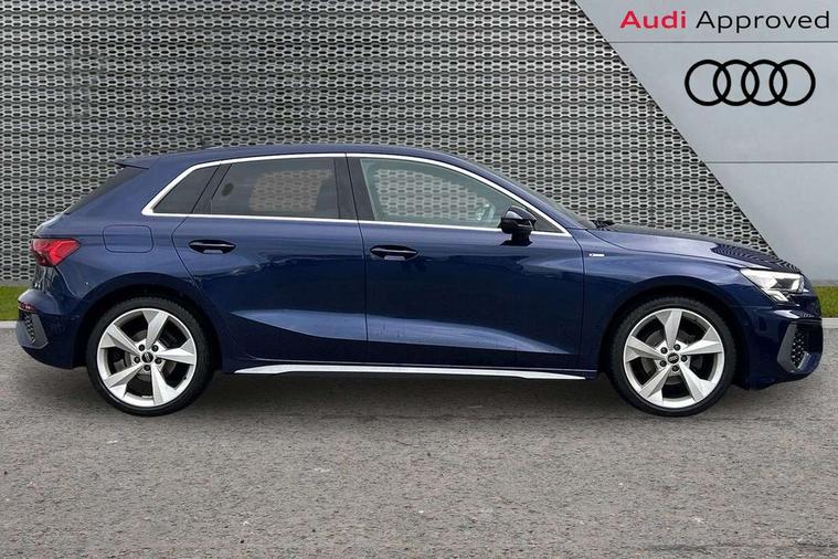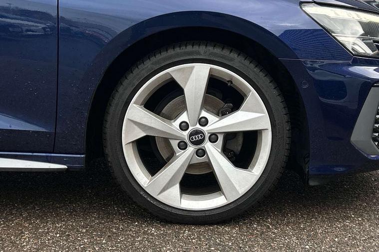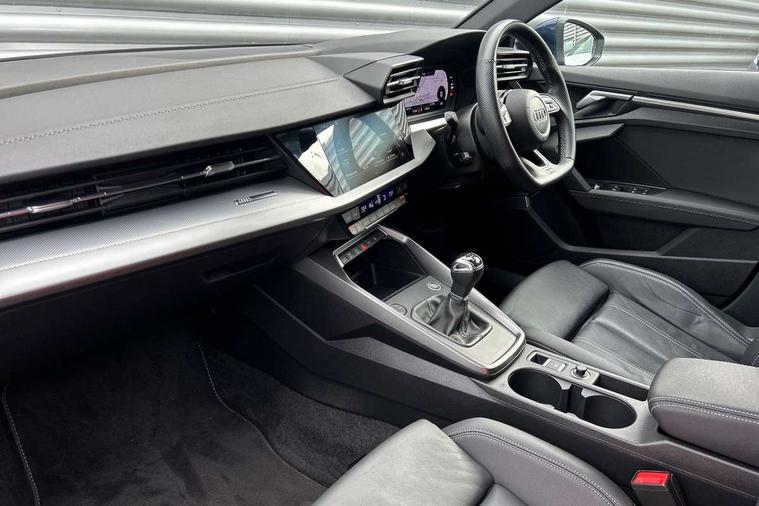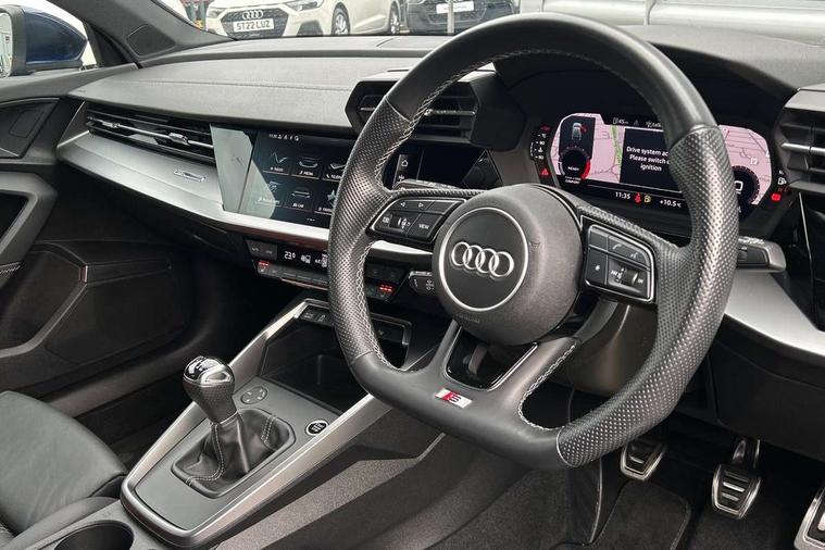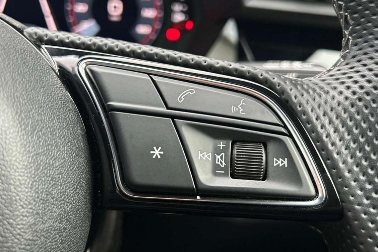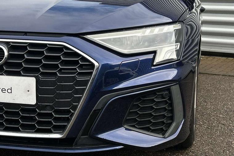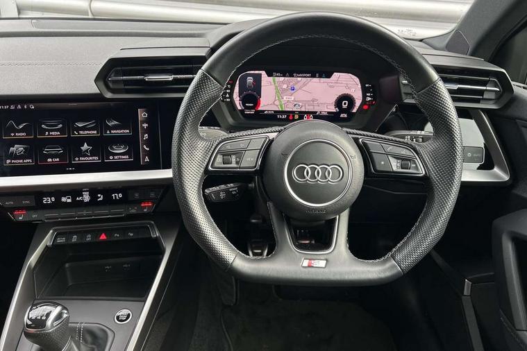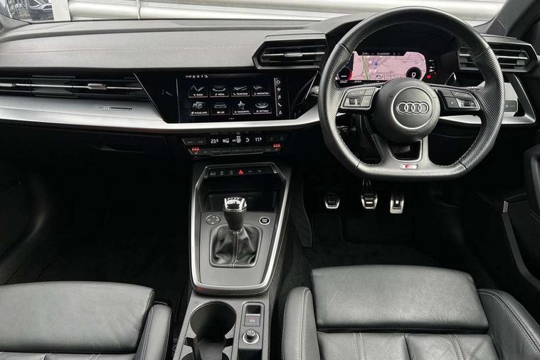Audi drive select (Auto, Comfort, Dynamic and Individual), Audi smartphone interface, Audi Virtual Cockpit - 10.25" digital and colour instrument cluster, Automatic start/stop system with recuperation, Bluetooth interface, Collision avoidance assistant, Cruise control, e-Call (emergency call), Electromechanical power speed sensitive steering, Lane departure warning system, MMI Navigation Plus with high resolution 10.1" colour touch screen display, Rear parking sensors, Service indicator, Trip computer, Voice control system with natural language interaction, 2xUSB-C connection with data and charging functions, 6 passive loudspeakers, DAB Digital radio, 3rd brake light, Acoustic glass windscreen, Aluminium window trim, Auto dimming frameless rear view mirror, Electrically adjustable/heated/folding/auto dimming door mirrors with integrated LED indications + kerb view function for passenger side, Front electric windows, Illuminated aluminium inserts front door sills with S logo, LED daytime running lights, LED headlights with LED rear lights and dynamic rear indicators, Light and rain sensors, Privacy glass - dark tinted rear window, rear door and side windows, Rear electric windows, Rear side air outlets in grained matt black, Rear side wing doors, Rear wiper, S line bumpers, S roof spoiler, 12V socket and storage compartment in front centre console, 3 seat bench in 2nd row, 40/20/40 split folding rear seat bench with cupholder, Black cloth headlining, Dual zone electronic climate control, Front and rear centre armrest in leather, Front and rear headrests, Front/rear floor mats, Height and reach adjustable steering wheel, Illuminated vanity mirror, Interior lighting - glove compartment light and right hand side, Luggage compartment floor covering, Manual boot compartment lid, Manually adjustable front seats, Seat side bolsters, Single front passenger seat, Stainless steel pedals and front footrest in black, Twin leather upholstery with front sports seats S embossed logo, Aluminium interior elements pack - A3 Sportback, LED interior lighting pack - A3 Sportback, S line styling pack - A3 Sportback, 3x3 point rear seat belts, Audi pre sense front, Driver and front passenger airbag with passenger airbag deactivation, Electronic Stabilisation Control (ESC) including ABS, ASR and EDL, First aid kit with warning triangle and 2 safety vests, Front side airbags with head airbags and interaction airbag, Pre-sense front with pedestrian and cyclist detection, Seatbelt monitoring, Tyre pressure loss indicator, Anti theft alarm, Anti-theft wheel bolts, Electronically operated child lock, Immobiliser, Remote control central locking, Accent surfaces in the dashboard and centre console in platinum grey silk effect paint finish, Dark spectrum aluminium inlays,