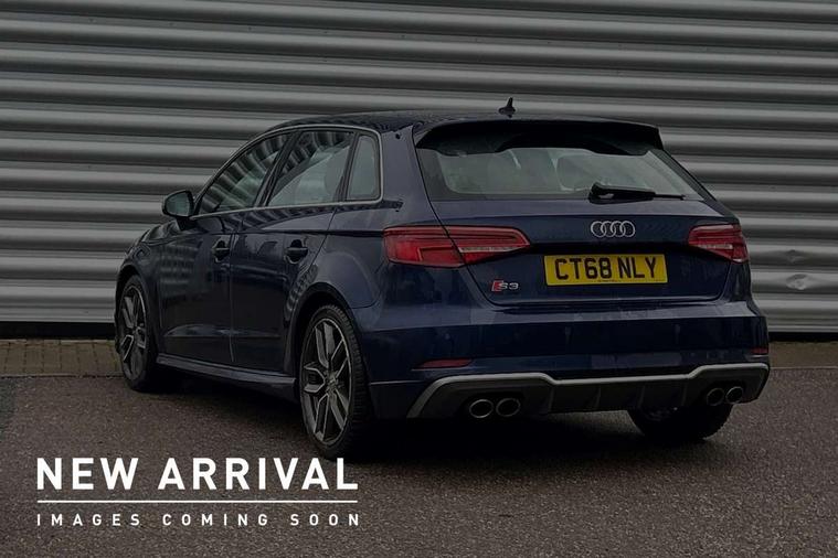 Audi connect, Audi drive select, Audi smartphone interface, Automatic start/stop system, Colour driver's information system display, Instrument dials with S3 logo, Mobile telephone preparation - bluetooth interface, Progressive power assisted steering, SD card based satellite navigation system, Service interval indicator, Speed limit display, Voice control system, Voice recognition for navigation system, S sports suspension, 2 USB interfaces and Aux-In jack, Audi music interface, CD player, DAB Digital radio, MMI radio plus with 7" colour MMI screen and MMI controller, Aluminium door mirror housings, Aluminium window trim, Audi Beam uses LEDs to project the Audi Sport logo, Auto dimming rear view mirror with light and rain sensors, Electric front windows, Electric rear windows, Electrically adjustable and heated door mirrors with integrated LED side indicators, Headlight washers, Heated windscreen washer jets, LED daytime running lights, Matt black radiator grille, Rear wiper, S body styling with front bumper 'S' specific air intake grille, rear diffuser with platinum grey insert, roof spoiler, Sport specific side air inlet grille and diffuser insert, Twin oval chrome trimmed exhaust tailpipes, 3 adjustable rear headrests, 4 lashing points to secure luggage, Adjustable front centre armrest, Black cloth headlining, Dual zone electronic climate control, Front and rear interior lights with delay, Front/rear floor mats, Glovebox light, Height and reach adjustable steering wheel, Illuminated door sill trims with S logo, Isofix child seat preparation for front passenger/outer rear seats inc passenger airbag deactivation, Stainless steel pedals, Storage compartments in doors side trims, centre console and under front drivers seat, LED interior light pack - A3/RS3, Non smoking pack - A3, Storage and luggage pack - A3/RS3, 3 point seatbelts on all seats, ABS/EBD, Active bonnet, Active front headrests, Airbags - front driver/passenger, front & rear side, curtain, drivers knee, ASR, EDL, Electromechanical parking brake, ESC - Electronic Stability Control + traction control, Front passenger airbag deactivation, Hill hold assist, Manual rear child locks, Multi-Collision braking, Seatbelt warning, Tyre pressure warning, Warning triangle and first aid kit, Anti theft alarm, Anti-theft wheel bolts, Remote control central locking, Thatcham category 1 alarm + immobiliser, Aluminium air vent surrounds, Aluminium trim elements, Matt brushed aluminium inlays, Tool kit, Tyre repair kit,