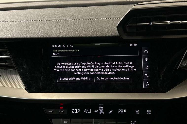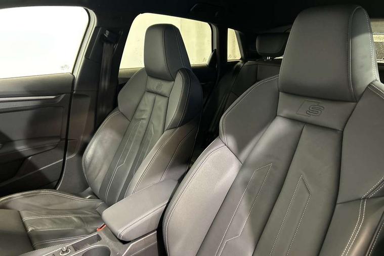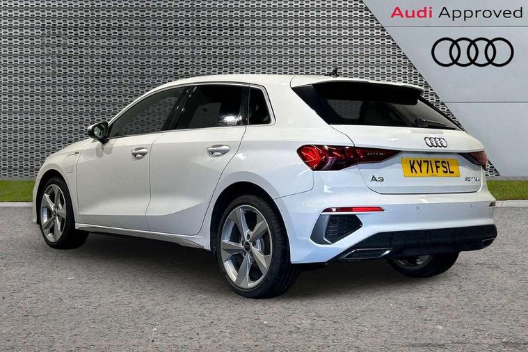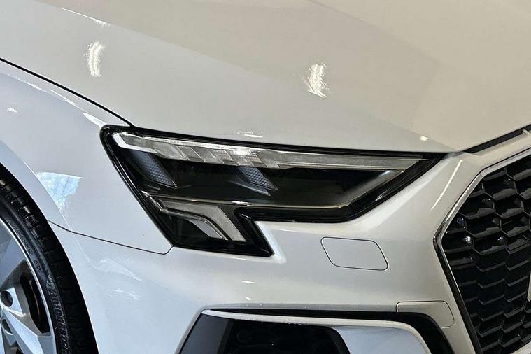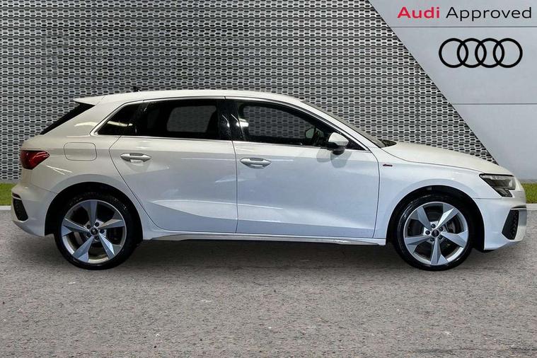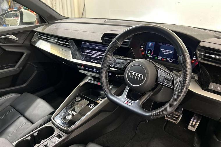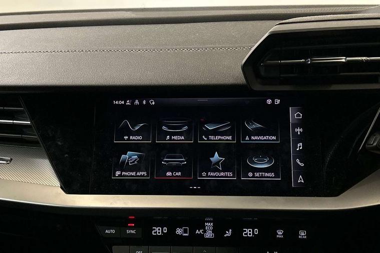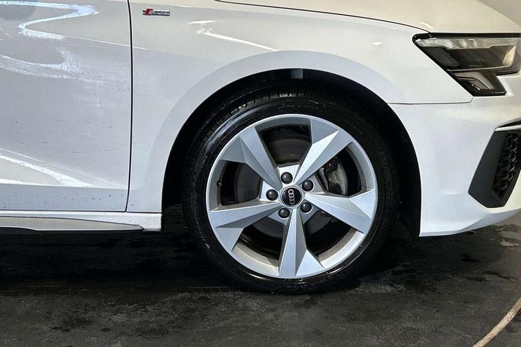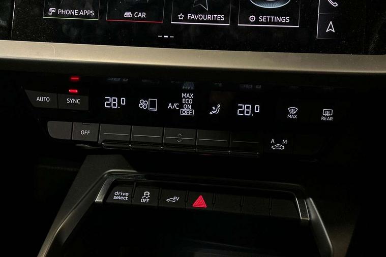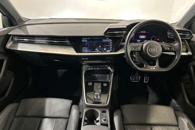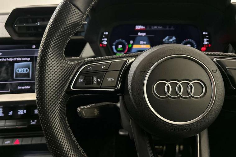 Audi connect emergency call and service, Audi drive select (Auto, Comfort, Dynamic, Efficiency and Individual), Audi smartphone interface, Audi Virtual Cockpit - 10.25" digital and colour instrument cluster, Automatic start/stop system with recuperation, Bluetooth interface, Collision avoidance assistant, Electromechanical power speed sensitive steering, Lane departure warning system, MMI Navigation Plus with high resolution 10.1" colour touch screen display, Service indicator, Trip computer, Voice control system with natural language interaction, 3 pin 10 amp domestic charging cable, Type 2 mode 3 32 amp charging cable, Type 2 socket for AC charging, 2xUSB-C connection with data and charging functions, 6 passive loudspeakers, DAB Digital radio, 3rd brake light, Acoustic glass windscreen, Aluminium window trim, Auto dimming frameless rear view mirror, Electrically adjustable/heated/folding/auto dimming door mirrors with integrated LED indications + kerb view function for passenger side, Front electric windows, Illuminated aluminium inserts front door sills with S logo, LED daytime running lights, LED headlights with LED rear lights and dynamic rear indicators, Light and rain sensors, Privacy glass - dark tinted rear window, rear door and side windows, Rear electric windows, Rear side air outlets in grained matt black, Rear wiper, S line bumpers, S roof spoiler, 12V socket and storage compartment in front centre console, 40/20/40 split folding rear seat bench with cupholder, Black cloth headlining, Dual zone electronic climate control, Front and rear centre armrest in leather, Front and rear headrests, Front/rear floor mats, Height and reach adjustable steering wheel, Interior lighting - glove compartment light and right hand side, Luggage compartment floor covering, Manual boot compartment lid, Manually adjustable front seats, Seat side bolsters, Stainless steel pedals and front footrest, Twin leather upholstery with front sports seats S embossed logo, Aluminium interior elements pack - A3 Sportback, S line styling pack - A3 Sportback, 3x3 point rear seat belts, Driver and front passenger airbag with passenger airbag deactivation, Electronic Stabilisation Control (ESC) including ABS, ASR and EDL, First aid kit with warning triangle and 2 safety vests, Front side airbags with head airbags and interaction airbag, Hill hold assist, Pre-sense front with pedestrian and cyclist detection, Seatbelt monitoring, Tyre pressure loss indicator, Anti theft alarm, Anti-theft wheel bolts, Electronically operated child lock, Immobiliser, Remote control central locking, Accent surfaces in the dashboard and centre console in platinum grey silk effect paint finish, Dark spectrum aluminium inlays, Tool kit, Tyre repair kit,