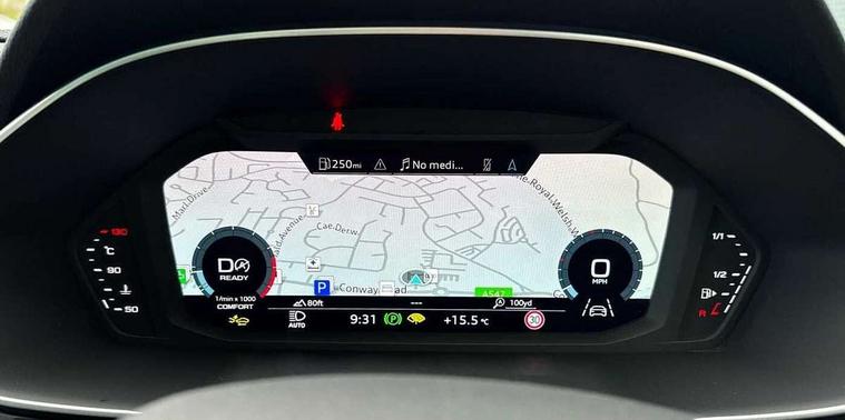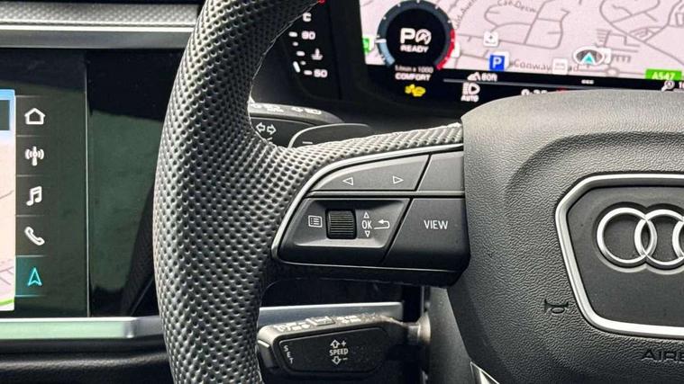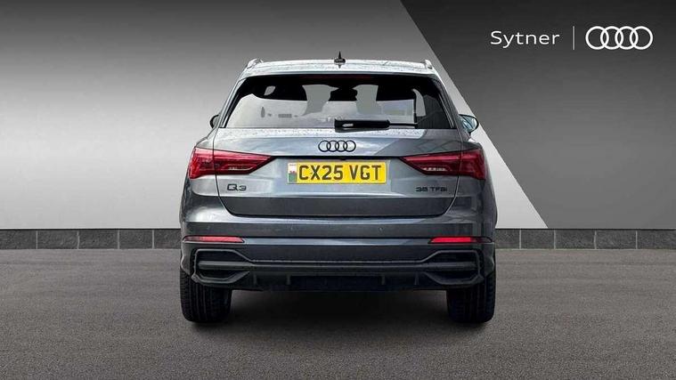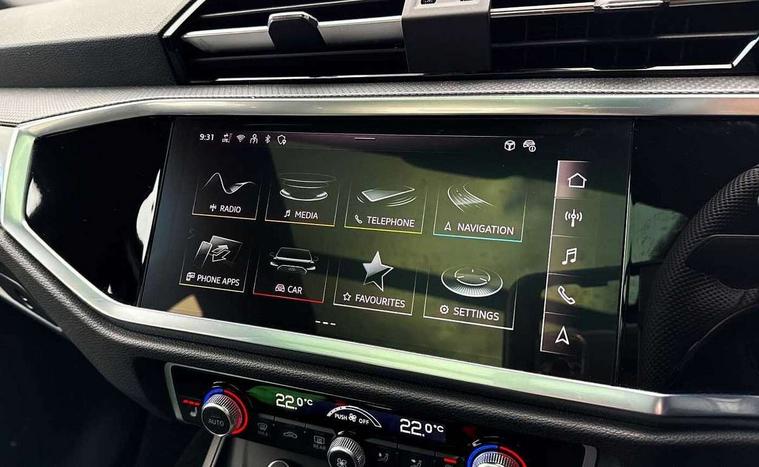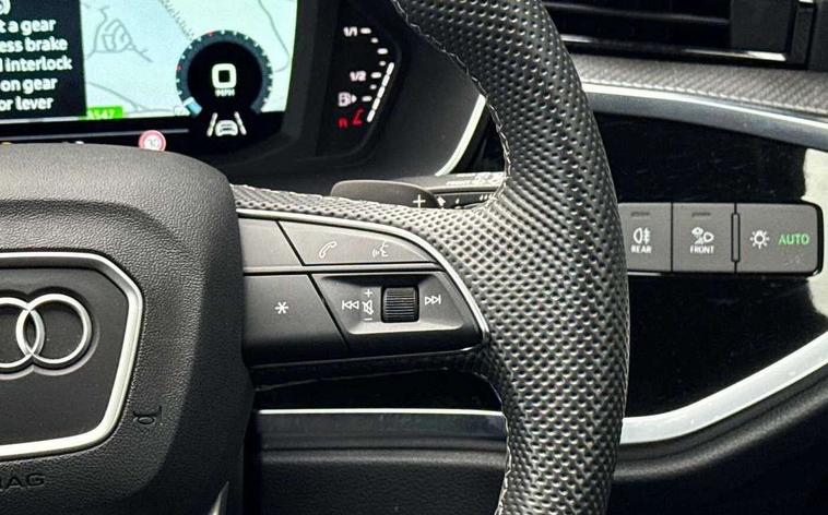 Amazon alexa Integration, Audi connect safety and service, Audi drive select, Audi lane departure warning, Audi Virtual Cockpit - 10.25" display, Bluetooth interface, Camera based traffic sign recognition, Distraction and Fatigue warning, Legal emergency call, MMI Navigation Plus with high resolution 10.1 inch touchscreen colour display, Power operated tailgate, Progressive steering, Service interval indicator, Smartphone interface includes wireless Apple carplay/Android Auto, Start stop system with recuperation, Voice control system with natural language interaction, Sports suspension, 2 USB-C ports with charge and data functions, 6 passive loudspeakers, DAB digital radio module, Acoustic windscreen, Audi Beam uses LEDs to project the Audi logo onto the ground as you exit your Q3, Auto dimming door mirrors, Auto dimming frameless rear view mirror, Black roof rails, Electrically folding, adjustable and heated door mirrors with integrated LED side indicators and kerb view function for passenger side, Front and rear electric windows, Front fog lights, Grille vertical bars in aluminium silver/Matt, High gloss black finish B and C pillars, LED Dynamic rear indicators, LED headlights with LED daytime running lights, LED rear lights, LED third brake light, Privacy glass dark tinted rear and rear-side windows (from B-pillar backwards), Rain and light sensors, Rear diffuser grille in grained matt black, Rear diffuser strip in matt anthracite black, Rear side wing doors, Rear wiper, S line bumpers in contrasting Manhattan grey, Variable front intermittent wipers, 12V socket in rear centre console, 3 seat bench in 2nd row, 40:20:40 folding with manual adjustment for 60:40 forwards/backwards position and backrest angle, Adjustable rear seat bench/backrest with centre armrest and cupholder, Black cloth headlining, Dual zone electronic climate control, Electric lumbar support, Front and rear black floor mats with contrast stitching in rock grey, Front and rear headrests, Front centre armrest, Height and reach adjustable steering wheel, Illuminated door sill trims with S logo, ISOFIX child seat mounting for front passenger with airbag deactivation and outer rear seat including top tether attachment point for outer rear seats, Manual front seats with height adjustment, Perforated leather gearknob, Single front passenger seat, Stainless steel luggage compartment sill finisher, Stainless steel pedals, Twin leather upholstery with front sport seats + S embossing, Black styling pack - Q3, Non smoking pack - Q3, 3x3 point rear seatbelts, 6 airbags - Driver, front passenger, curtain and side windows, Audi pre-sense front with pedestrain and cyclist recognition, Electrically operated child locks on rear doors, Electromechanical parking brake, Electronic stabilisation control including ABS, ASR and EDL, Front seatbelt reminder, Hill descent control, Hill hold assist, Pre sense basic, Seatbelt monitoring, Tyre pressure warning, Warning triangle and first aid kit, Anti theft wheel bolts, Immobiliser, Remote central locking, Thatcham approved category 1 anti theft alarm, Aluminium look interior elements, Detail dashboard around MMI touch colour display in glass look, black with surround in aluminium look, Leatherette door armrest, Piano black inlay,