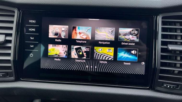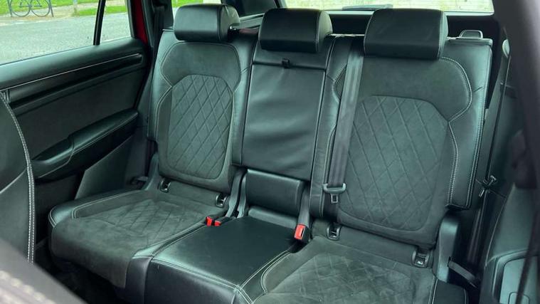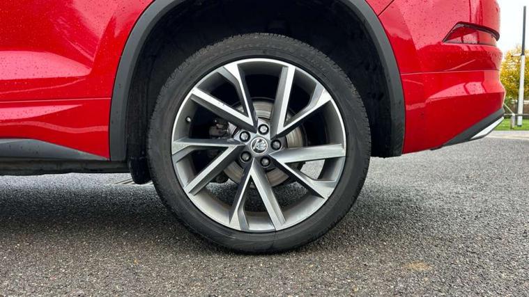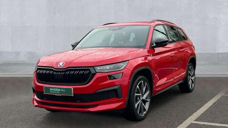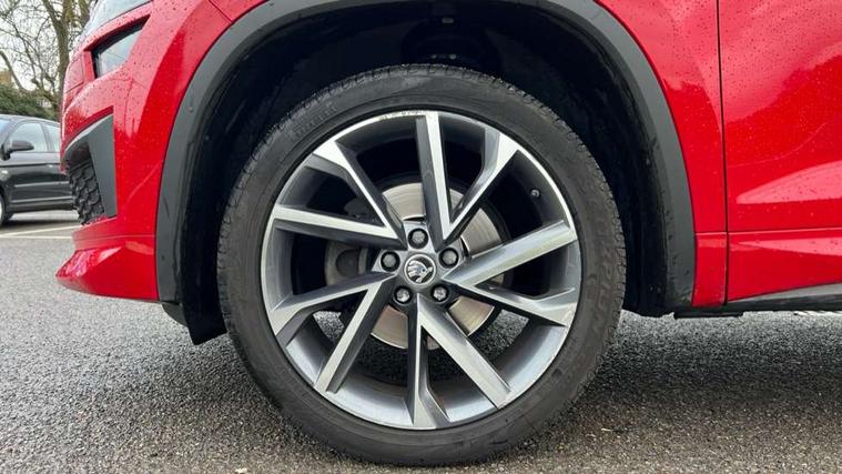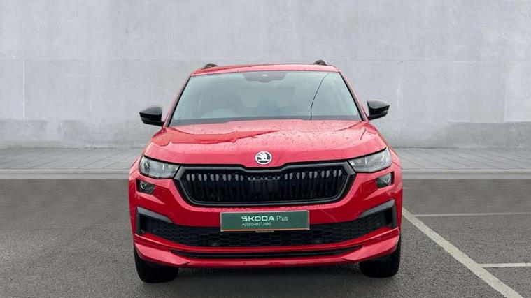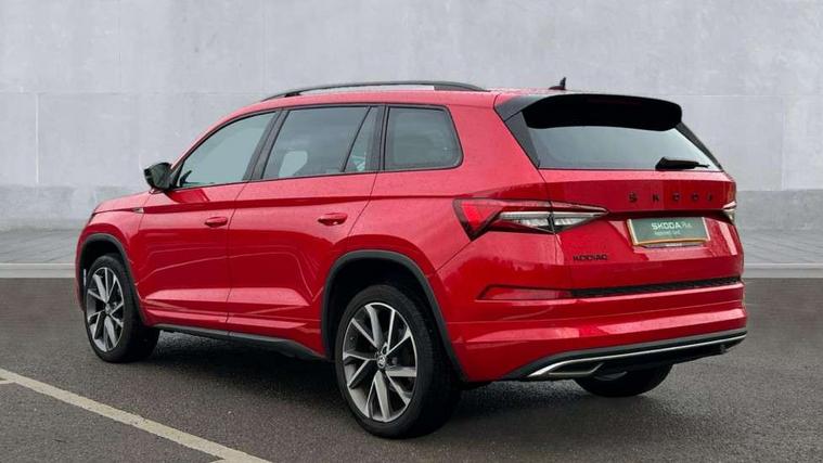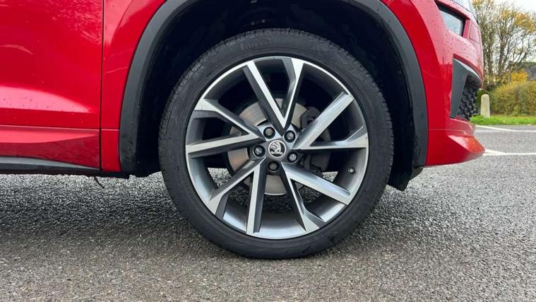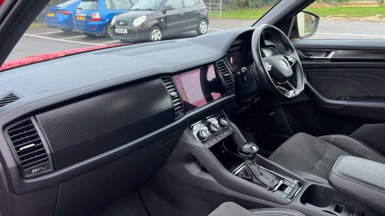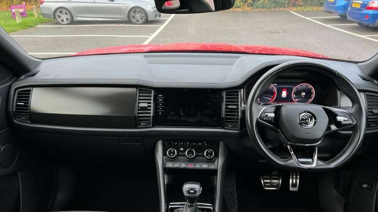Bluetooth system, Columbus satellite navigation with 9.2" touchscreen, integrated Wi-Fi, web radio, E-call, ECO Stop/start function, Exterior temperature indicator, Progressive steering, Rear view camera, Smartlink wireless for apple carplay and wired for android auto, Speed limiter, Tailgate unlocking from outside, USB C Port x 2 in front centre console, Wireless charging, 8 Speakers, DAB Digital radio, Aero front windscreen wipers with intermittent function, Aero rear window wiper, Auto dimming rear view mirror, Black roof rails, Black sports styling including front grille and window surrounds, Black wheel arch surrounds, Body colour bumpers, Body colour door handles, Electric adjustable/heated/folding door mirrors, driver side auto dimming with boarding sports and memory function, Electric front and rear windows, Extended rear spoiler with finlets in gloss black, Front fog lights, Full LED matrix headlights with AFS (adaptive front light system), cornering function and AWL (all weather lighting system), Gloss black door mirrors, Headlight washers, Heated rear window, Invisible tailpipe, LED daytime running lights, LED rear fog light, LED third brake light in rear spoiler, Light assistant (coming/leaving home/tunnel light), Off-road style lower front bumper element, Privacy glass, Rain and light sensors, Rear diffuser, Rear LED lights (high functionality) with welcome effect and dynamic indicators, Rear side wing doors, Safety reflectors on front and rear doors, Sportline badge on front fender, Sports front and rear bumpers including lower rear chrome strip, Tailgate lettering in Black, Window control switches with black trim, 12V socket in boot, 2 rails with 2 hooks, 2 seat bench in 3rd row, 3 seat bench in 2nd row, 4 foldable roof handles with rear coat hooks, 60:40 foldable rear seat with sliding adjustment and backrest angle adjustment, Aluminium pedals, Black roof headlining, Bottle holders in door panel in the 1.5 litre front and 1 litre rear, Cargo storage compartments, Chrome headlight control button, Chrome interior door handles, Coat hooks on B pillar, Covered storage compartment on driver side, Decorative door sills in the front and rear, Front centre armrest with storage compartment, cup holder and 12V socket, Front courtesy lights, Gear shift lever with chrome frame and black gloss insert, Grey stitching in front and rear armrests and door armrests + door inserts, Height adjustable front headrests, Illuminated and cooled glovebox, Illuminated luggage compartment, Isofix child seat fittings in outer rear seats with top tether, Manually adjustable steering column, Microsuede door panels, Net programme in boot (1x horizontal Net, 2x vertical Nets), Overhead glasses storage compartment, Pollen filter, Rear centre armrest with cupholders, Single front passenger seat, Sliding trunk cover, Small Bags on the inner sides of the front backrests, Sports seats, Sunvisors with illuminated vanity mirrors, Three rear height adjustable headrests, Ticket holder on A Pillar, Umbrella in door panel, Variable boot floor, LED Interior light pack - Kodiaq, Auto door release and activation of warning lights in the event of an accident, Child locks on rear doors, Driver and front passenger airbag with knee airbag and front passenger airbag deactivation, Electronic parking brake with hill start assist, Emergency rear braking signal, ESC (incl. ABS+MSR+ASR+EDS+HBA+DSR+RBS+MKB), Front assist with autonomous emergency braking, Front side airbags with curtain airbags, Fuel cut off safety device, Height adjustable front 3 point seatbelts + pretensioners, Hill hold control, Rear disc brakes, Safety vest holder in door, Seat belt reminder for all seats, Three point rear seat belts, Two tone horn, Tyre pressure monitor, Alarm with interior monitoring and tilt sensor with safe function, Anti-theft wheel bolts, Immobiliser, Keyless entry and start system (KESSY), Remote central locking with 2 keys, Black air vent surround, Carbon finish dashboard and door inserts, Grey stitching in dashboard, 20" Vega Anthracite alloy wheels, Temporary spare wheel (space saver),