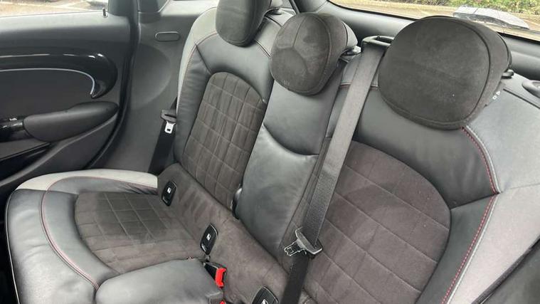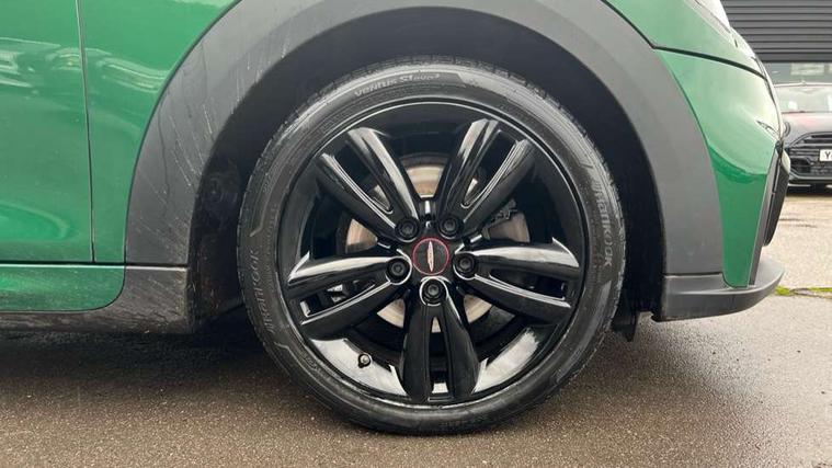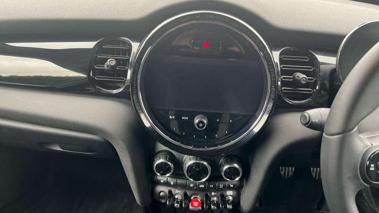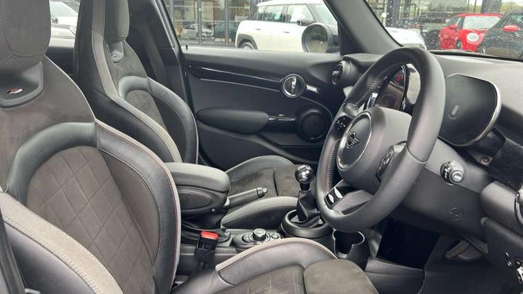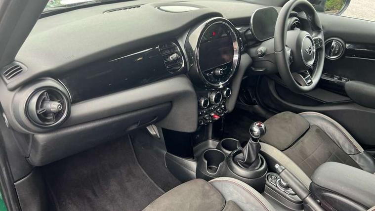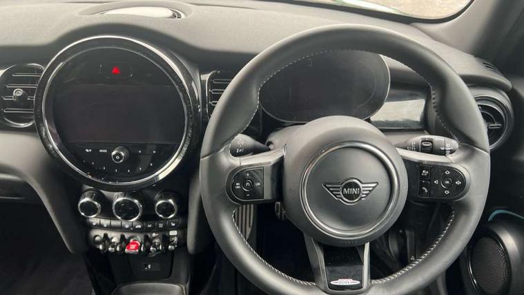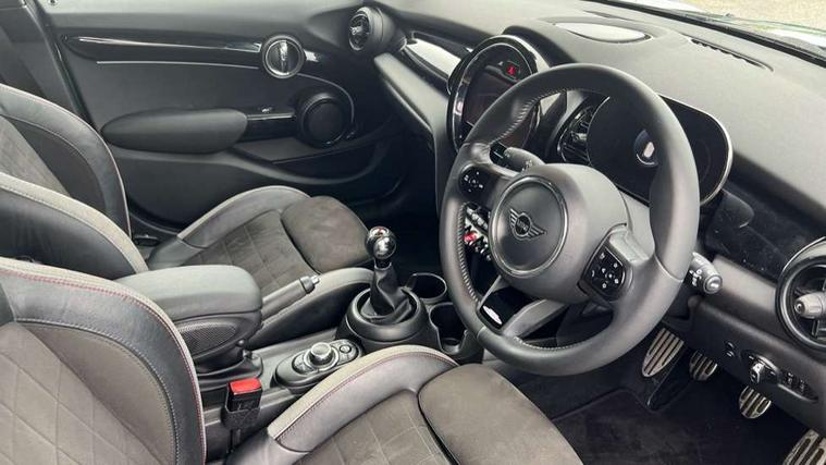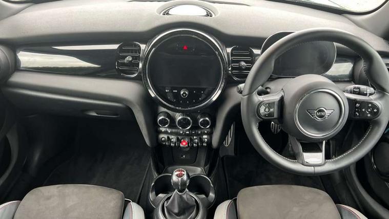 Automatic start/stop function with brake energy recuperation, Compatible mobile phone bluetooth with audio streaming, Cruise control with brake assist, Electro-mechanical speed dependant steering assistance, Flexible car sharing preparation, Instrument cluster, MINI Driving Modes - centre toggle switch to control driving setting (sport, mid and green), Mini E-call, MINI TeleServices, On board computer, Rear park distance control, Service interval indicator, 6 Speed manual transmission including gear change indicator display, Adaptive suspension, Double Vanos system, Fully variable valve control, High precision injection, Performance Control, 6 speakers in front door trims and underneath front seats, 8.8" touchscreen with LED ring, FM tuner and DAB digital radio, Automatic headlight activation switch, Body colour fuel filler cap, Chrome border high gloss black slats radiator grille, Dynamic brake lights, Electric front+rear windows, Exhaust tailpipe on left with chrome finisher, Heated rear window, Heated windscreen washer jets, JCW Aerodynamic kit - Front and rear bumpers with sporty JCW styling and part-painted side sills with MINI John Cooper Works door sill finishers, John Cooper Works rear spoiler, LED headlight with closed ring and daytime driving lights, Metal door sill strips with MINI imprint, Model logo Cooper on right of tailgate, Rain sensor window wipers, Rear fog lights, Rear LED lights with union jack design, Rear window wiper, Side scuttle panel with integrated indicator, Sun/heat protection glass, White indicator lenses, 12V Accessory socket in centre console, 4 lashing eyes in luggage compartment, 60/40 split folding rear seat, Anthracite headliner including grab handles and clothes hooks, Carbon black colour line - Knee roll and door armrest, Chrome interior highlights, Cupholders, Front and rear isofix with front passenger airbag deactivation, Glove compartment, Height and length steering column adjustment, Interior lighting with 12 different colours across the dashboard, underneath door bezel with illuminated laser-engraved design on central display, JCW Sport seats with integrated headrests, adjustable thigh support and John Cooper Works logo, Leatherette gearshift lever and handbrake gaiters, LED reading lights, vanity mirror lights, front foot well light and spotlight on front seats, Manual air conditioning, Mechanical seat adjustment - forward/back & backrest for front seats and driver seat height adjust, Multifunction steering wheel, Storage compartments in doors, Sunvisors with vanity mirrors, Velour floor mats, Walknappa leather steering wheel with grey seam and John Cooper Works badge on Piano Black lower steering wheel spoke, Piano black exterior pack - Mini Hatchback Cooper, 3 point seatbelts on all five seats, 6 Airbags - front, side, head and seat belt tensioners, Anti-lock braking system (ABS), DSC - Dynamic Stability Control, Front and rear disc brakes, Hill start assist, Single tone fanfare horn, Tyre pressure monitoring system, Alarm system with tilt sensor, monitoring doors, bonnet interior and tailgate, Electronic vehicle immobiliser, Start/stop toggle with keyless go, Piano black interior trim, Tool kit,