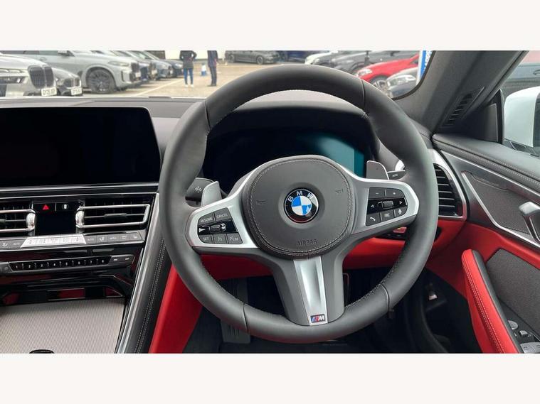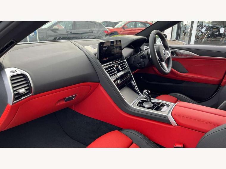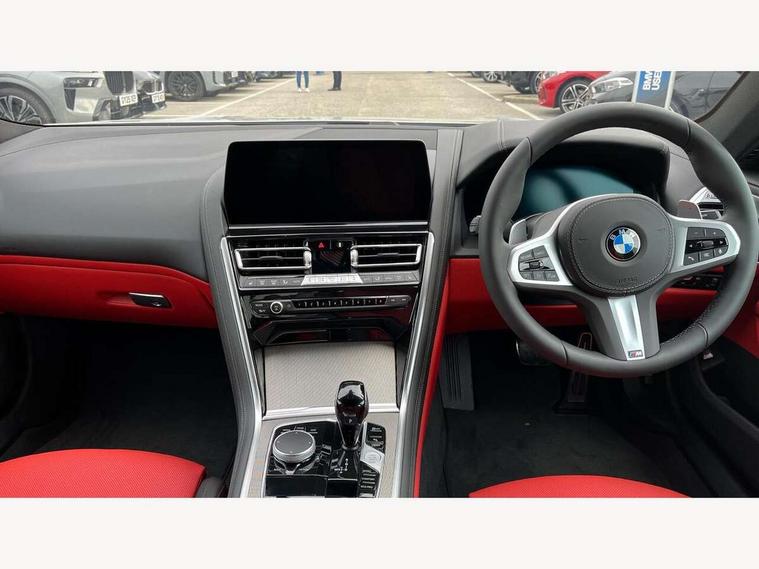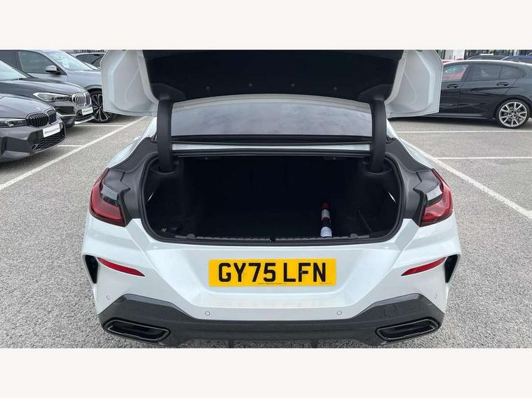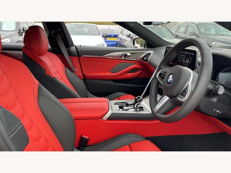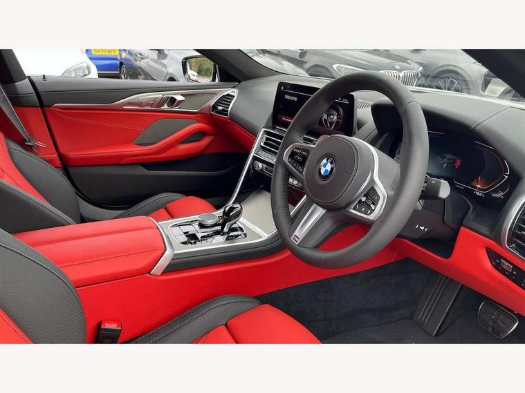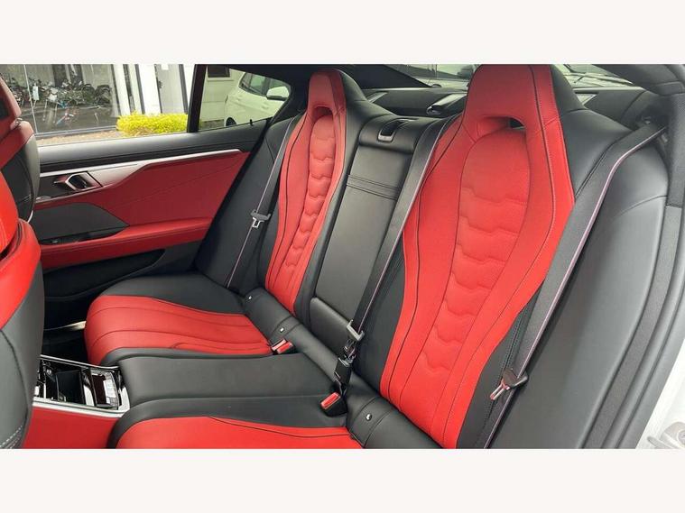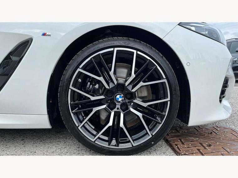 Automatic tailgate operation, remote opening with key, closing by tailgate button or remote control including tailgate in LED technology, Bluetooth hands free facility with USB audio interface, voice control and enhanced bluetooth + Wireless charging, BMW ConnectedDrive online services, BMW legal emergency call, BMW Live cockpit professional with 12.3" instrument display, BMW Teleservices, Brake pad wear indicator, Check control system, Condition based service, Drive experience control with Sport, Comfort, Eco Pro and Adaptive modes, Electric bootlid, Engine start/stop button, Head up Display, iDrive controller with shortcut buttons, Integrated owners handbook, Light on warning, Oil sensor for level and grade, On board computer, Outside temperature display, Service interval indicator, Servotronic system, Wi-Fi hotspot, Adaptive M suspension, Double wishbone front axle, Dynamic Damper Control, Eight speed sport automatic transmission, M Sport differential, Petrol Particulate Filter, Sport exhaust system, DAB Digital radio, Favourite buttons, Automatic windscreen wipers and automatic headlight, Carbon core, Climate comfort windscreen, Daytime driving lights front and rear active, Dynamic brake lights, Exterior mirrors - Floating design mirror, electric adjust/heated/folding, aspherical, Follow me home headlight function, Frameless interior mirror, Front and rear bumper system with replaceable deformation elements, Front electric windows, Front ornamental grille with kidney grille bars, Heat protection, sun protection glazing, Heated rear window, glass, Heated windscreen washer jets, High beam assistant, Illuminated door handles, Illuminated radiator grille iconic glow, LED rear lights, Model logo - right tailgate in chrome, M emblem on side panel in light chrome, badge on bonnet and tailgate, Rain sensor and automatic driving lights control, Rear boot, Rear side wing doors, Side window graphic in black high gloss, Sun protection glass, Thermally insulated windscreen, Third LED technology brake light in rear window, Welcome lights in interior and door handle area, 1 x 12V power socket in front centre console, 2 cup holders in front, 2 rear head restraints, 3 spoke M sport leather multifunction steering wheel with shift paddle, 4 zone control automatic air conditioning, 5 seats, 50/50 split folding rear seat, Ambient light with dynamic interior light, BMW ID, Front and rear seat heating, Front door pockets, Front entry lights doors, Front reading lights, Front sun visors with ticket holder and illuminated mirror, Interior lighting - Interior light front centre above interior mirror, luggage compartment light, automatic interior light system soft on/soft off, Lashing eyelets, Lockable glove compartment with light, Microfilter and active carbon filter, Steering column with adjustable height and length and activation via control on the steering column, Storage compartment under front centre armrest with light, 1 x 12V power socket and USB, Through loading function, Connected professional pack - 8 Series, M sport exterior styling aerodynamics pack - 8 Series, 3x3 point rear seatbelts, ABS/EBD, Active protection, Airbags - Driver and front passenger airbag with seat occupancy detection, knee, side and front passenger seat airbag deactivation, Brake discs, compound structure, Child locks on rear doors, Cornering brake control (CBC), Crash sensor activating central locking release, hazard warning lights, fuel cut off, interior lighting, safety battery terminal clamp and airbags, DSC - Dynamic Stability Control, Dynamic brake control, Dynamic Traction Control - DTC, Electromechanical parking brake with automatic drive away release and auto hold function, Front three point with pyrotechnical belt latch tensioner seat belts, belt force limiter and belt stopper, Head airbags for 1st and 2nd seat row, Hill start assist, Integrated brake system, ISOFIX child seat mounting for the two outer rear seats, Rear three point with pyrotechnical belt latch tensioner seat belts and belt force limiter, Side impact protection, Tyre pressure monitoring system (TPMS), Warning triangle and first aid kit, Alarm system (Thatcham 1) with electronic engine immobiliser, Centre lock switch, Closing system with central locking, Comfort access system, Locking wheel bolts, Vehicle key with exclusive M designation, Instrument and upper door panel in black walknappa leather with contrast stitching,