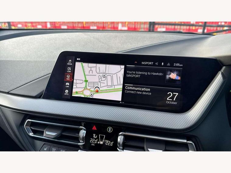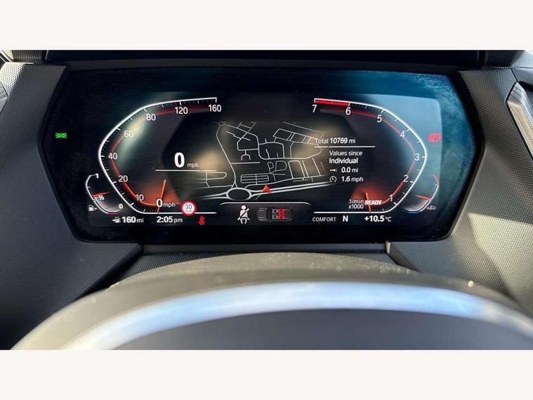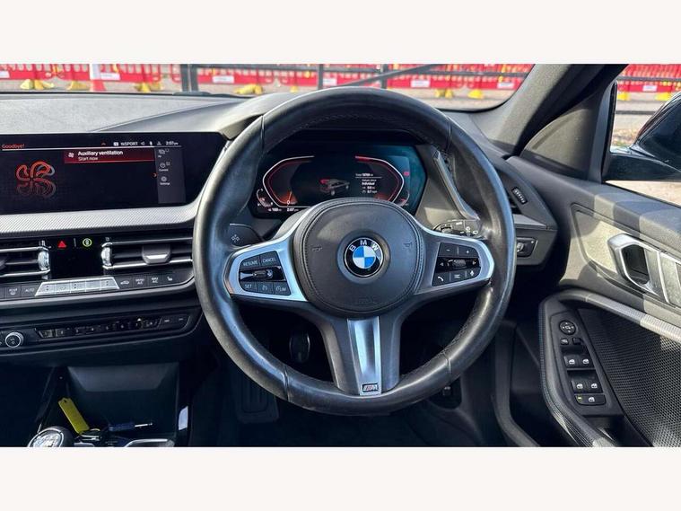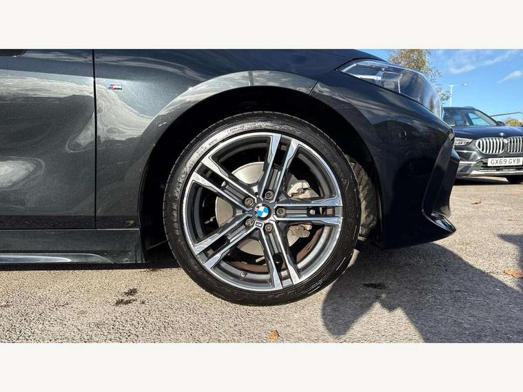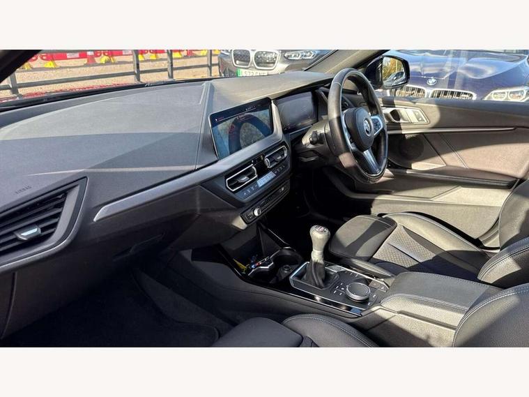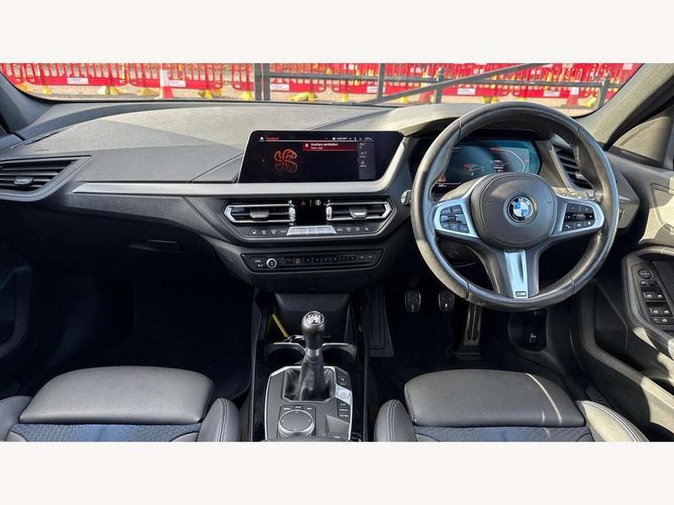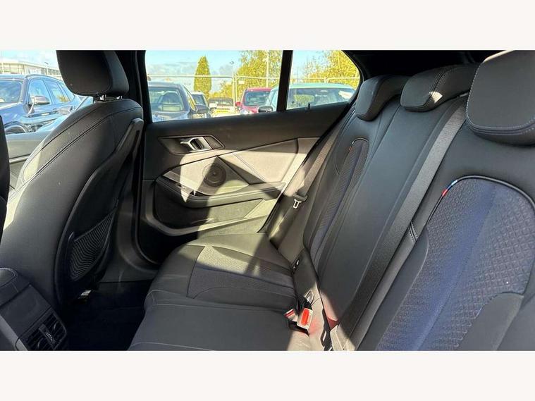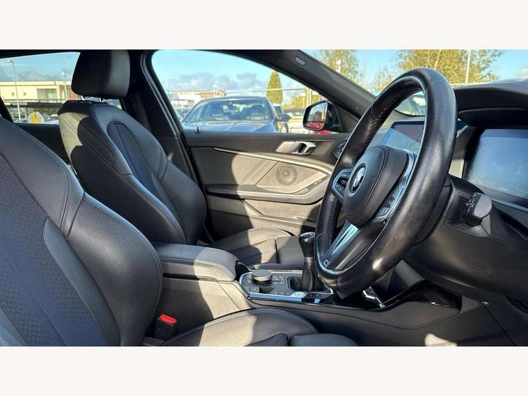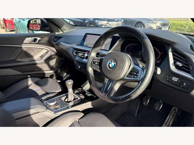 Active guard plus, Attentiveness assist, BMW ConnectedDrive online services, BMW Teleservices, Check Control warning system for monitoring of lights and door/luggage compartment open warning, Cruise control with brake assist, Eco pro mode, Front axle single joint with specific axle kinematics to minimise drive influences on steering + provide increased rigidity agile driving behaviour, Integrated owners handbook, Lane departure warning system, Oil sensor for level and grade, On board computer, Optimum shift indicator, Personal Profile, Pull away assistant, Rigidly mounted rear subframe - Multi link construction with separate spring / damper configuration and excellent driving characteristics, Speed limit Info including no-overtaking indicator, Speed limiter, Aluminium lightweight construction, Anti roll bar front and rear, Balancer shaft, Double VANOS twin scroll turbocharging system, Drive Performance Control, Electronic differential lock, High precision injection, M sport suspension, Petrol Particulate Filter, Twin tube gas filled shock absorbers with degressive characteristic curve, VALVETRONIC engine management, DAB Digital radio, Auto dimming rear view mirror, Automatic headlight beam throw control, Automatic windscreen wipers and automatic headlight, Body colour door handles, Body colour mirror caps, Body colour roof trims, Chrome 'M' logo side designation, Chrome exhaust twin tailpipes round 90mm in left, Chrome kidney grille frame with Satin Aluminium struts, Direction indicator side lights in exterior mirrors, Fading support, Folding side mirrors with auto dimming/folding wing mirrors with auto dimming, Follow me home headlights, Front and rear bumper system with replaceable deformation elements, Front and rear electric windows with open and close fingertip control, anti trap facility and comfort closing, Front door sill finishers in black plastic with M designation in metallic look, Green tinted heat protection glazing, Heated, electrically adjustable exterior mirror aspheric on driver side, convex on passenger side, High gloss shadowline window frame, Recess cover mirror frames and B/C pillar embelisher trim, High level third brake light, Integrated front windscreen with washer jets, LED daytime running lights, LED eyebrow turn indicators, LED front fog lights, LED Headlights, Lightweight engineering, Matt black air guide grilles, Matt black wheel arch trim, Model designation on electric bootlid, Nearside reverse light in rear light cluster, Preparation for high beam assistant, Rear fog lights, Rear side wing doors, Rear window wiper, Shark fin antenna, Trailer stabilisation logic, Visible VIN plate, Welcome lighting, 12V power socket in front centre console with blanking plug, 3 rear seat head restraints, 3 seat bench in 2nd row, 3 spoke sports leather steering wheel in black leather with black stitching and decorative finisher in pearl chrome, specific M badge + leather knob, Anthracite headlining, Black boot net with lashing eyes, Cargo function on 2nd seat row, Child seat ISOFIX attachment for two outer rear seats and front passenger seat with anchorage points, Conditioned based service, Driver and front passenger seat heating, Folding rear clothes hook, Four grab handles integrated in roof lining, Front and rear door pockets with bottle holders, Front and rear side armrest integrated into door trim, Front armrest, Front sports seats, Gearshift lever with M designation, Glove compartment, Height adjustable front head restraints, Luggage compartment for bag hooks on left and right, foldable luggage compartment liner and four lashing eyelets, Manual adjust steering wheel, Multi-function controls for steering wheel, Single front passenger seat, Storage compartment in centre console, Sun visors with vanity mirrors and insert tab, Two front centre console cupholders, Two zone automatic air conditioning, Velour floor mats, Additional interior lighting pack - 1 Series, BMW live cockpit professional pack- 1 Series, Connected pack professional - 1 Series, Interior lights pack - 1 Series, M Sport exterior styling aerodynamics pack - 1 Series, 2 tone horn, 3 point seatbelts on all seats, front pyrotechnic belt tensioners, stopper and belt force limiters, rear coded belt buckles, Airbags - Front driver/passenger, front and rear curtain head protection, front side, manual deactivation of front passenger airbag, Anti lock braking system (ABS) with brake assist, BMW emergency call, Brake drying, Braking readiness, Child proof locking system in rear door, City braking function, Comfort modes, Cornering brake control, Crash sensor activating central locking release, hazard warning lights, fuel cut off, interior lighting + activation of safety battery terminal clamp, Driver and front passenger seat belt security check, Dynamic stability control + (DSC+), Dynamic Traction Control - DTC, Electrically operated hand brake, Front and rear disc brakes, Seatbelt warning, Side impact protection, Tyre pressure monitoring system, Warning triangle and first aid kit, Central locking switch for all doors, fuel filler cap and luggage compartment, Deadlocking function system to all doors, Drive away locking system on all doors and luggage compartment with de-activated in iDrive settings, Locking wheel bolts, Remote control with integrated key with High-gloss Black inlay and M designation and 1 button for open/ close lock, window, open luggage compartment, Start/stop button illuminated in centre console with keyless engine start and auto start stop deactivation button, Thatcham Cat.1 alarm and immobiliser, Wheel slip limitation close to the actuator (ARB), Contrast stitching on instrument panel, Electrically powered 12V compressor, Reduced rolling resistance tyres,