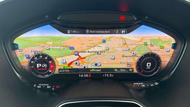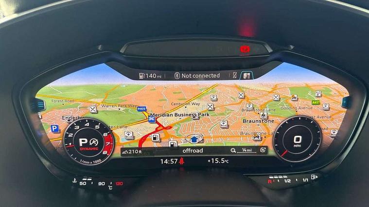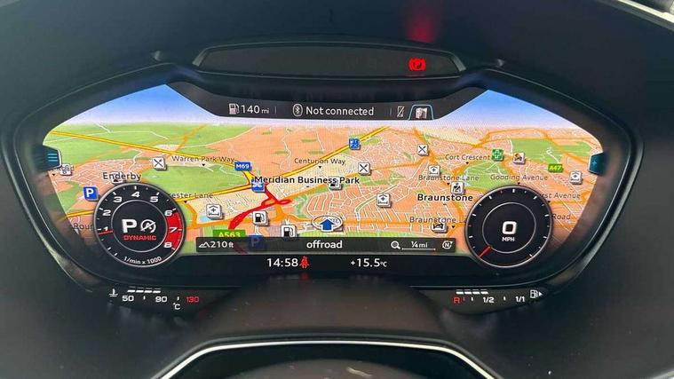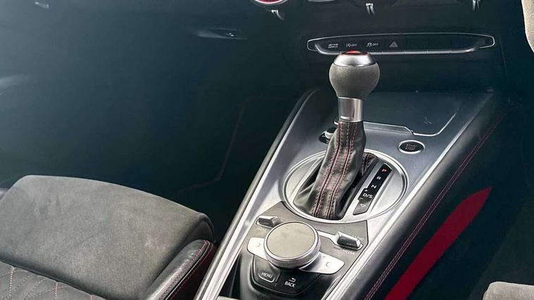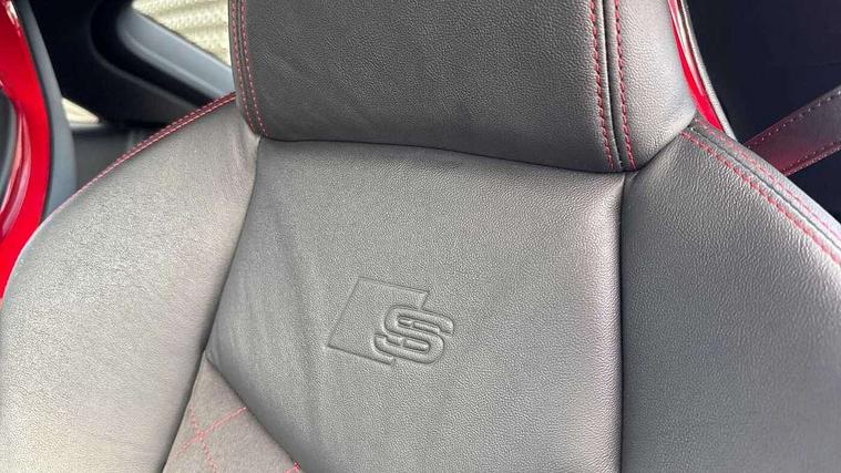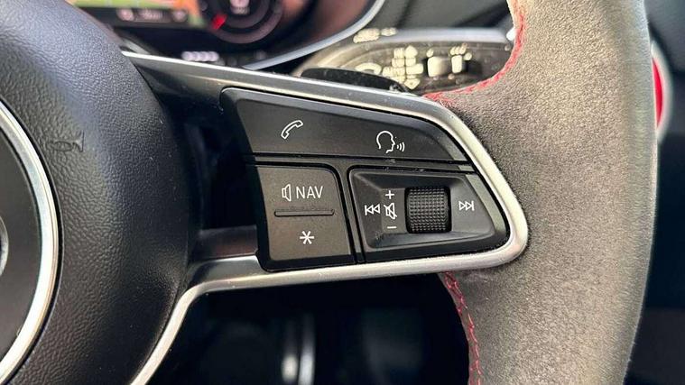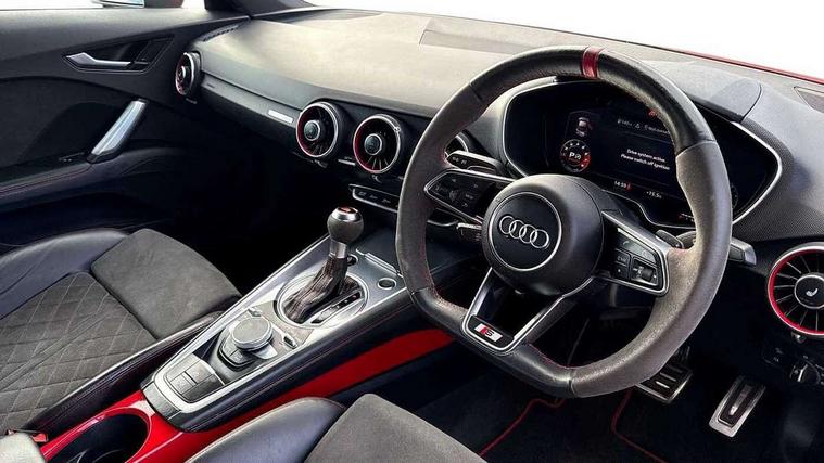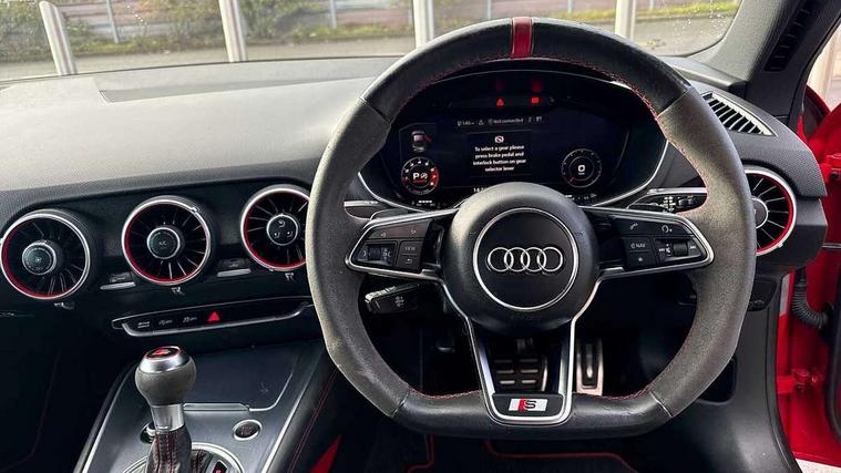Audi drive select with 4 Pre configured modes, Audi smartphone interface, Audi virtual cockpit - 12.3" high-resolution LCD display with fully customisable instrument cluster, Cruise control + speed limiter, Emergency call service, Mobile phone preparation with bluetooth interface, Progressive power assisted steering, Rear parking sensors, Service interval indicator, Start/Stop system with energy recuperation, TP memo, Sports suspension, 8 Speakers, AM/FM radio, Bluetooth audio streaming, DAB Digital radio, Audi Beam uses LEDs to project the Audi Sport logo, Audi rings decals, Auto dimming rear view mirror, Auto headlight range control, Black chrome tailpipe, Black door mirrors, Dark privacy glass from B-pillar backwards, Electric folding door mirrors, Electric front windows, Electrically adjustable and heated door mirrors with integrated LED side indicators, Heat insulating glass in windshield, Heat reflecting windows, LED 3rd brake light, LED daytime running lights, LED headlights with LED rear lights + dynamic rear indicators, Light and rain sensors, Rear boot, 12V socket, 2 rear seats, 3 spoke flat bottomed high multi-function leather sport steering wheel with gearshift paddles, 4 way electric lumbar support for driver and front passenger, Alcantara leather with 12o'clock marker and express red contrast stitching in steering wheel, Alcantara/leather upholstery with S embossing + contrasting express red stitching on upholstery, Steering wheel and gear knob gaiter, Black headlining, Door sill trims, Extended aluminium look with stainless steel pedals, Front centre armrest, Front passenger seat, Front super sports seats, Heated front seats, Integrated head restraints, ISOFIX child seat mounting for front passenger seat with airbag deactivation, Manual adjustment of seat height, fore/aft position, seat angle, seat depth and backrest angle, Rear head restraints, Rear top tether child seat ISOFIX attachment, Red piped floor mats, Split folding rear seat, Black styling package - TT, Leather pack - TT, LED interior light pack - TT/TTS, Non smoking pack - TT/TT RS, Technology pack without Audi phone box - TT, 3 point front seat belts, ABS, ASR traction control, Curtain airbags, Driver and front passenger airbag with front passenger airbag deactivation, EDL traction control, Electromechanical parking brake, ESP, First aid kit, Front side airbags, Head airbags, Hill hold assist, Red brake callipers, Seatbelt warning, Tyre pressure loss indicator, Warning triangle, Anti theft alarm, Anti theft wheel bolts, Immobiliser, Keyless Go, Remote central locking, Matt brushed aluminium inlays, Tool kit, Tyre repair kit,